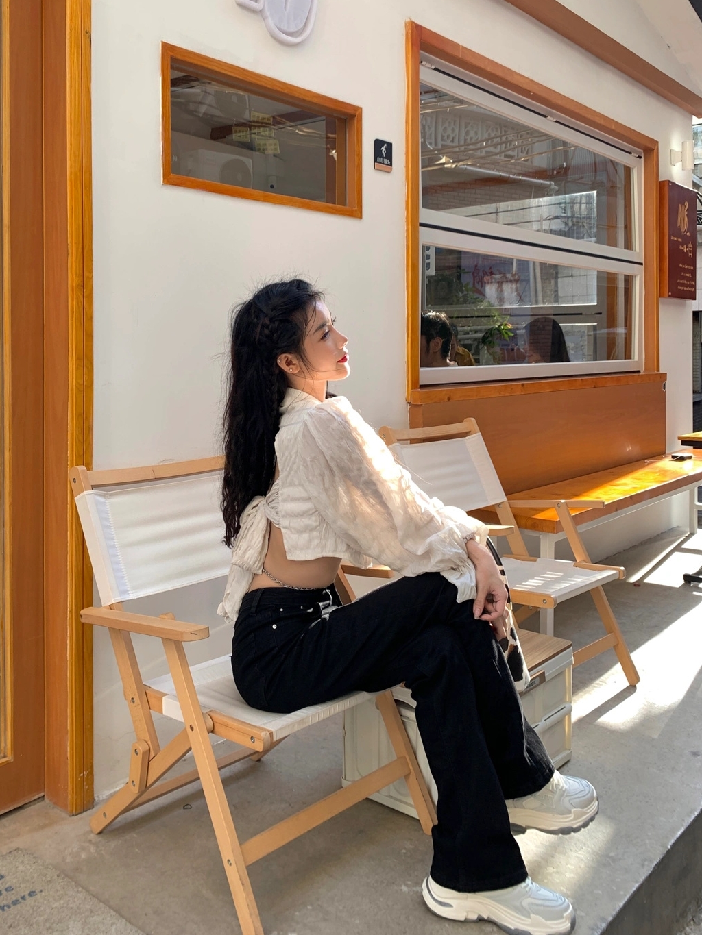 高腰的设计,拉长腿部线条,显瘦效果很好,高腰的版型,很显高挑,修身的剪裁,修饰腿部曲线,上身很有范。