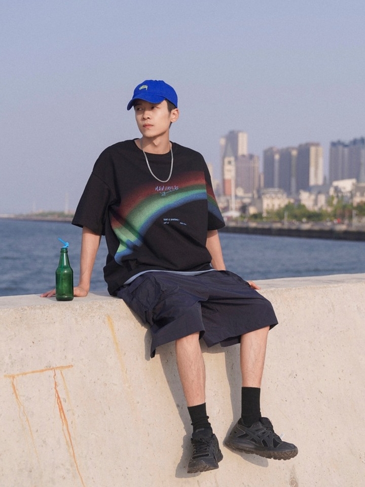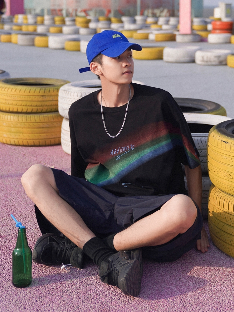 约风T恤为什么也能用潮流来表达,因为这款是独特的英文印花,并且有着经典的黑白撞色元素的存在。下身搭配一条军绿色的裤子,青春气质在不经意间表现的淋漓尽致。脚踩一双蓝色的运动鞋,能够hold住各种场合而不失摩登复古气质。加上一顶黑色的鸭舌帽,进一步提升时尚指数。