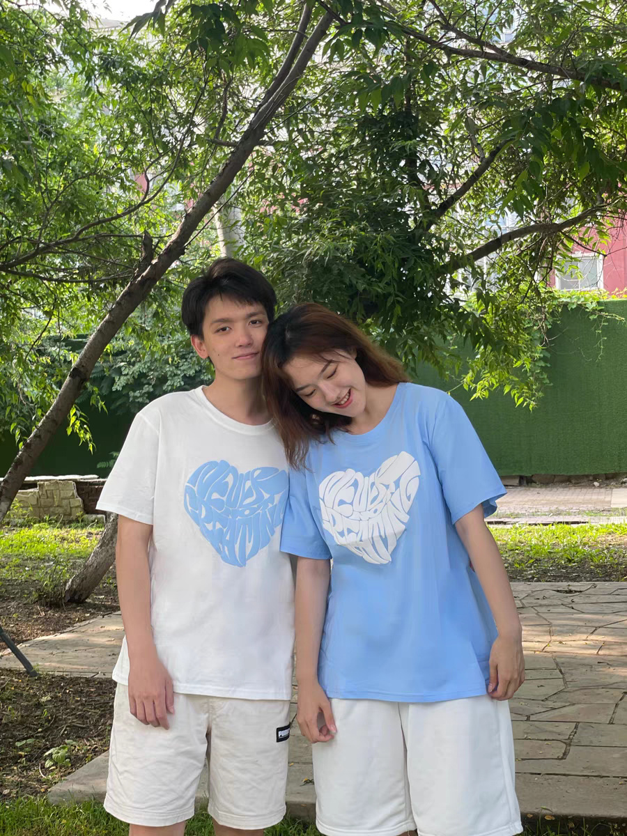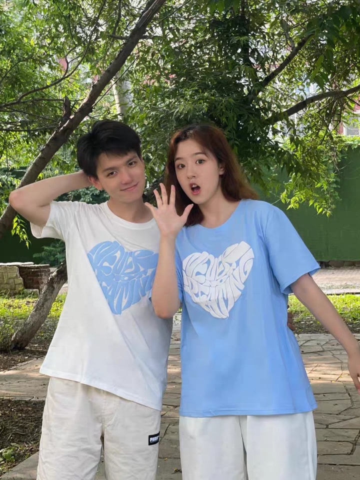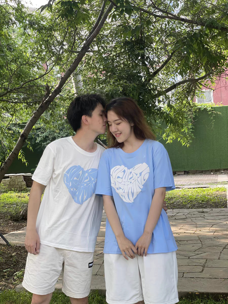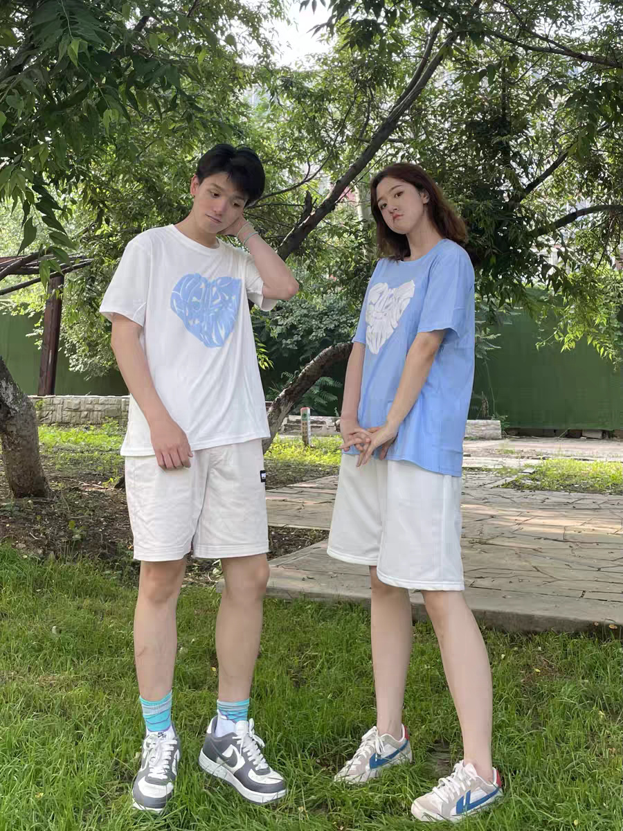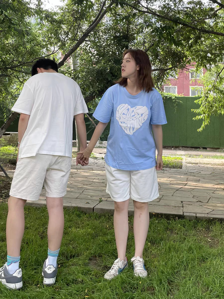 经典大方的圆领设计,百搭又不挑剔脸型。韩版爱心短袖T恤套装,点缀整体,增加趣味感。宽松服装版型的设计,能够拉长身材比例,在视觉上有显瘦的效果。最佳情侣搭配任何场合都能气场全开,成为全场最耀眼的所在。
