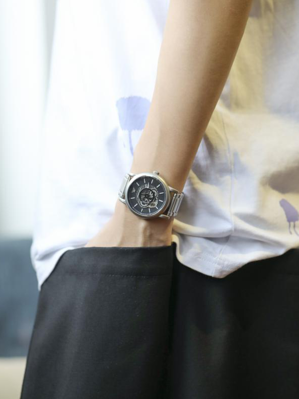 如果穿着西装,佩戴这款手表会中和你成熟的风格,让你看起来既绅士气质满满又风度翩翩;当然啦,清晰可见的镂空机械齿轮设计,更能让你轻松驾驭潮酷风格,搭配宽松长袖涂鸦T恤和束脚运动裤,会给人青春活力的感觉。