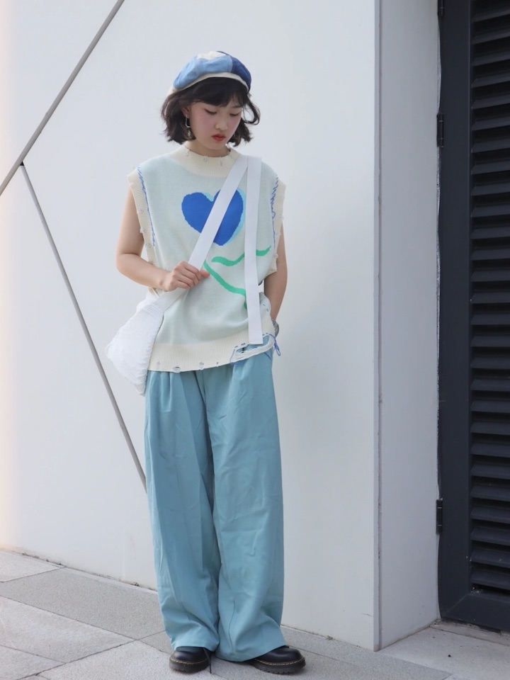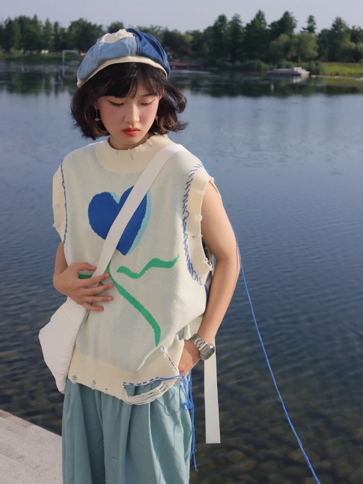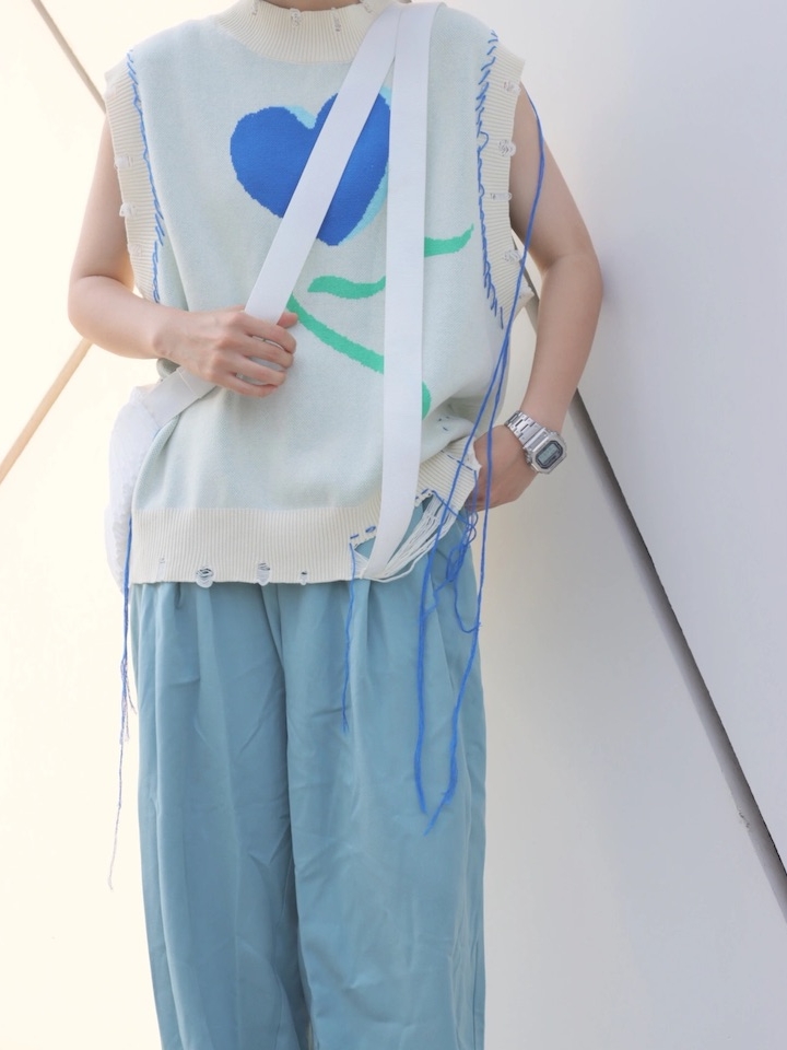 可可爱爱的印花设计背心,爱心元素的设计,看到TNQT家这款单品的时候,老夫的少女心瞬间被俘获~色系非常清爽,以米白色系的主色系,蓝色系的爱心点缀,可盐可甜美的一款单品。