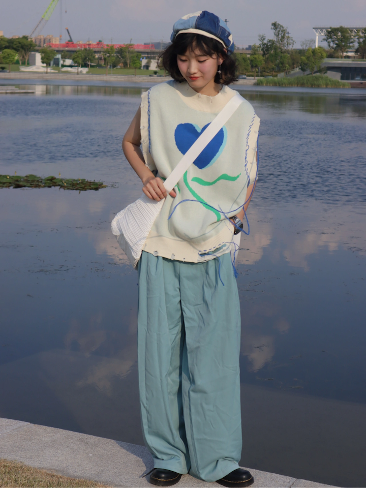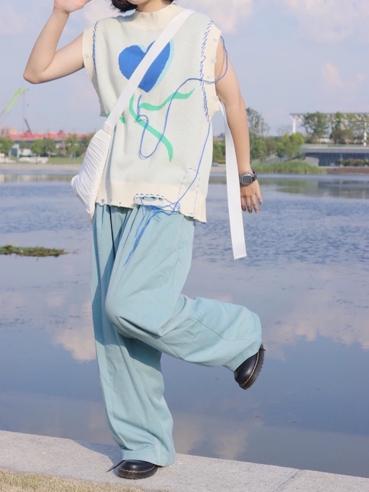 这款背心,无论是叠穿还是单穿都超级出众~跟浅色系的下装搭配起来,也是绝绝子的!像是今天搭配浅蓝色系的宽松牛仔裤,一身宽松的穿搭,非常的舒适~轻松解锁慵懒简约画风。