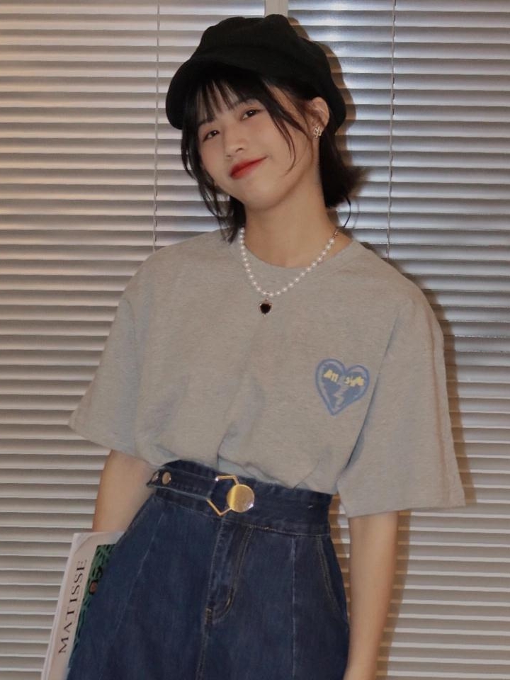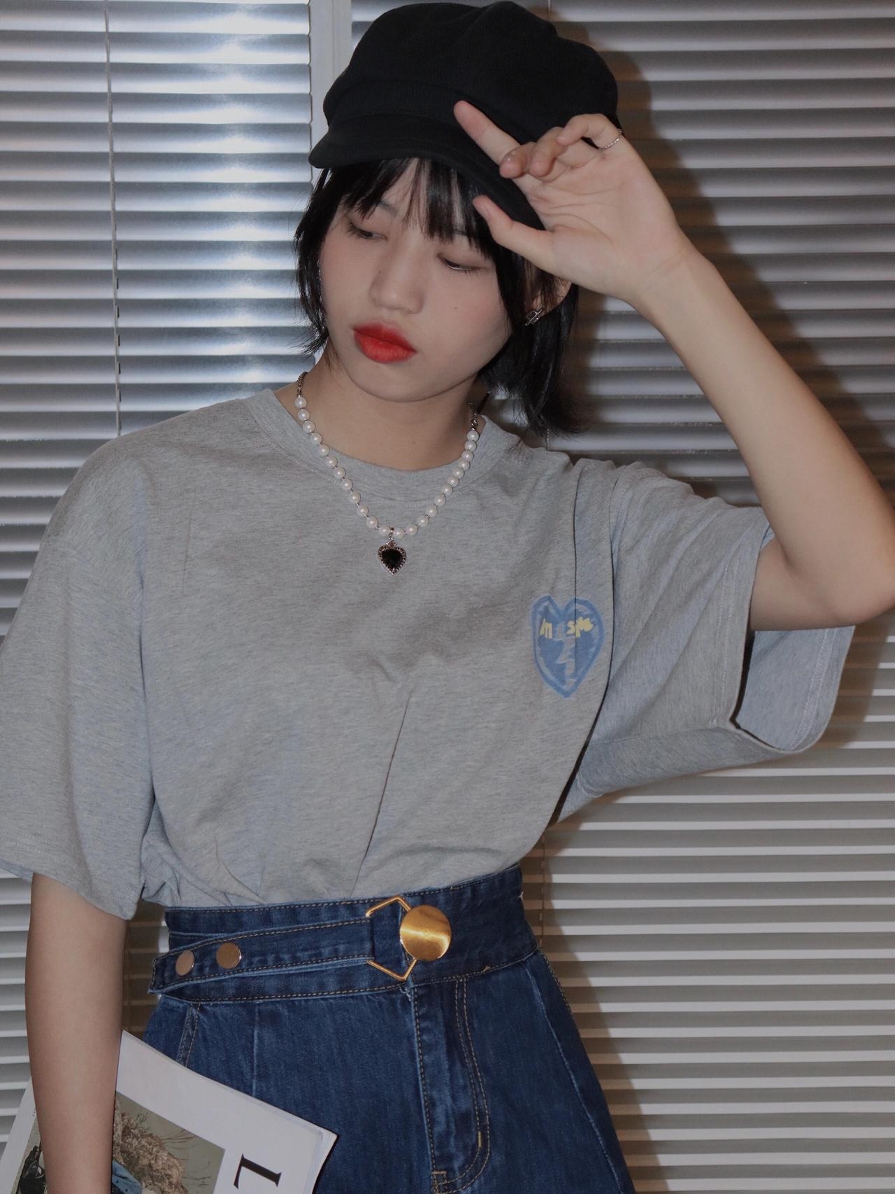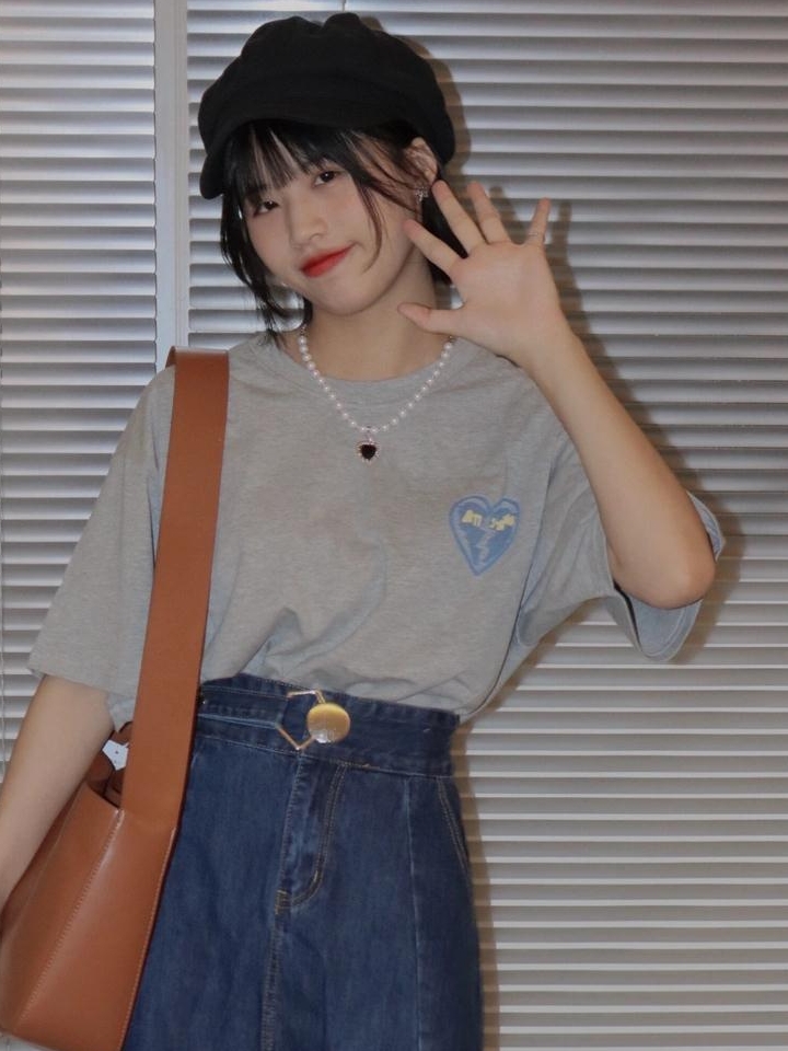 心碎灰色T搭深蓝色开衩牛仔裙,再来个单肩斜挎包,复古感满满。