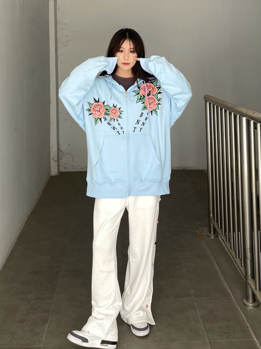 天蓝色和红色花卉的搭配太妙了,有种和谐的复古感,这个印花也是值得一夸,把年代潮流拿捏的死死的。