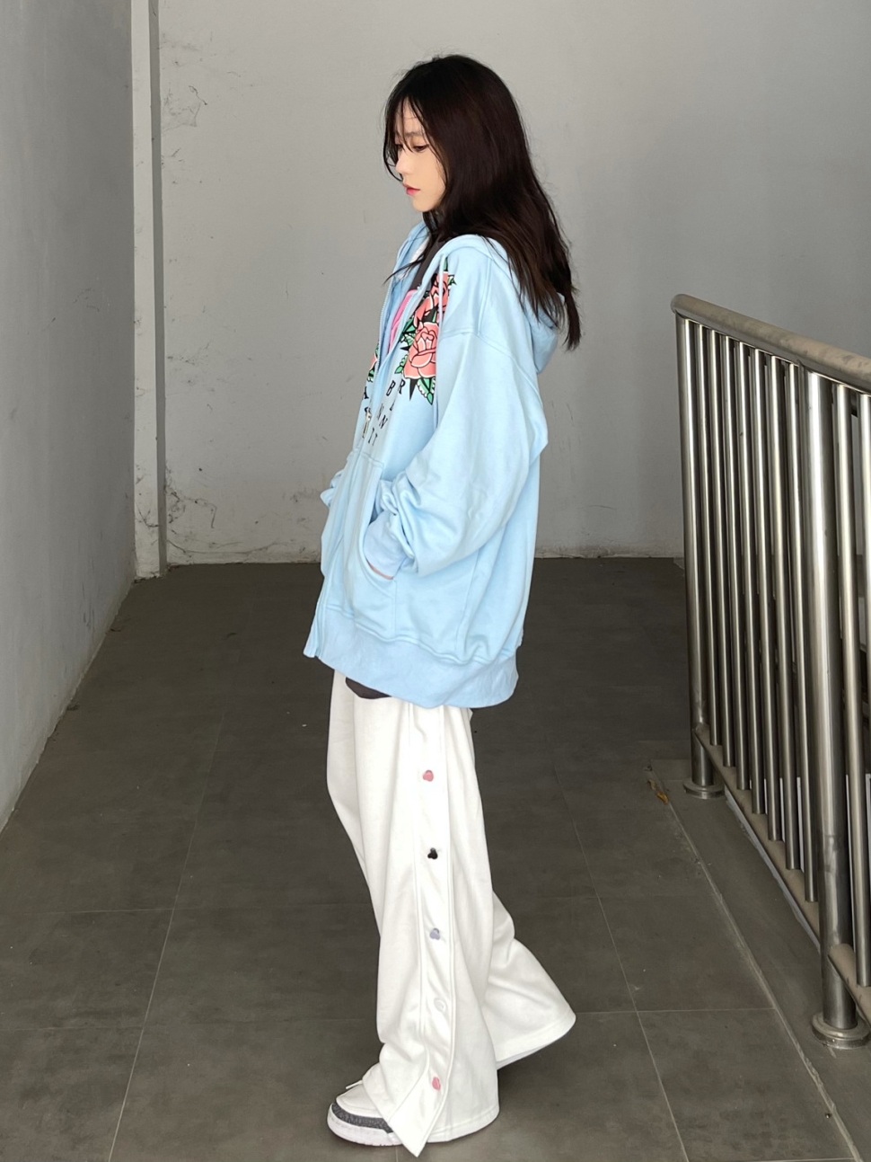 白色排扣裤有多百搭不用我说了,面料柔软, 宽松版型穿着太舒服了,排扣是可爱的糖果色小爱心。