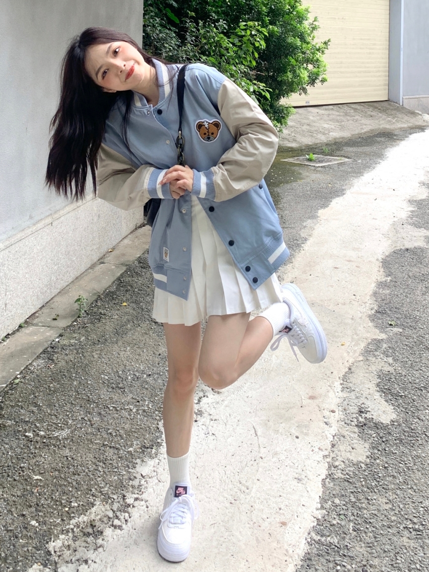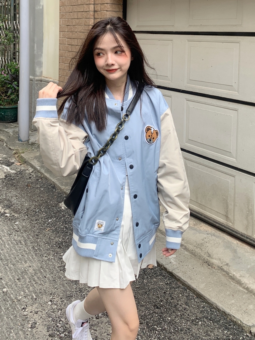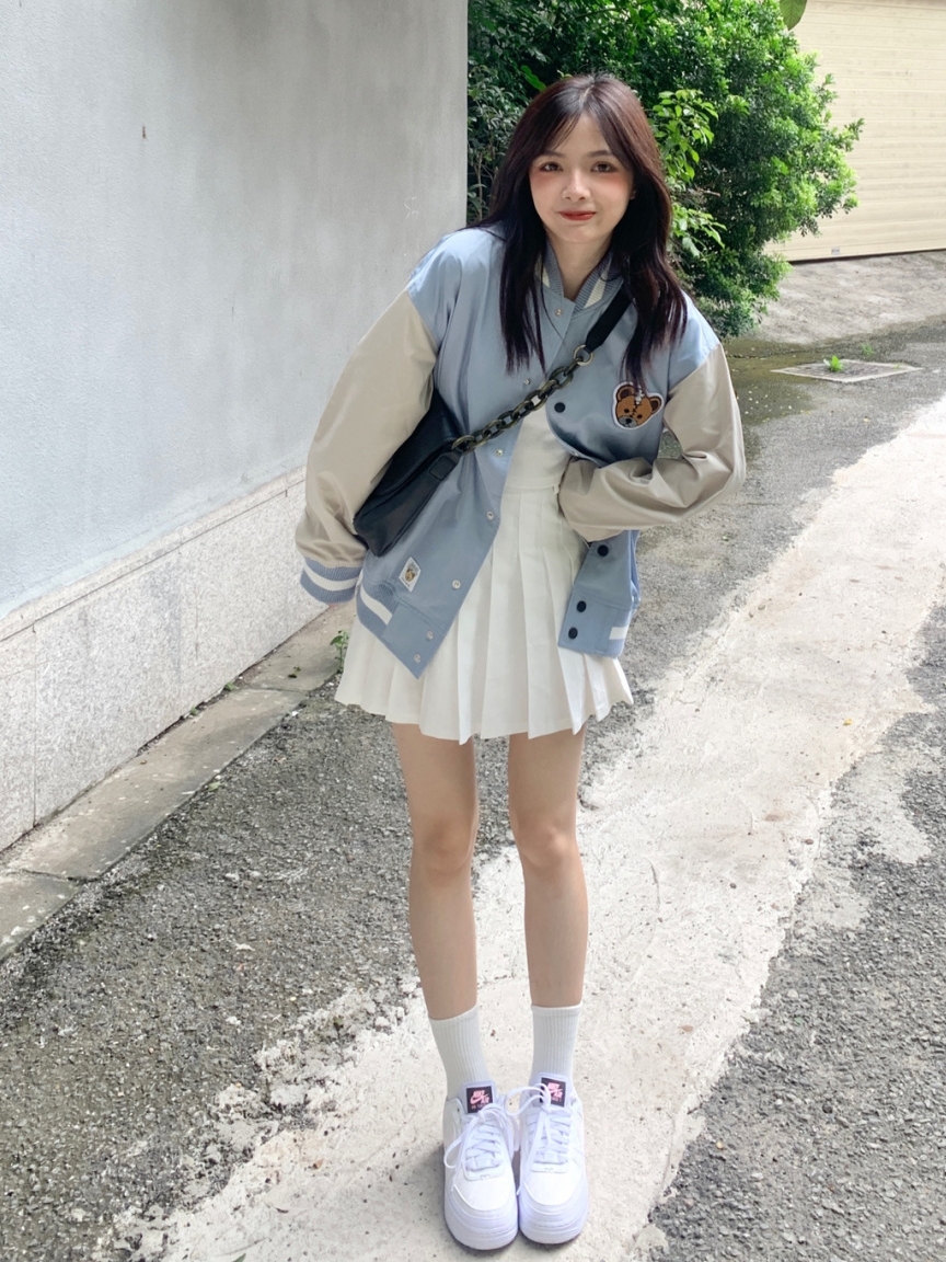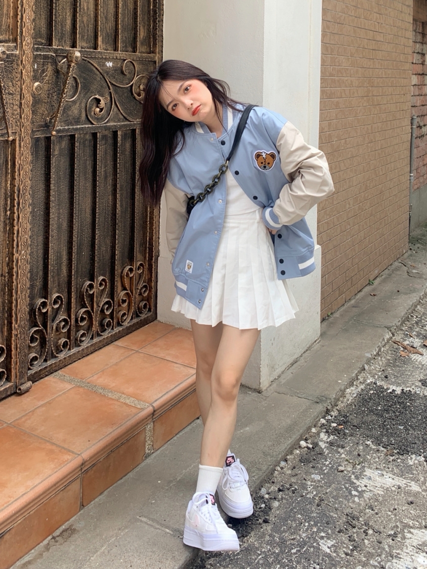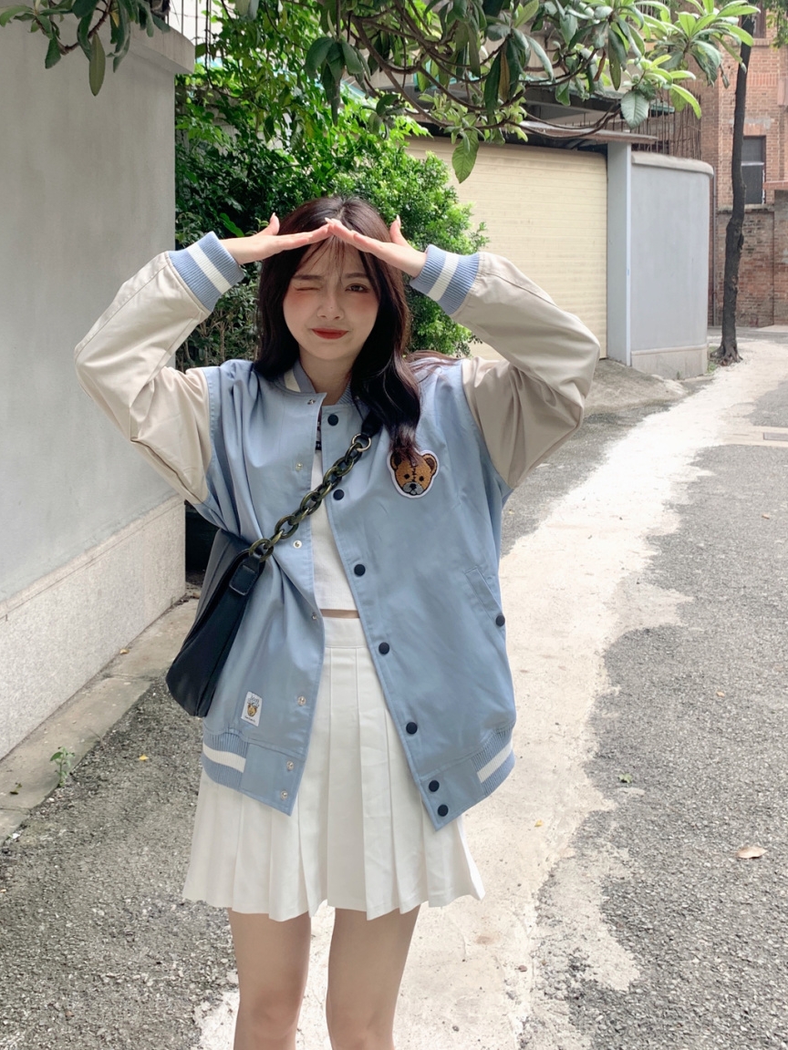 嫩嫩的棒球服外套,初秋街头休闲风女孩上线啦。