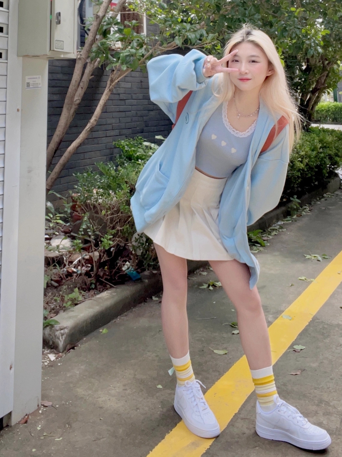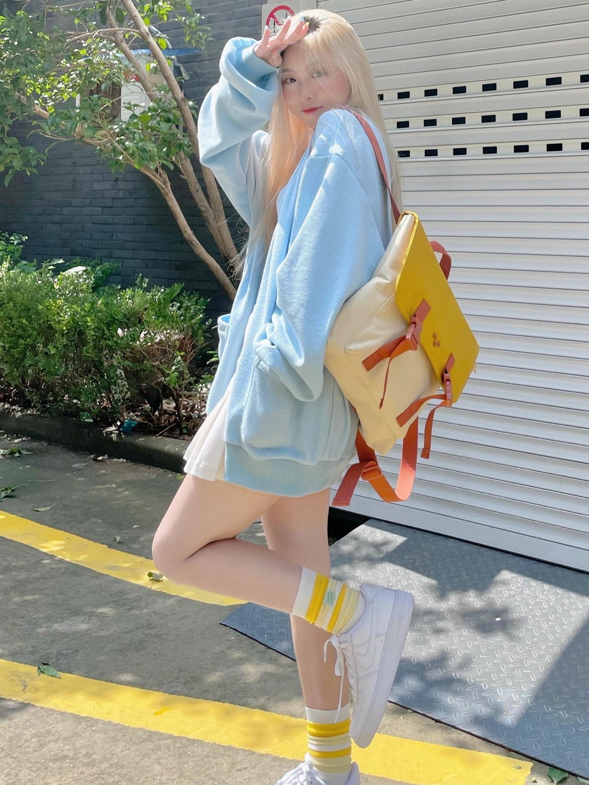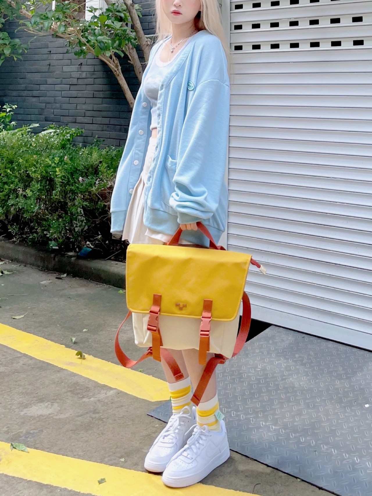 奶蓝开衫搭上超乖的剑桥双肩包,这件奶蓝色的外套巨巨可爱,很显白,里面有层薄绒很舒服,作为入秋第一件太棒了。