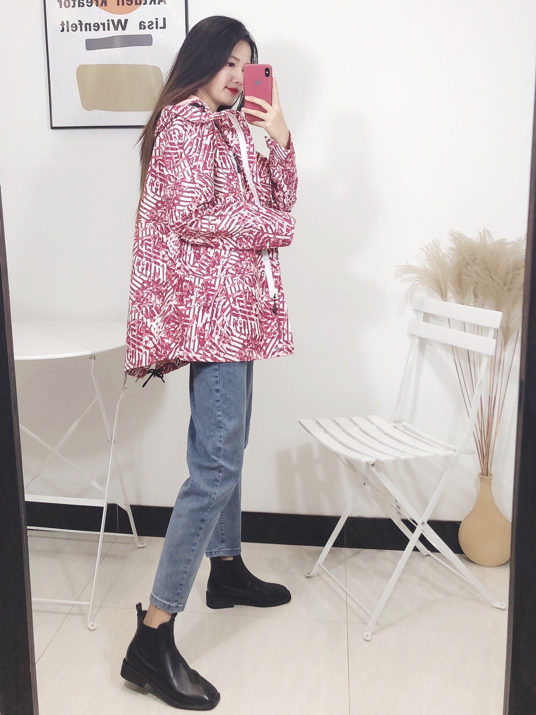 高腰设计,拉长身材比例。高腰牛仔裤,显瘦显腿长。直筒裤型,修饰腿部线条。