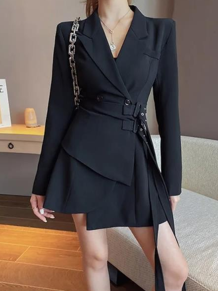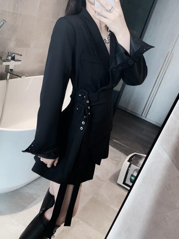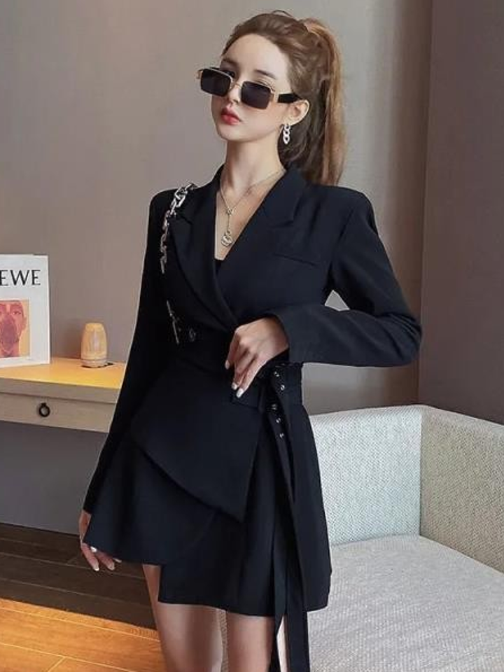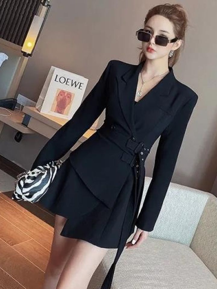 简约时尚职业套装,西装翻领简洁干练,修身长款版型气质高挑,腰间金属腰带美观大方。收腰设计,凸显女人味。