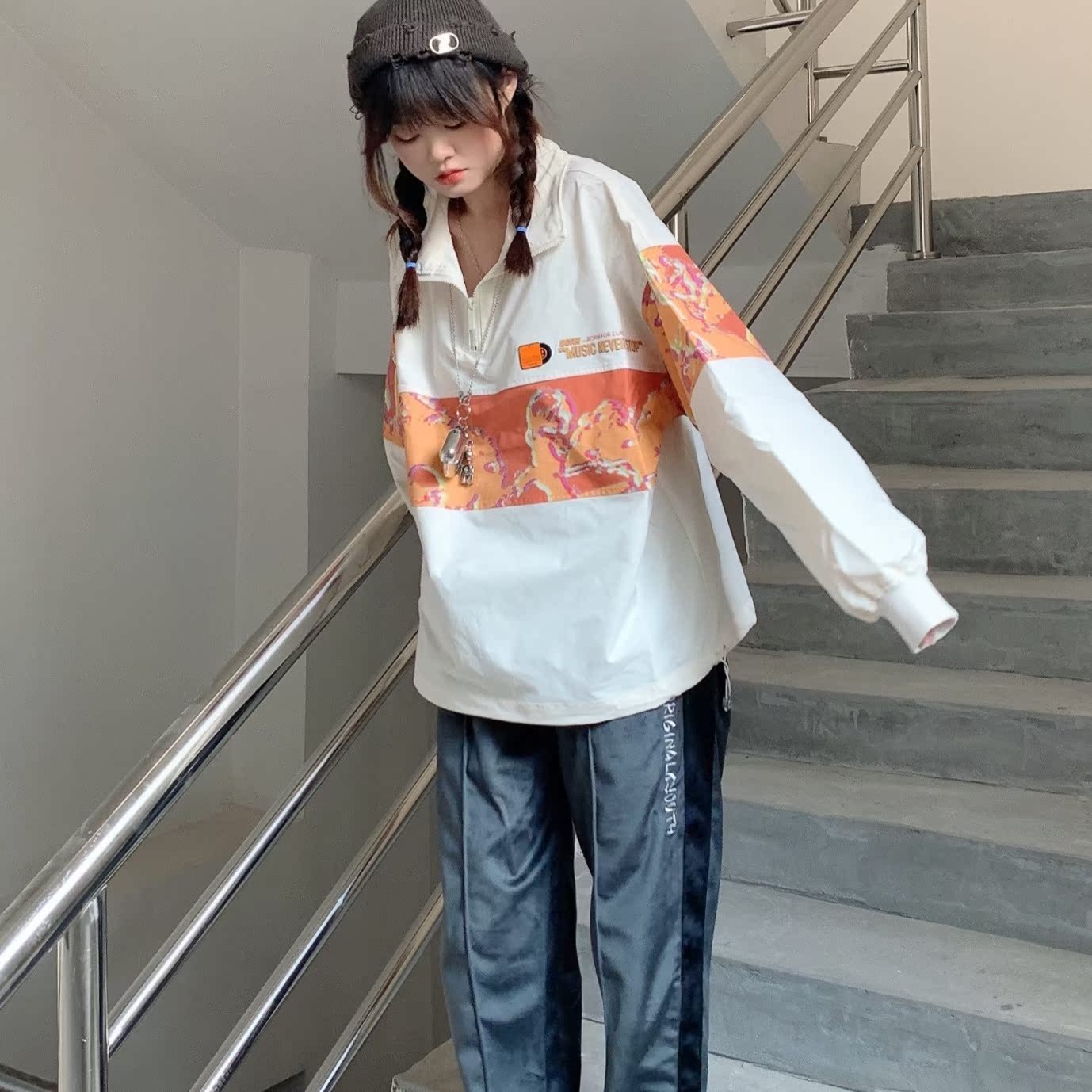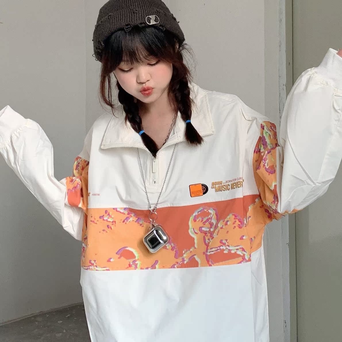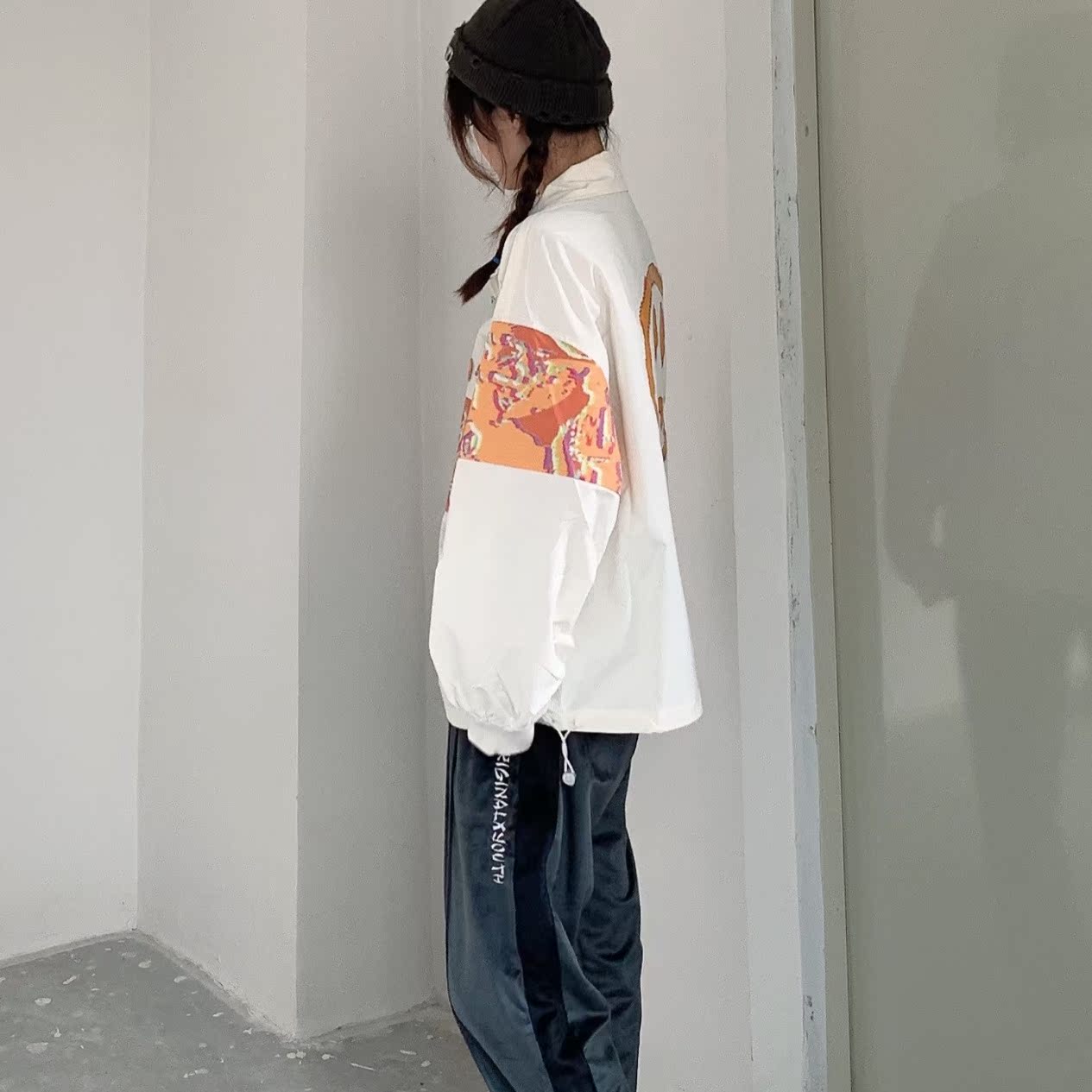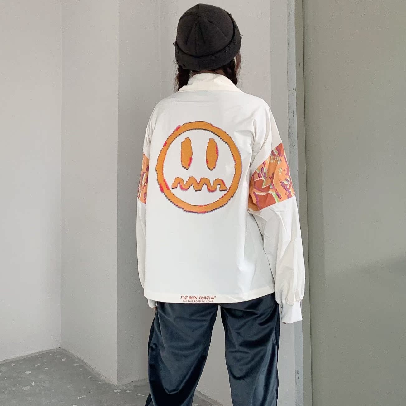 原创国潮品牌BEASTER推出的这款外套,结合螺纹拼接尤具休闲气息;背后加入了品牌标志性的恶魔笑脸印花,极具潮范。
