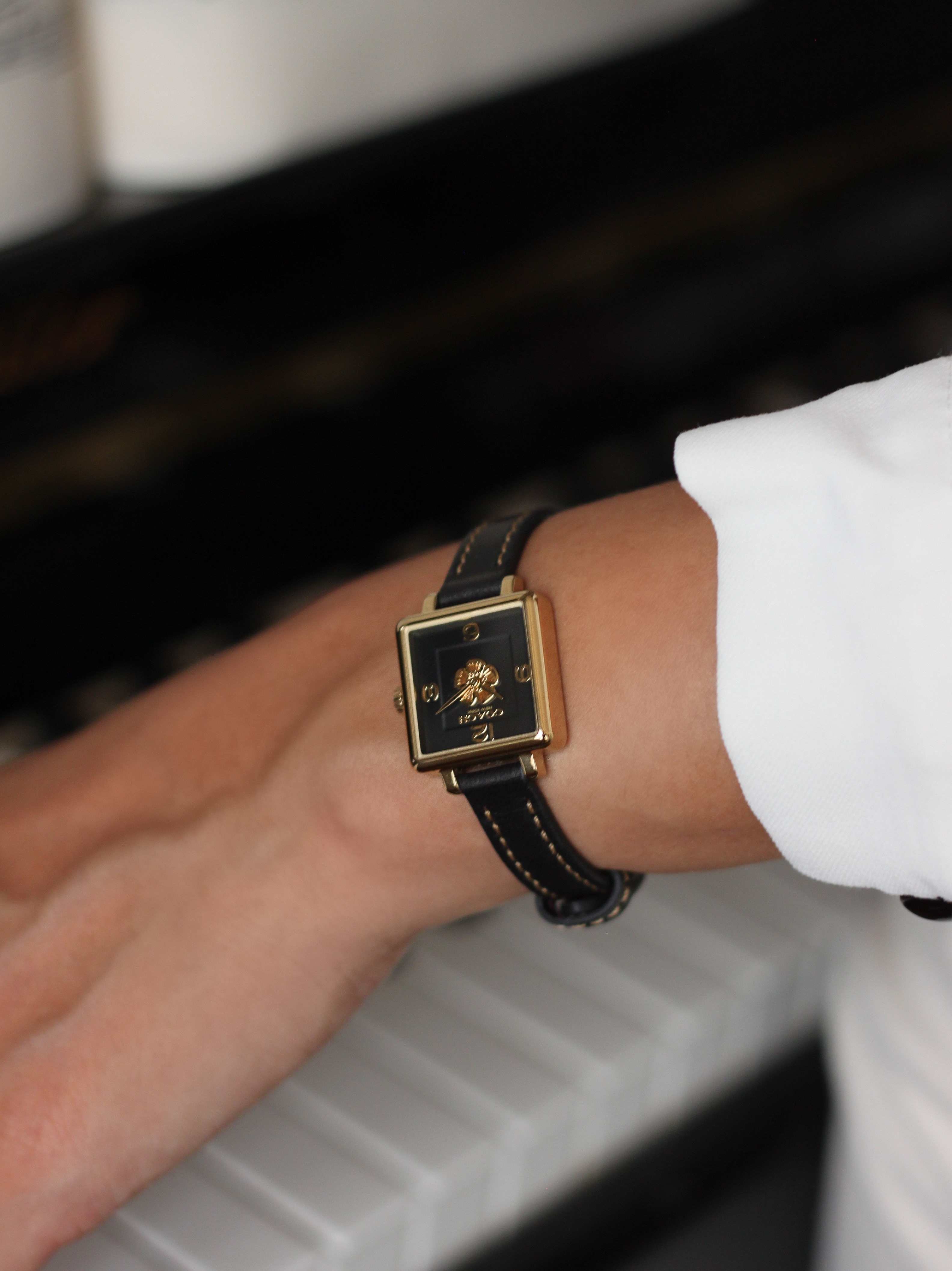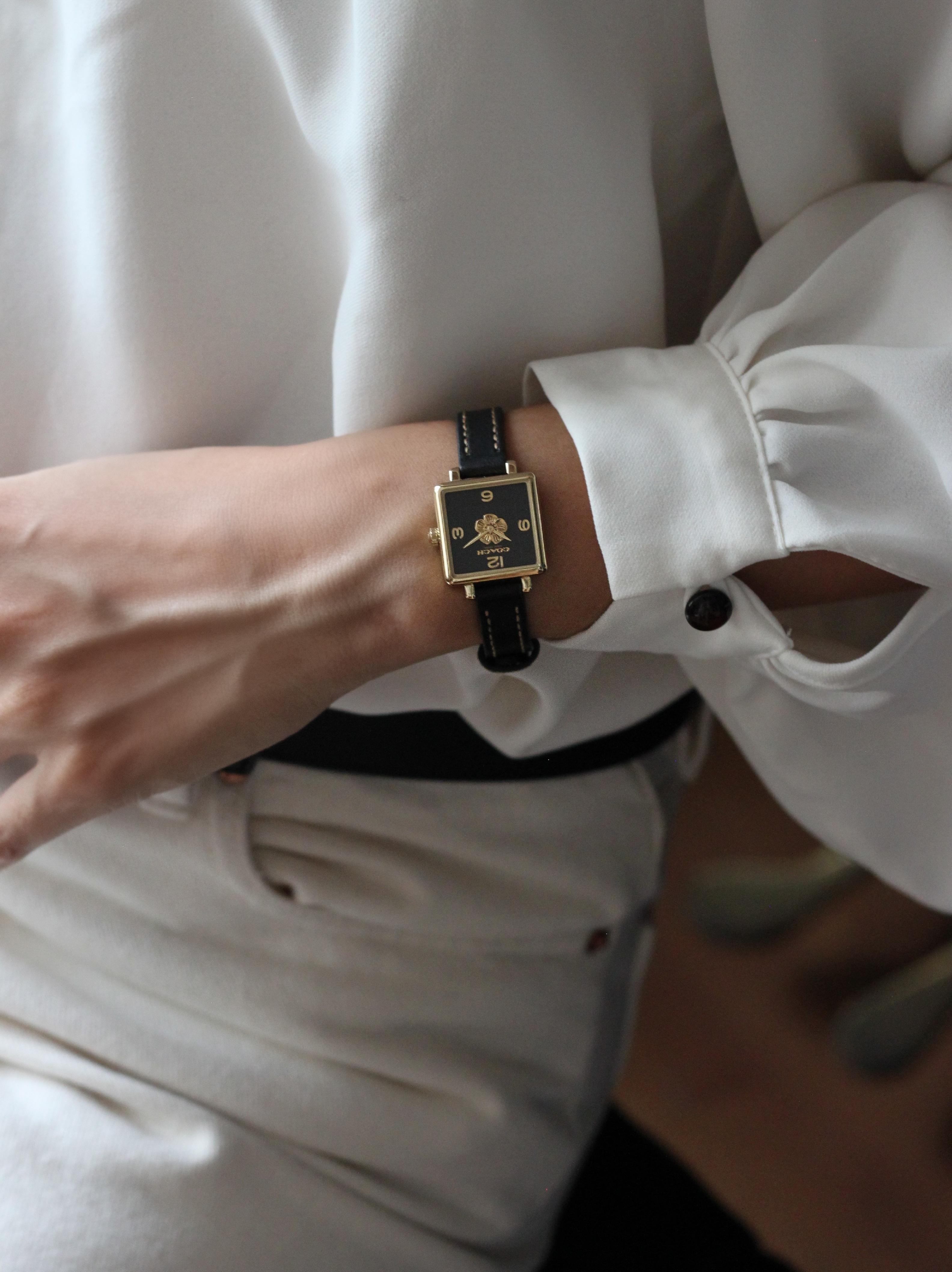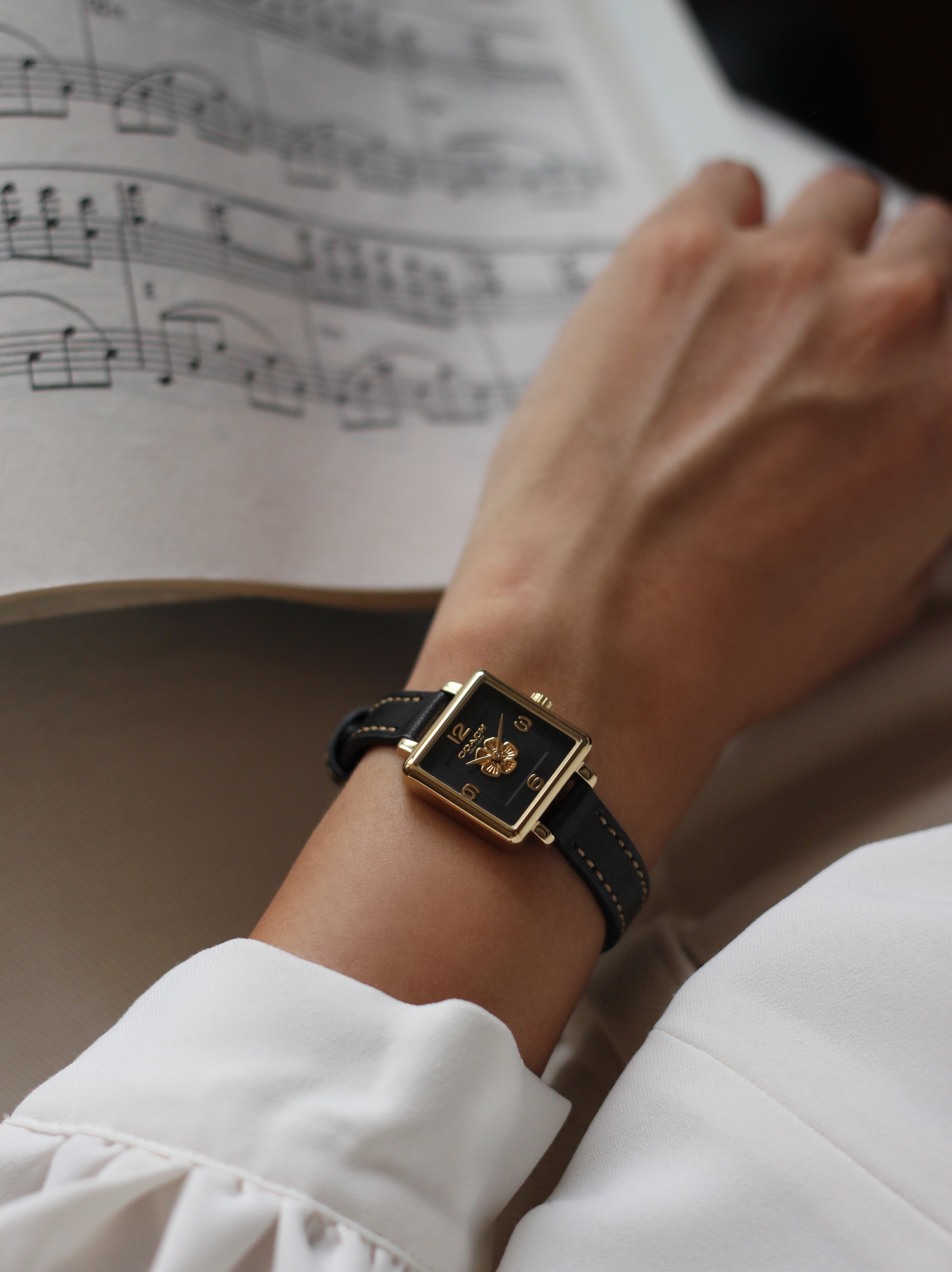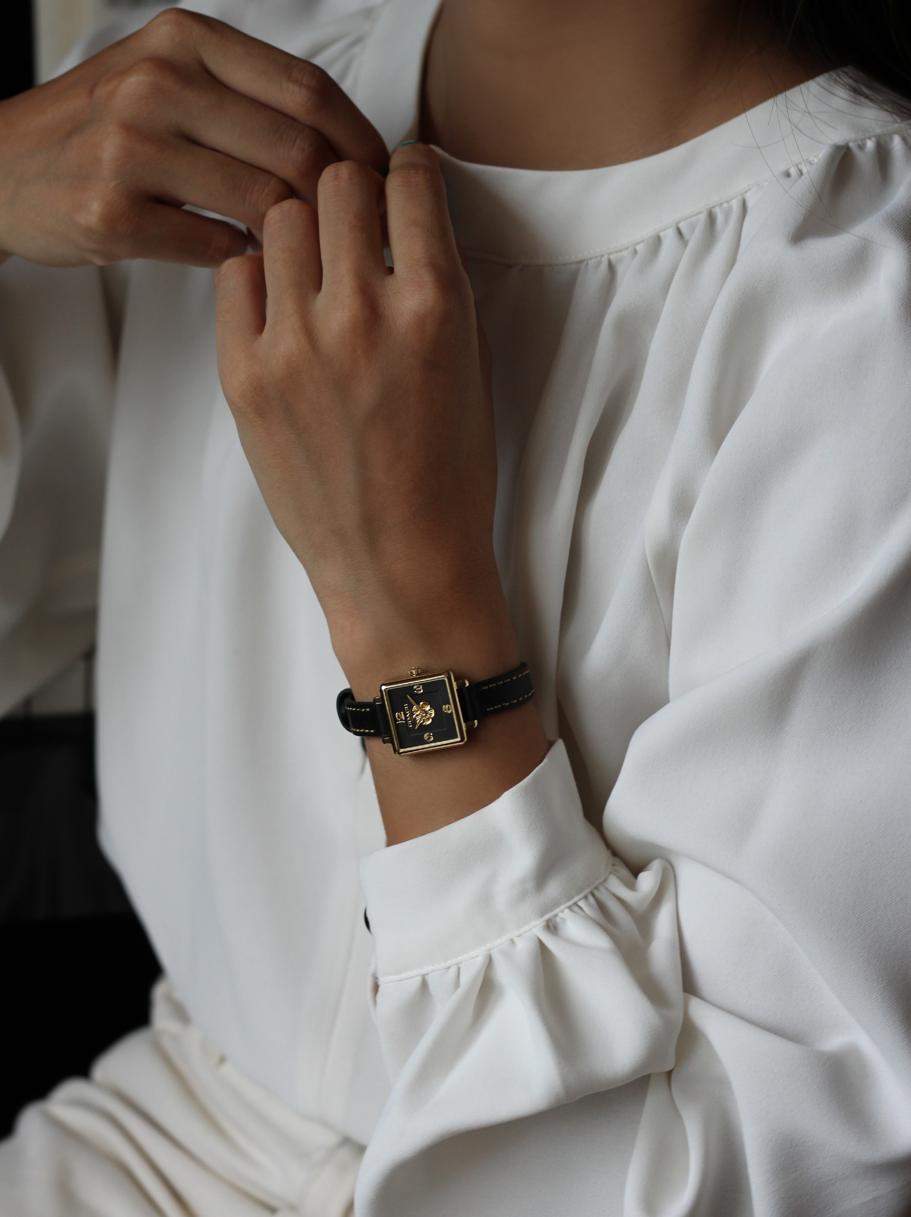小方表整体造型是属于很日常很都市风的设计,黑金配色比较好搭配衣服,偏性冷淡的颜色yyds,既复古又酷。方形设计比较简单,22mm宽加入了立体茶玫瑰的设计,被3、6、9、12四个时刻环绕,看起来不浮夸也不耀眼,简单大方很适合通勤风。