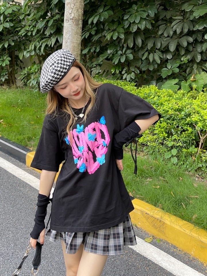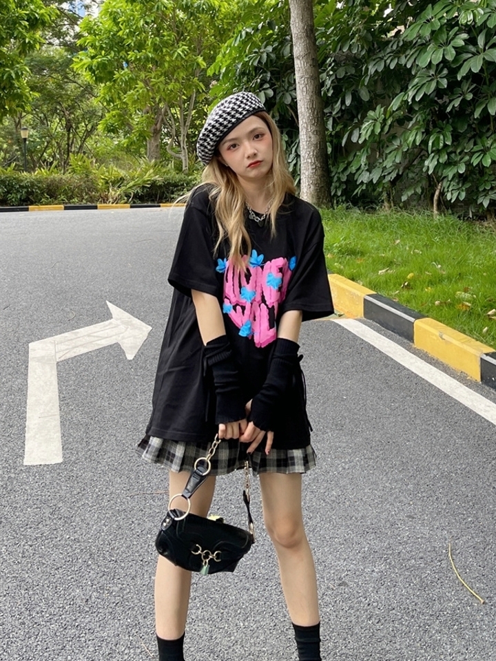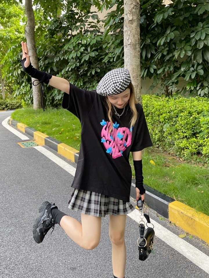 这款t恤是简约的风格,宽松的版型,时尚百搭,胸前的字母印花,很有个性,搭配牛仔裤或者短裤都很好看。