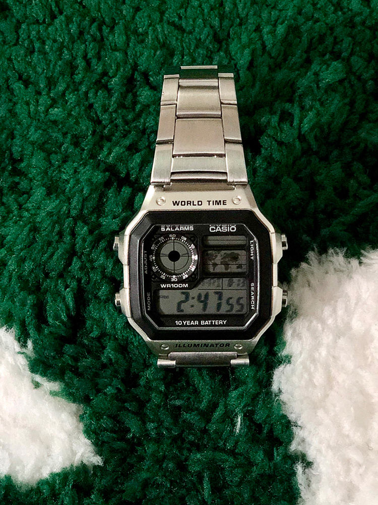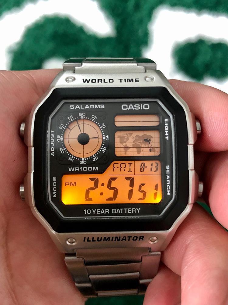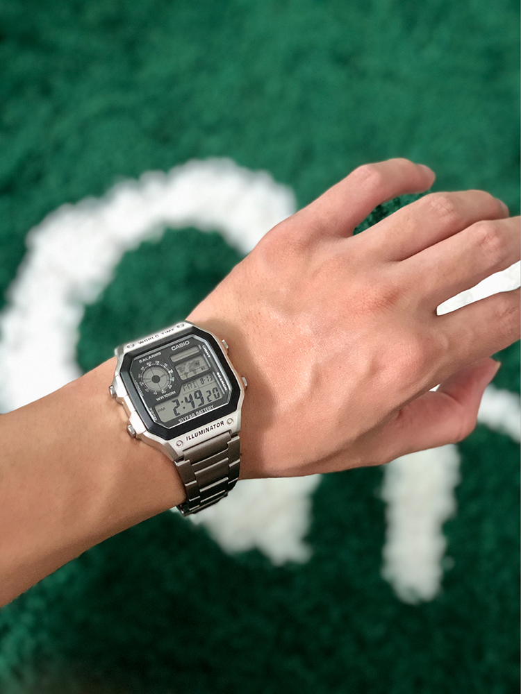 简简单单的小方块,满足了我日常的需求!卡西欧AE-1200WH表盘上科技感十足,时间/星期/世界时钟。表上还有个背光按钮,橙色的灯光也很复古!也很适合日常的搭配,喜欢拆改也可以看看攻略。