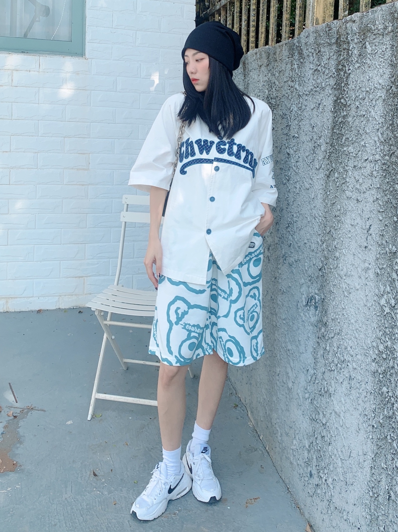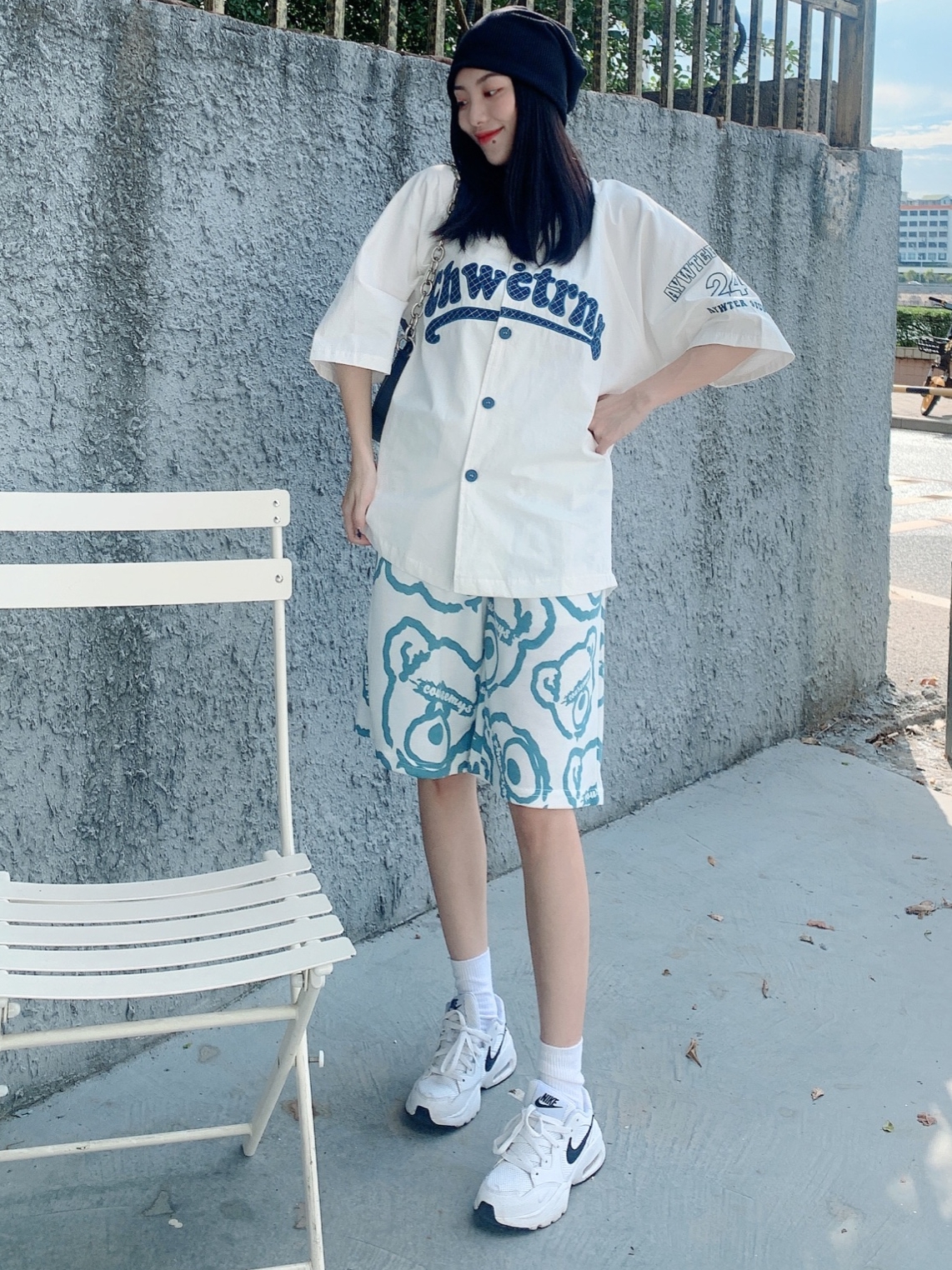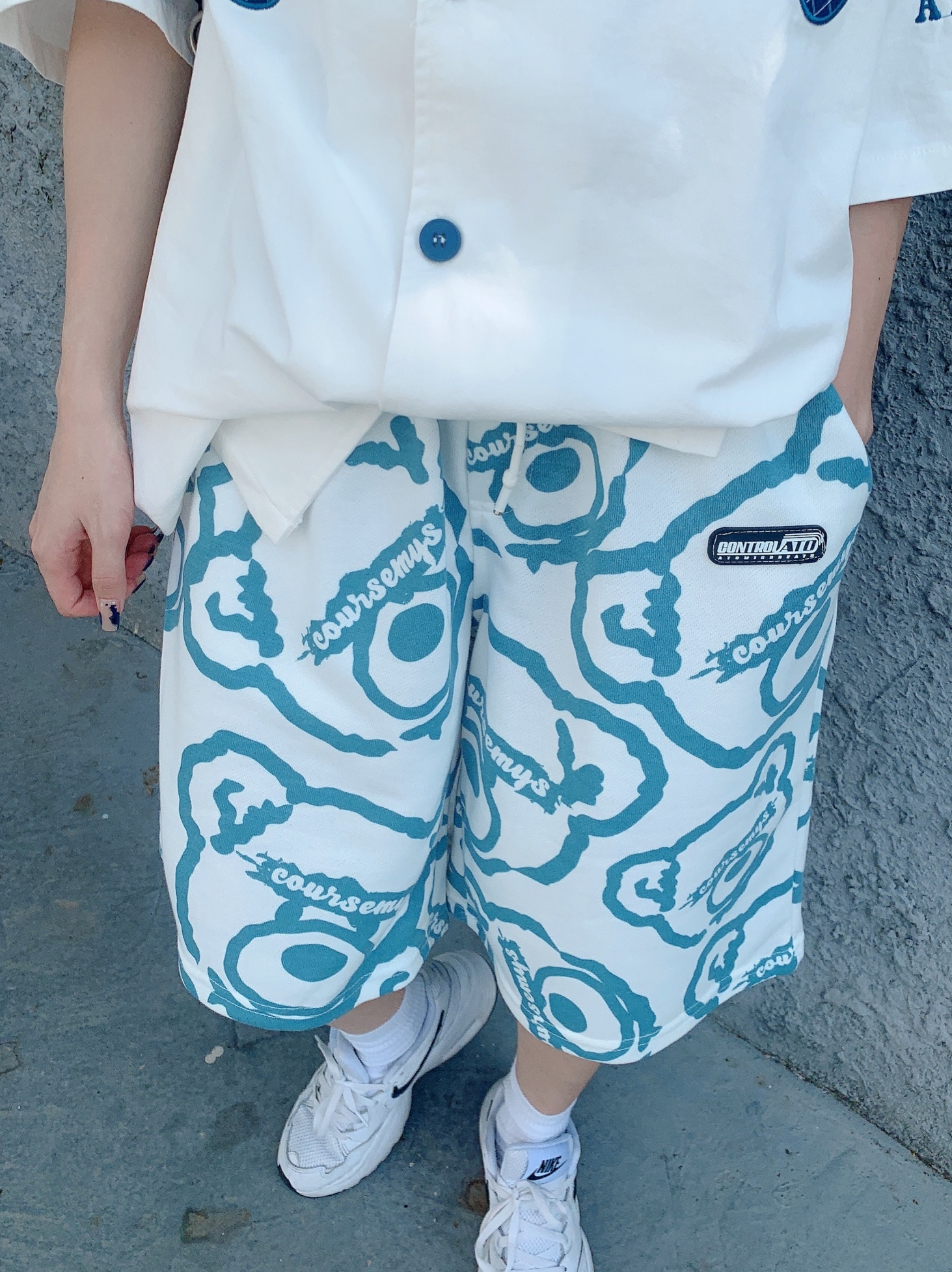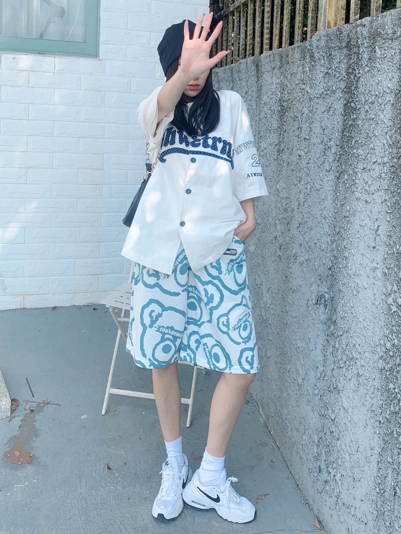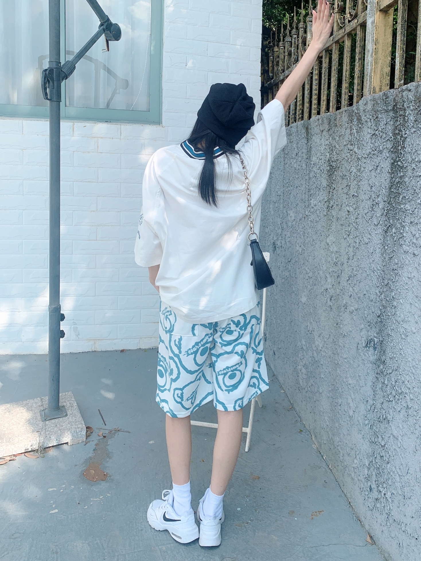 全身布满小熊的印花图案,给人小清新的感觉,清新蓝粉二色可选,纯棉针织中裤的设计,搭配印花白T+帆布鞋,一身清凉出街。