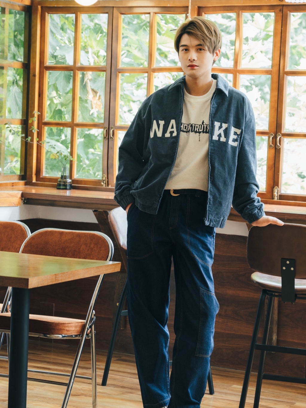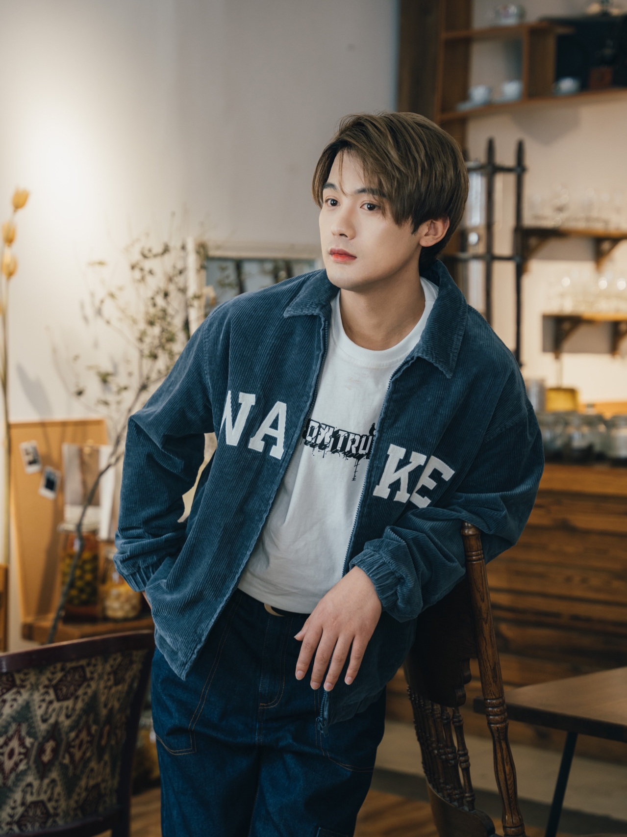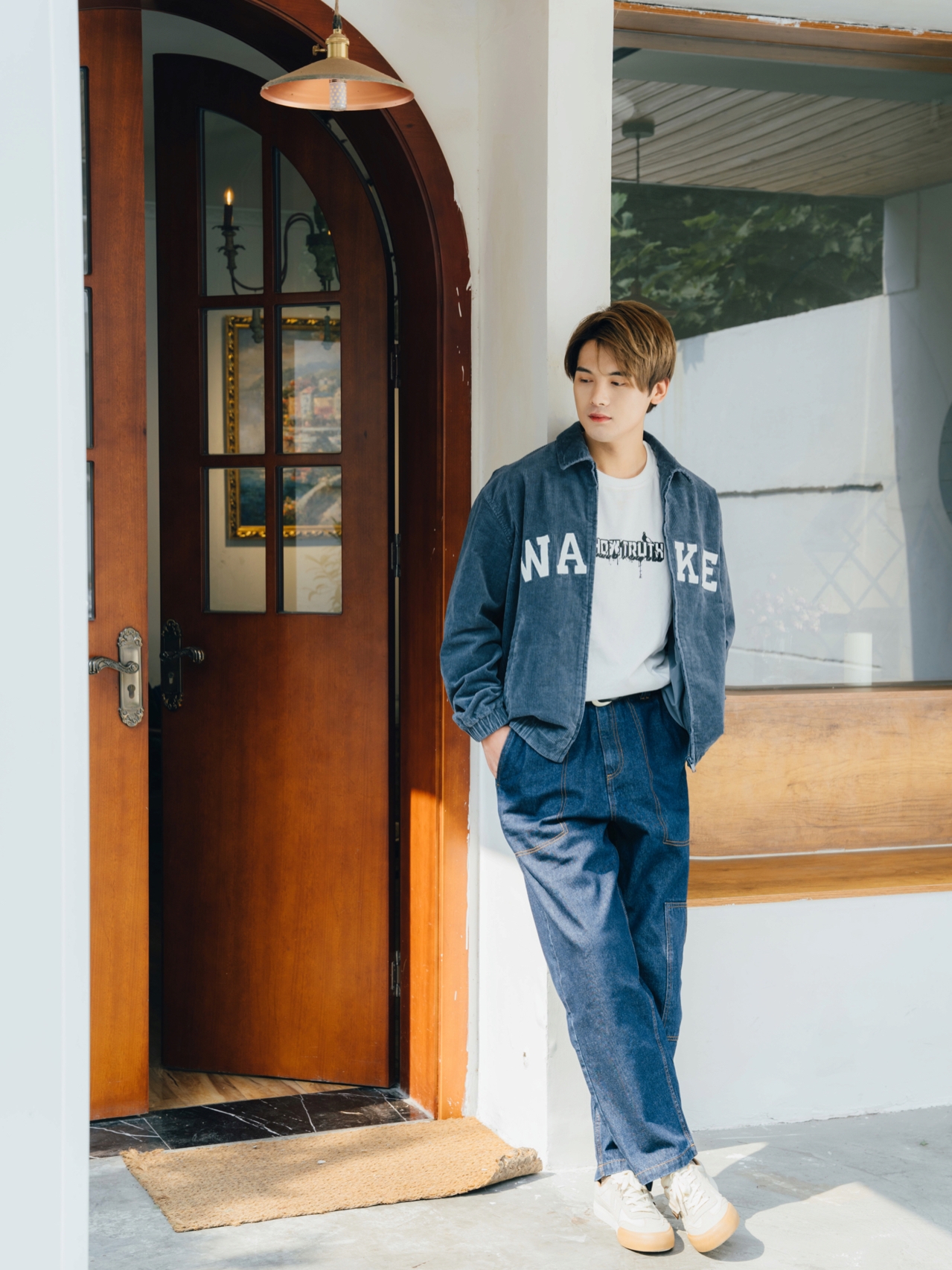 灯绒芯的面料+复古深蓝色+大阔版型,很有型哦。