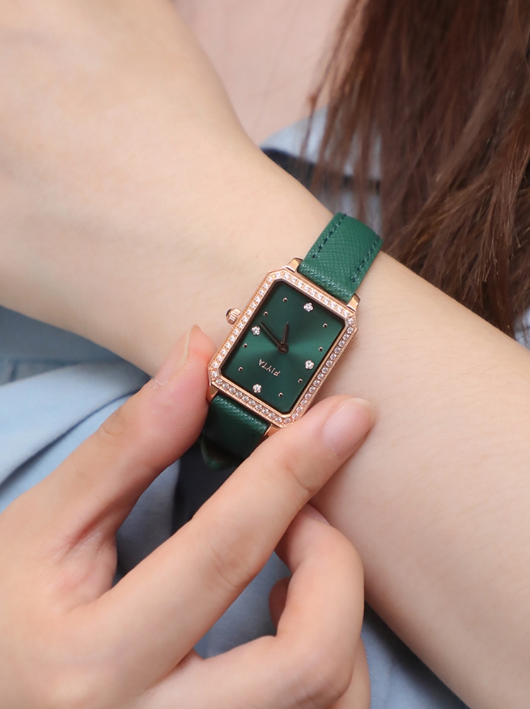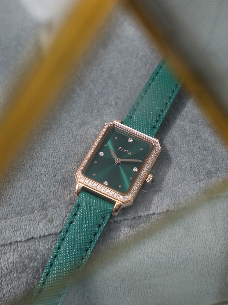 表盘上加入了一抹渐变太阳砂缎面工艺,呈现出绿色珠光晕染的效果,让绿随光跃动,如丝般细腻。