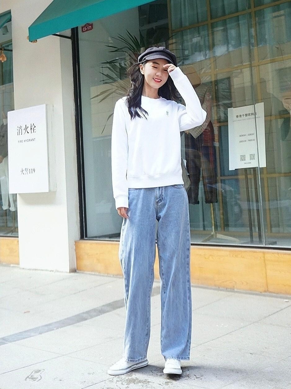 高腰设计,拉长身材比例。高腰牛仔裤,显瘦显腿长。直筒裤型,修饰腿部线条。