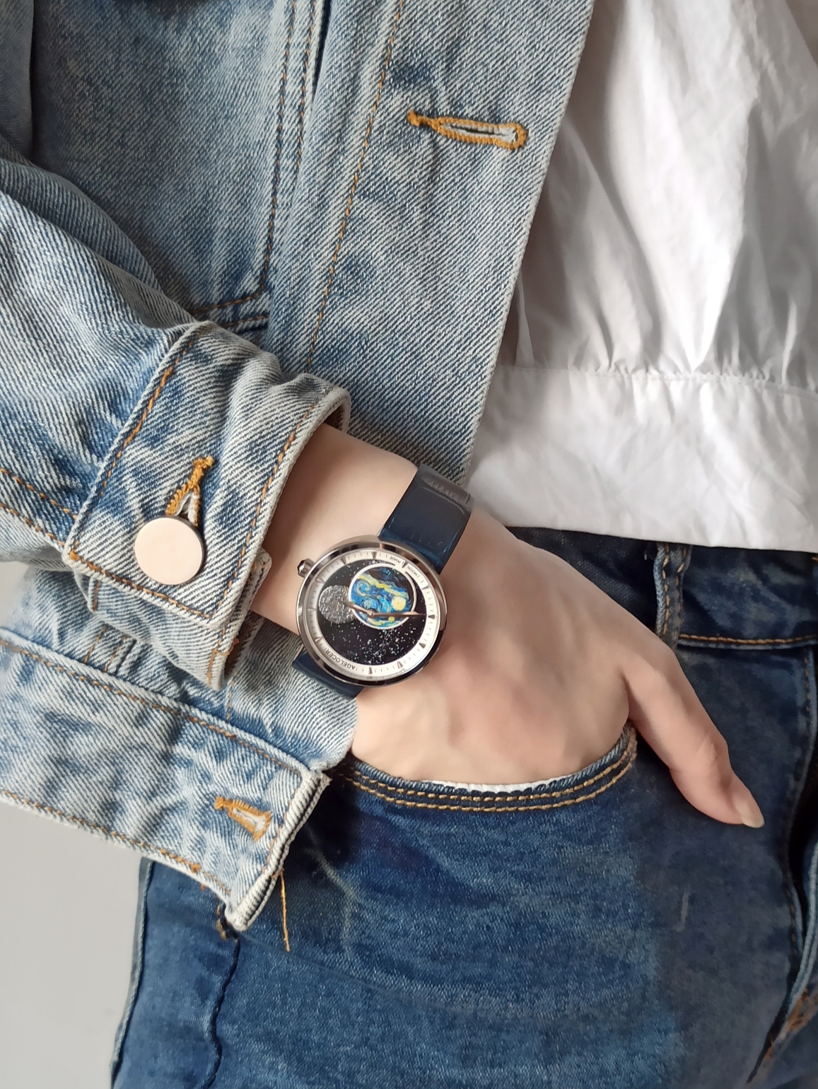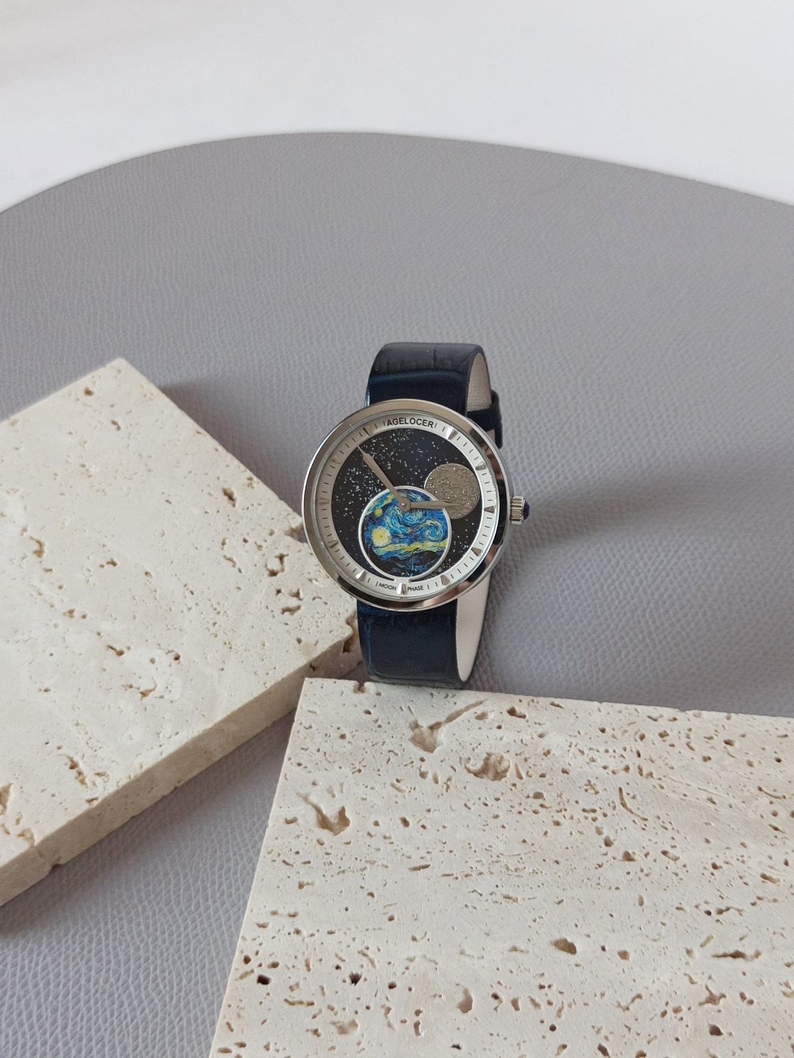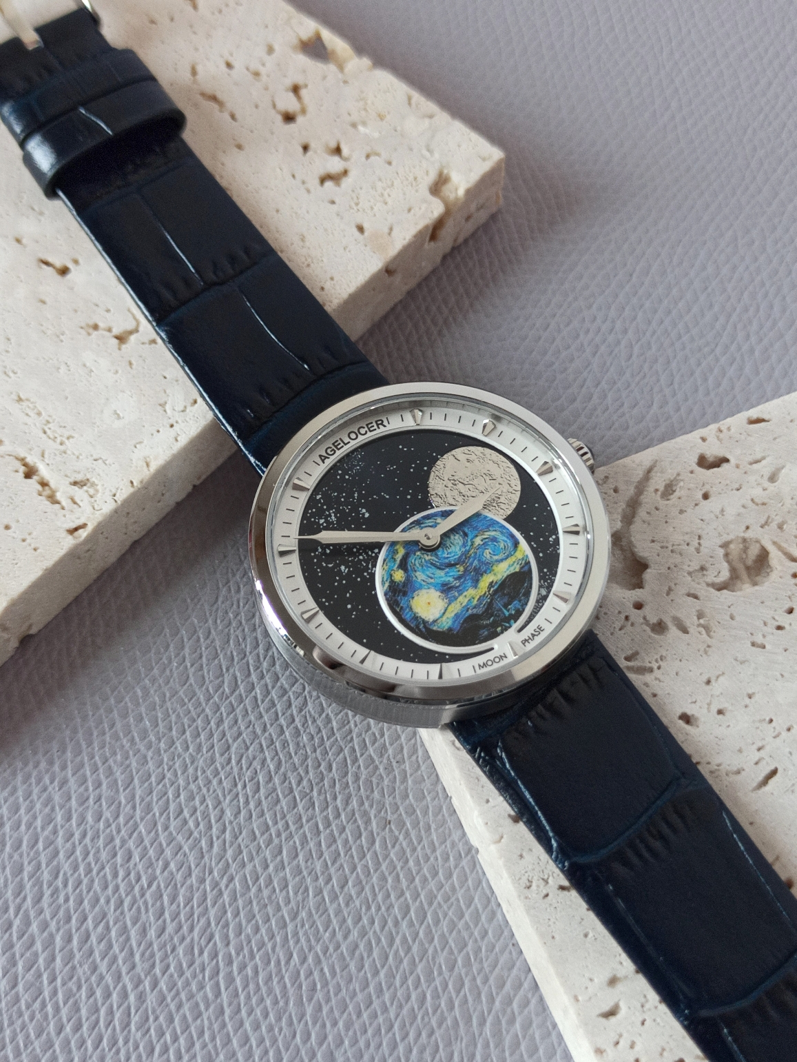 这块手表将梵高的星夜油画和现代机械表盘完美融合在一起,如星空般无法让人挪开眼,令我想不到的是表盘上的全景月相还能随着时间变化,展现出月亮阴晴圆缺的过程,这个小巧思真的十分独特了。