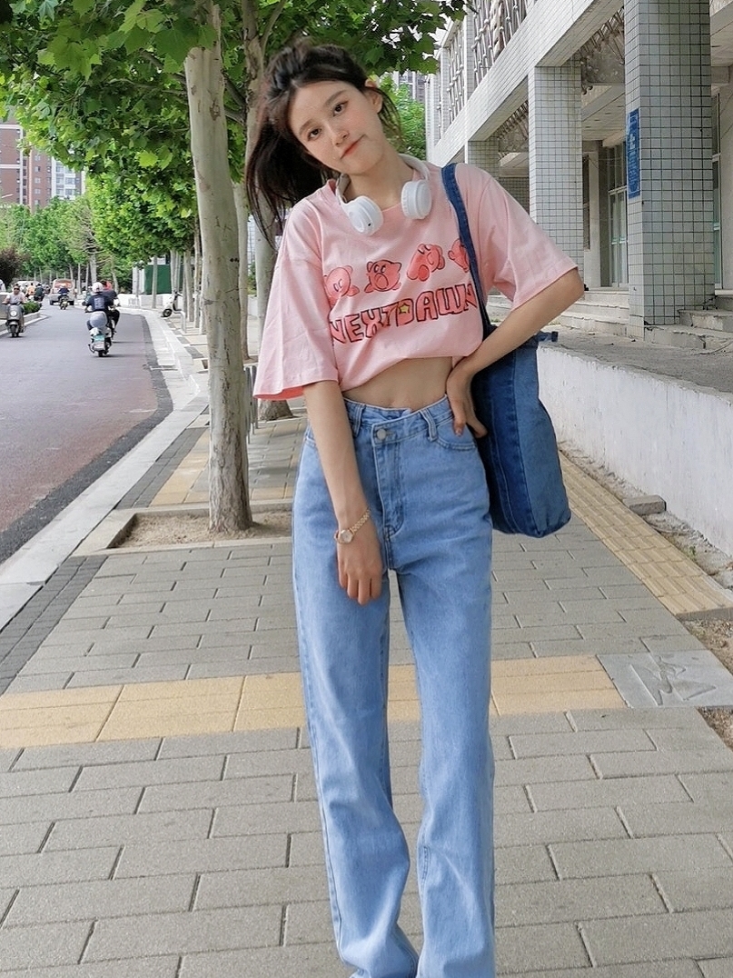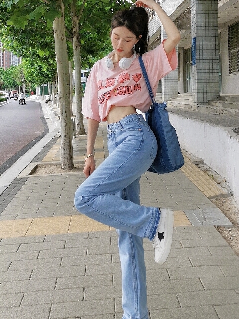 高腰设计,拉长身材比例。高腰牛仔裤,显瘦显腿长。直筒裤型,修饰腿部线条。