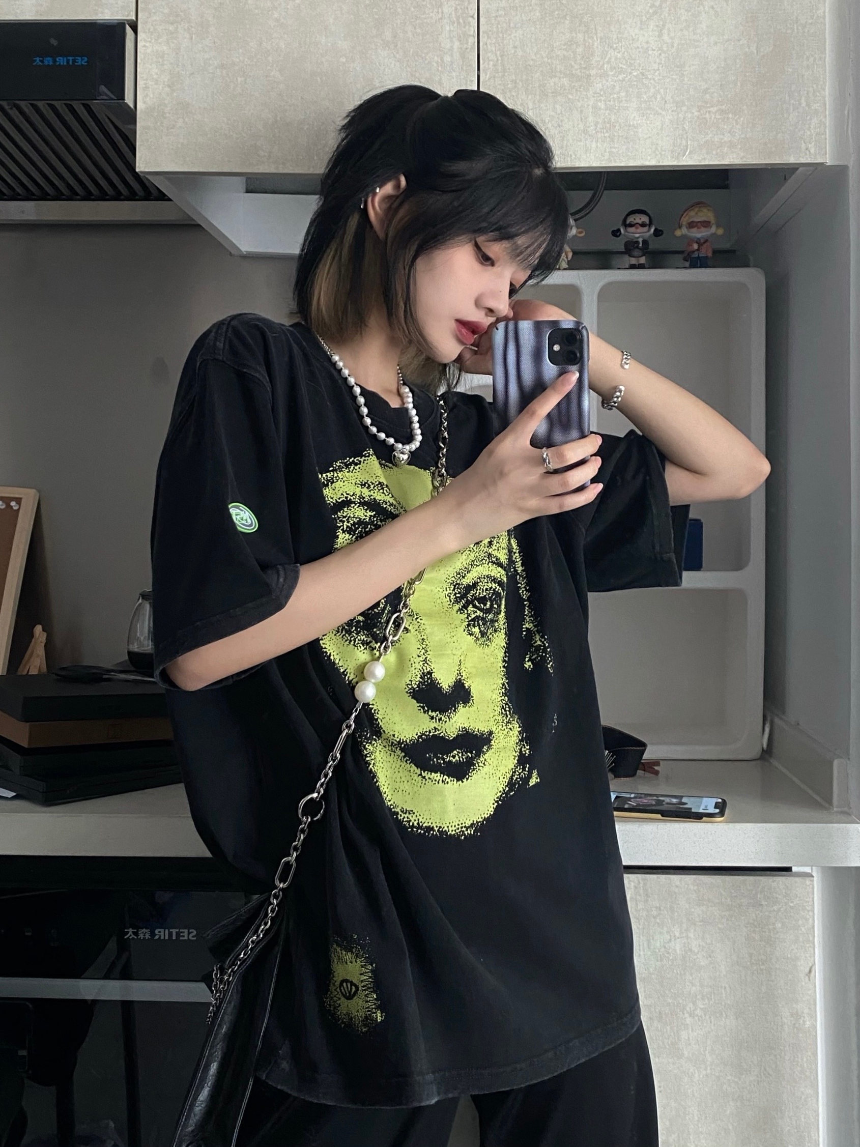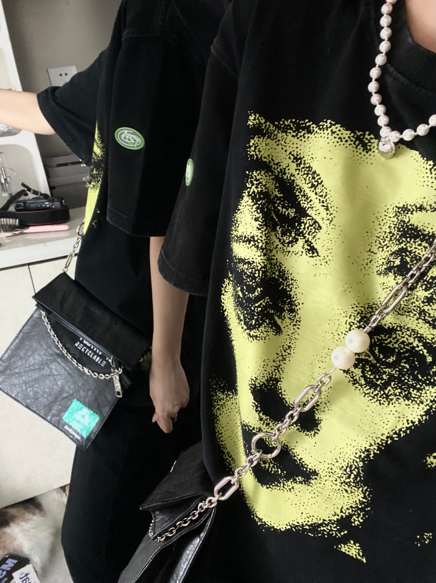这款T恤的人脸印花非常具有特色,用线条将人脸切割开来,错落放置,不走寻常路,个性十足;冰蓝色作为重要的点缀色,提亮整体色调,带来更独特的视觉效果。