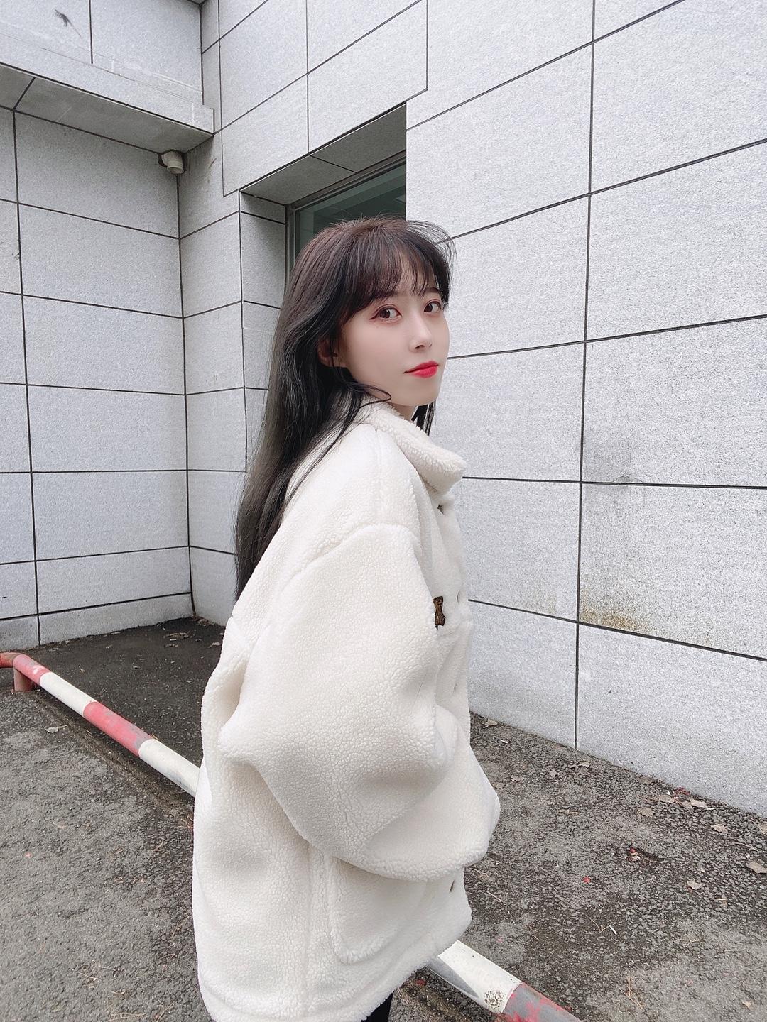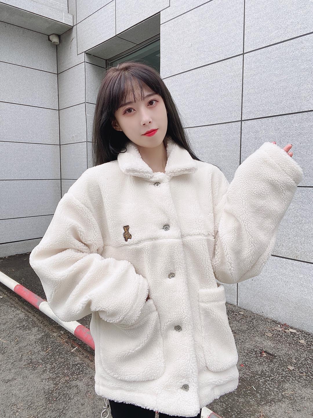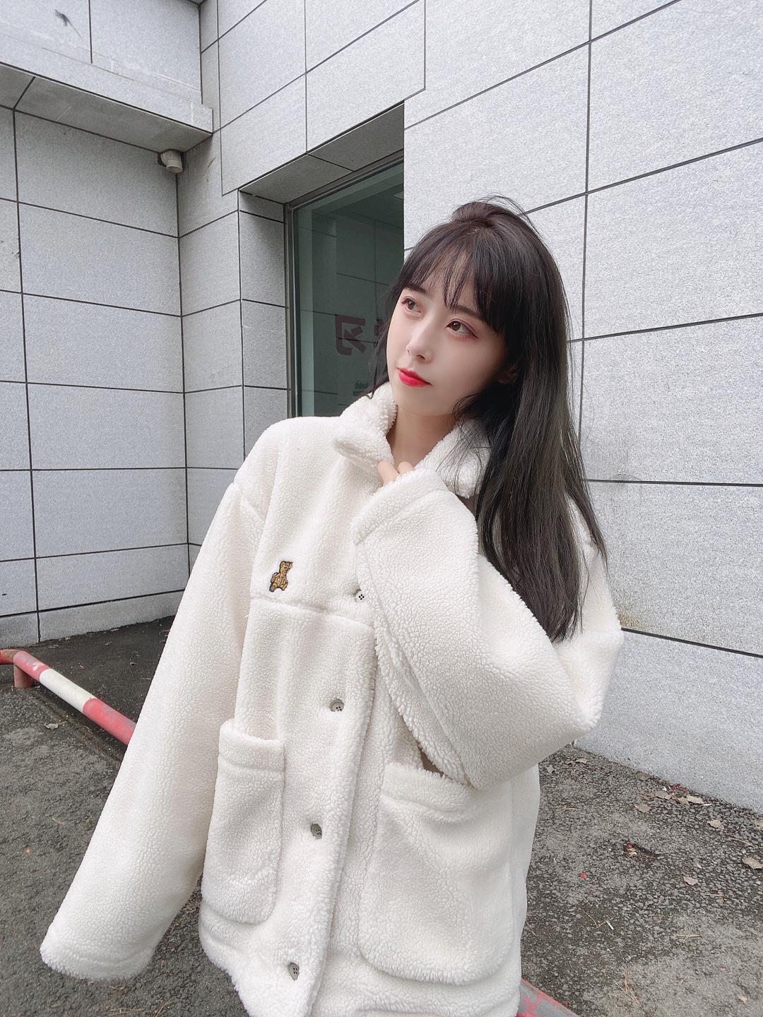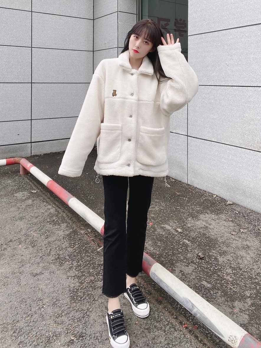 洁白保暖的羊羔毛外套采用翻领单排扣设计,增添实用大口袋。