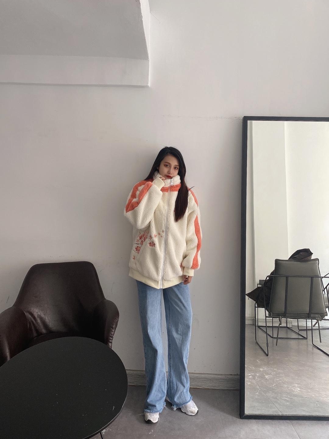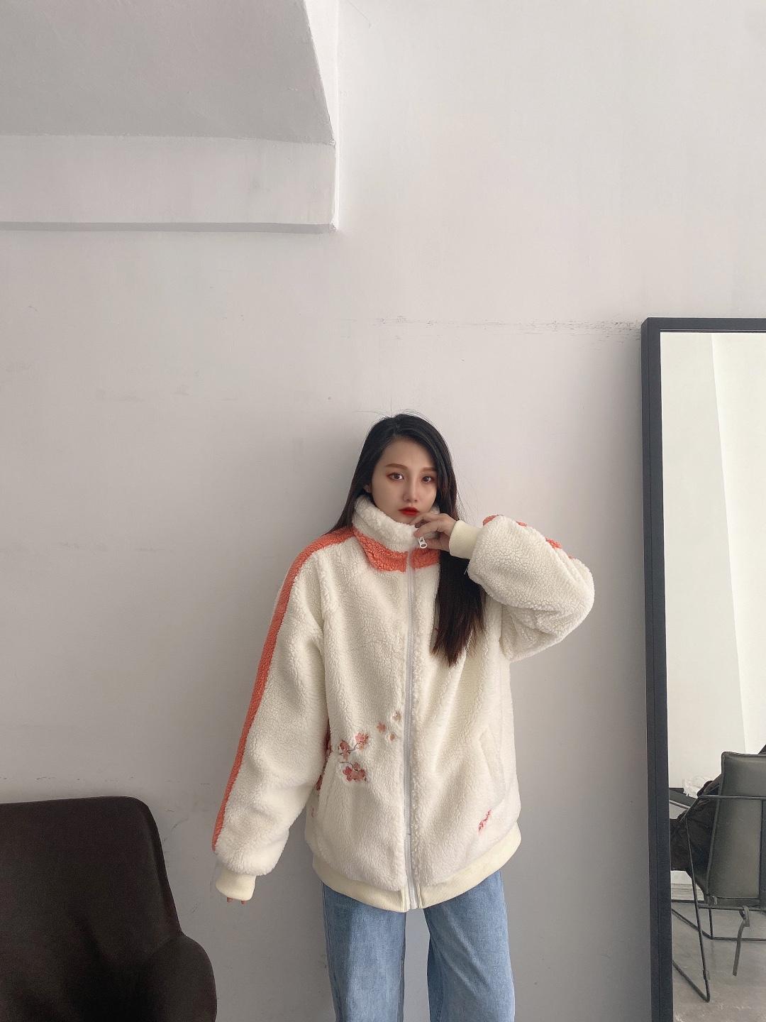 加绒的时尚大翻领设计,保暖又不失时髦的羊羔毛外套。最有小心机最与众不同的还是袖子和衣身上的拼接设计,衣服整体格调有点复古感,穿上很有韵味~设计师在毛毛的羊羔绒上添加的大大高级树脂扣非常的别致,宽松版型,设计新颖独特!