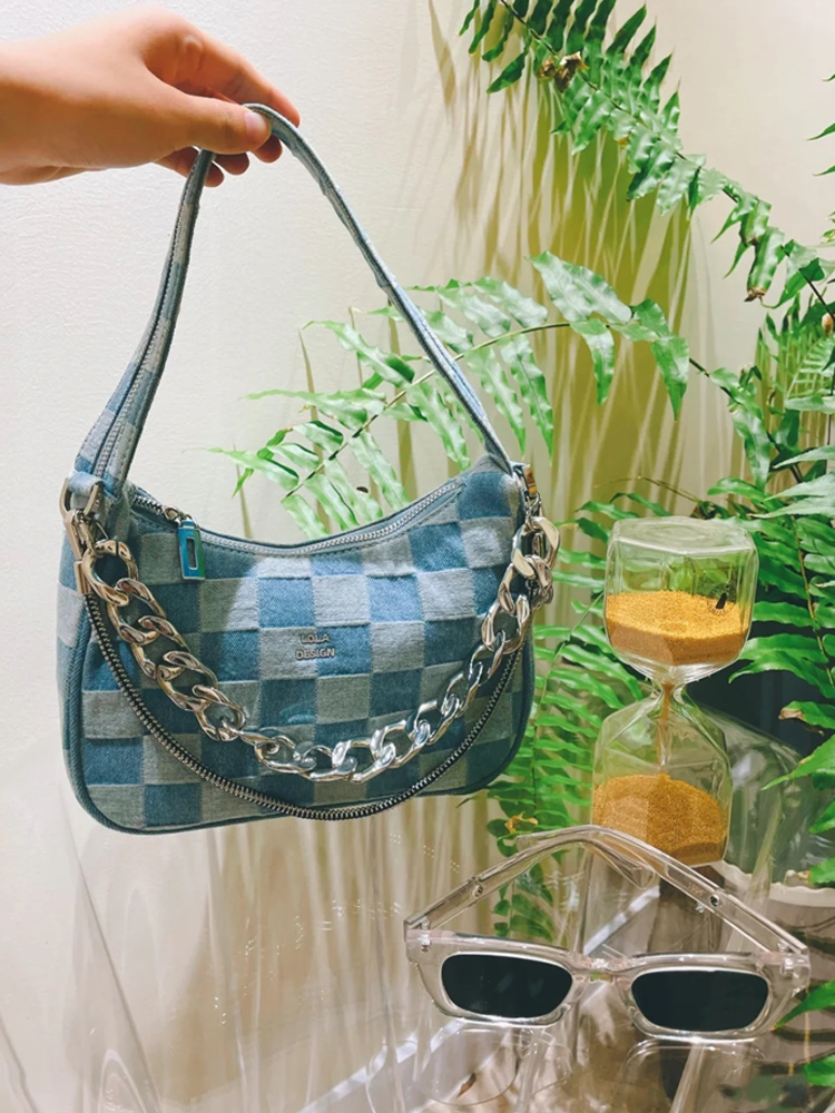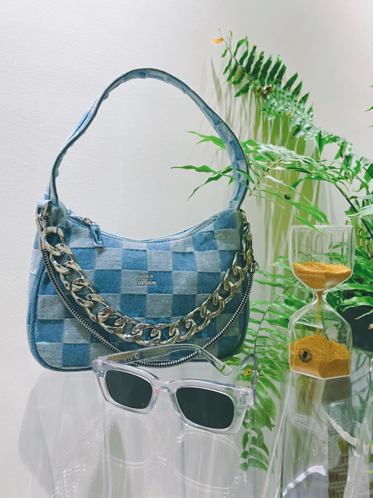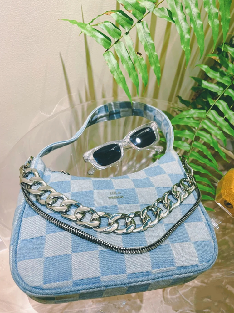 采用牛仔布料,并且搭配了棋盘格元素,让整个包体显得不平凡,彰显复古又时髦的风格,包身前面带有质感的链条作为装饰,十分有质感。