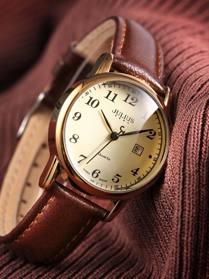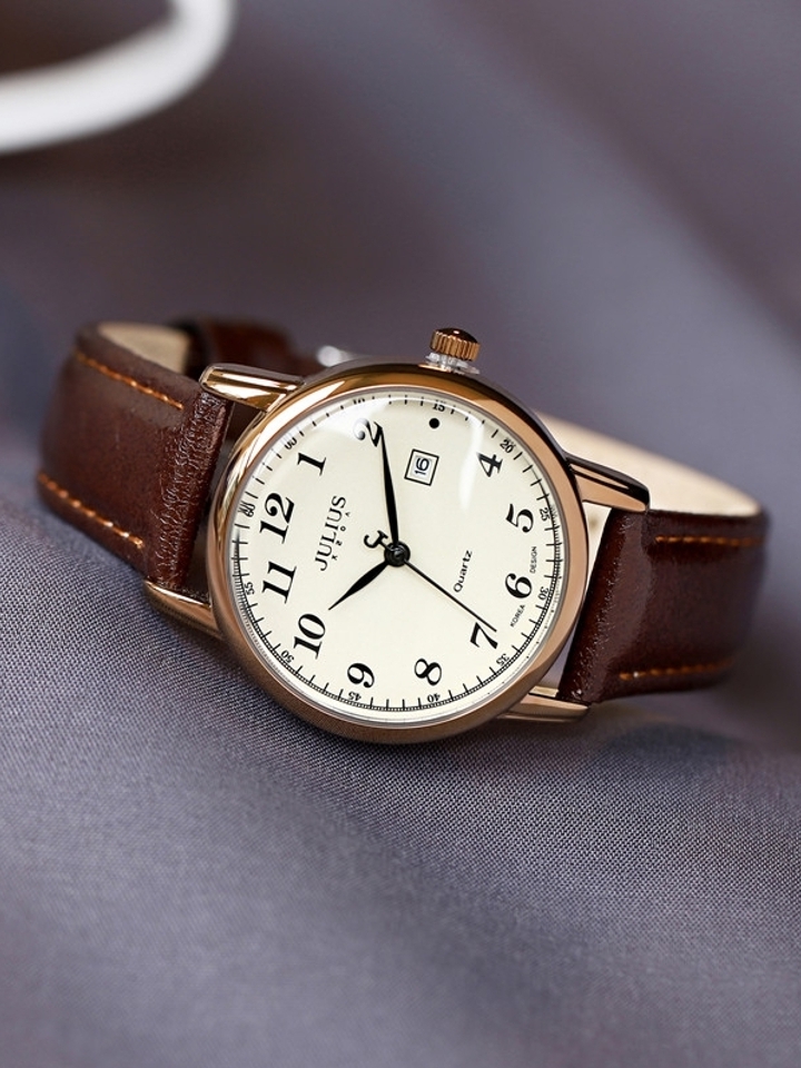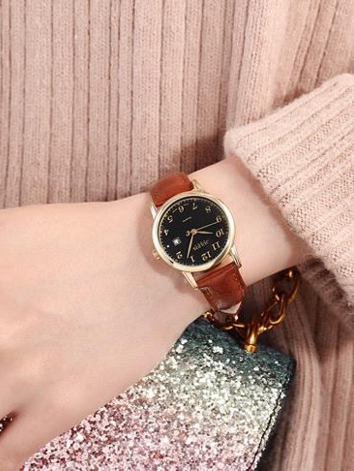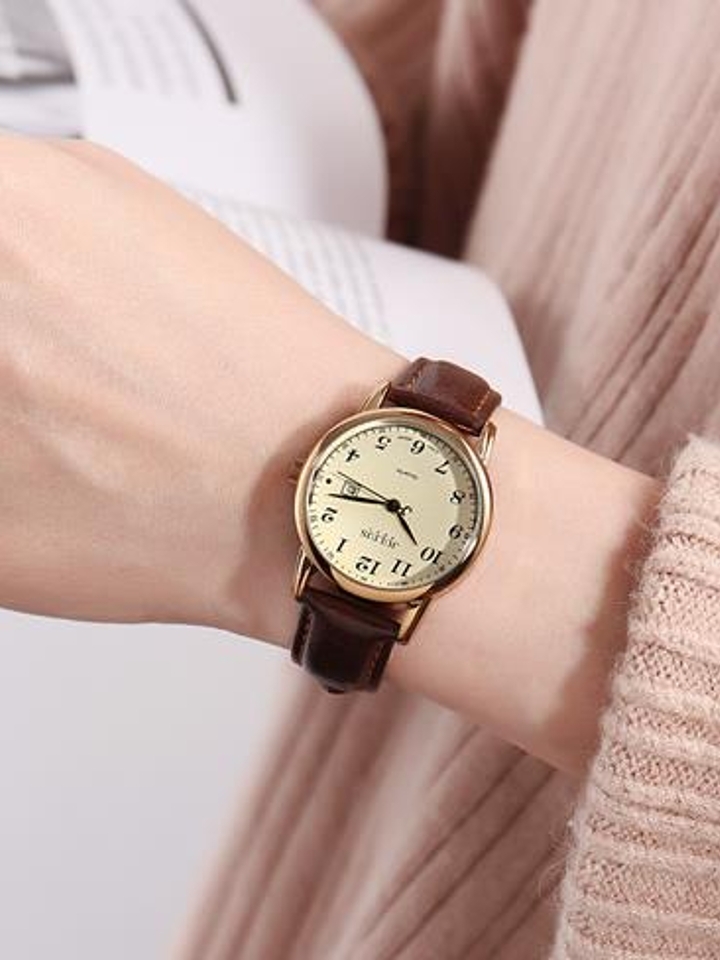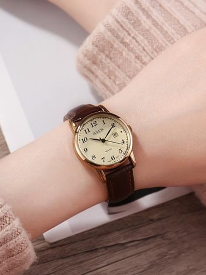 皮表带手感柔软细腻亲肤透气增加佩戴舒适度,圆形表盘简洁利落线条流畅彰显知性干练气质复古感十足,表面数字刻度简单清晰易读取,优质石英机芯走时精准品质有保障