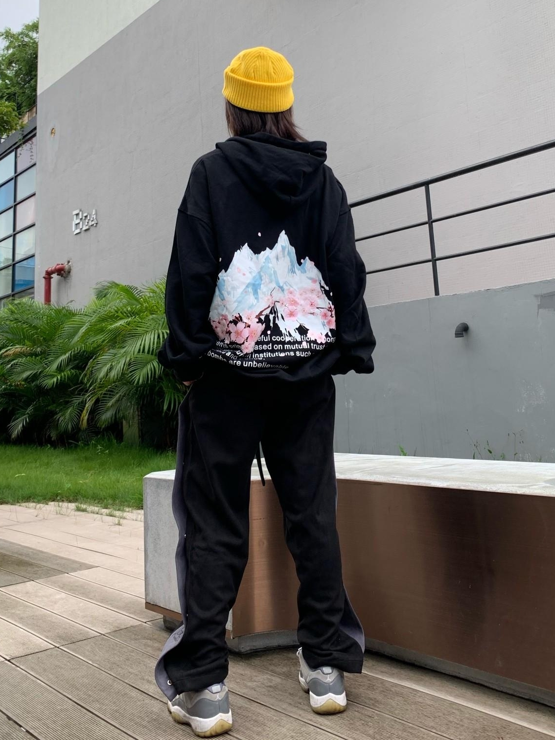 精致连帽卫衣造型设计,带着女性清新文艺的魅力范,十分个性。加上时尚雪山樱花印花的款式打造,使得整体造型感极具艺术氛围。