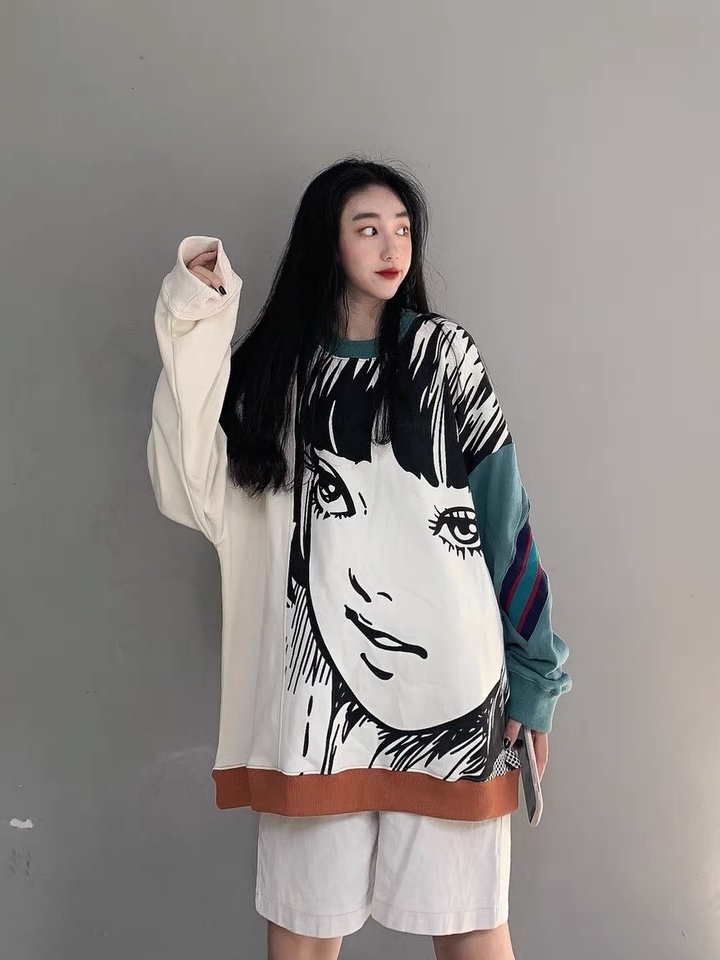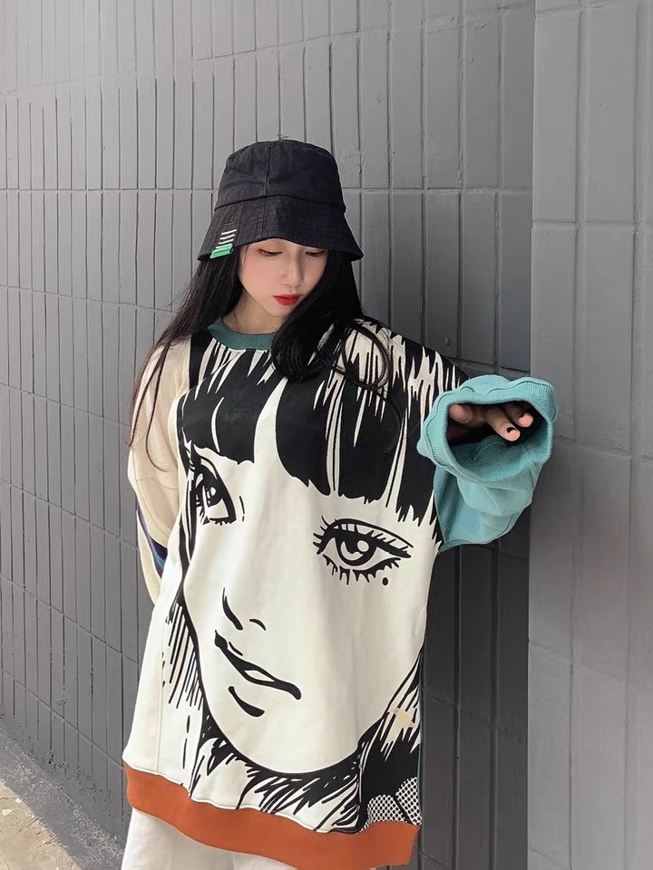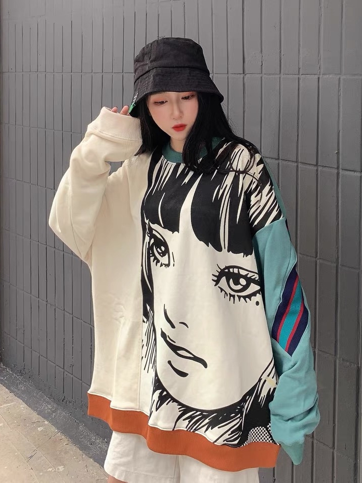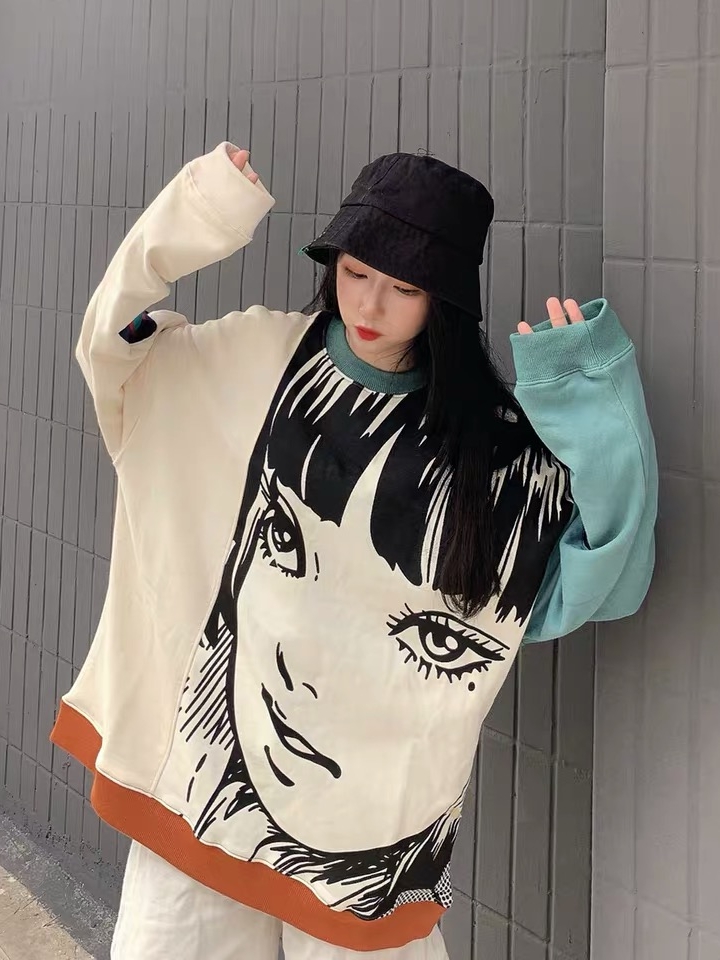 如果说这件衣服的外观亮点,那肯定就是漫画脸了,日系风十足。当然了,除了漫画脸以外,还有撞色设计,让整件卫衣都看起来与众不同了。