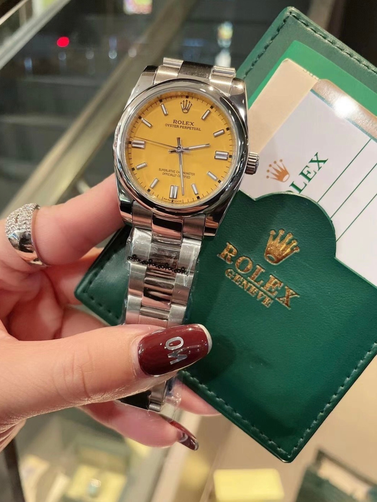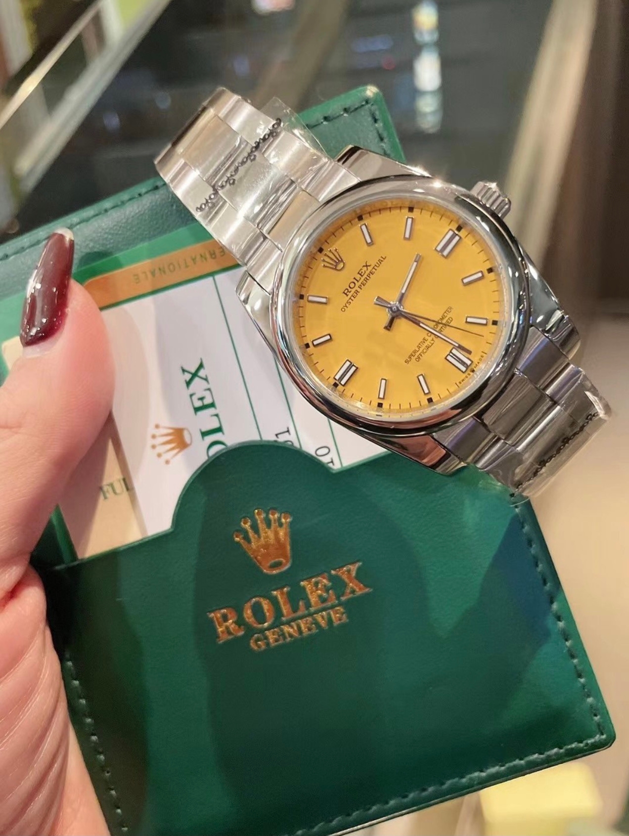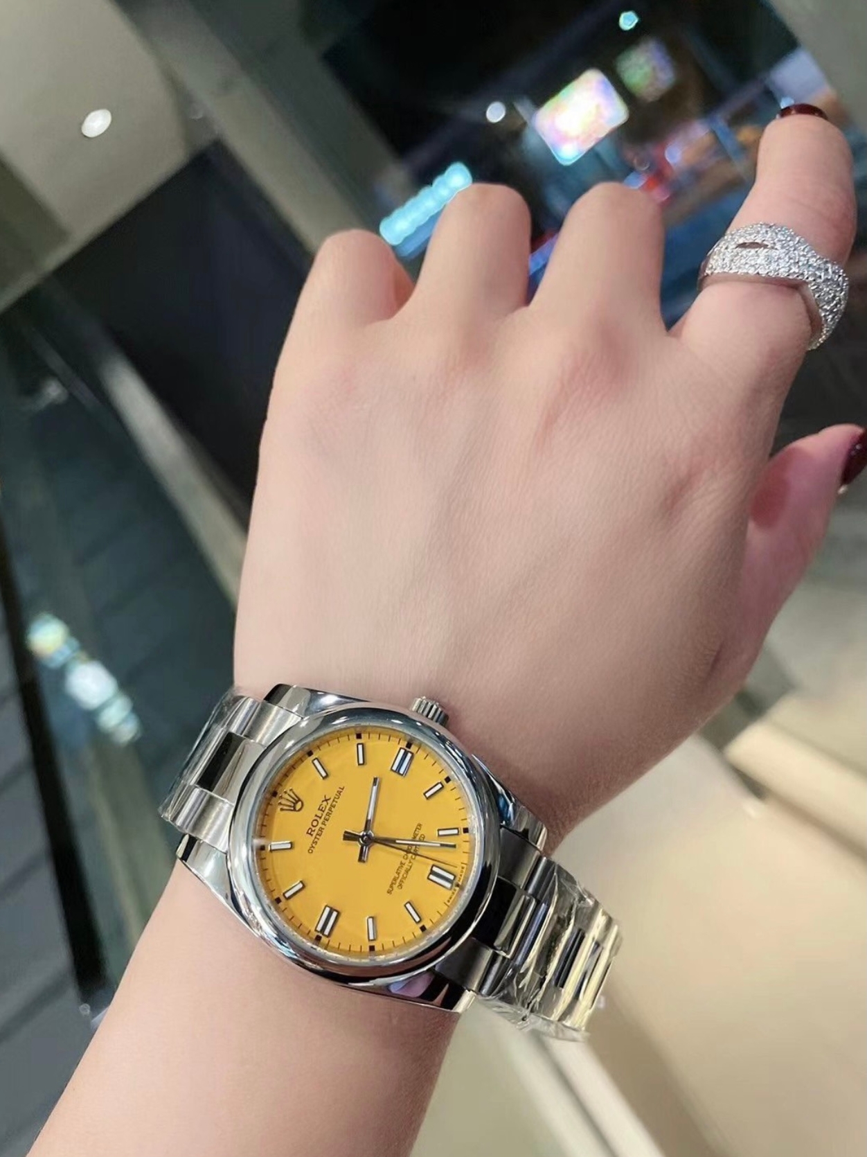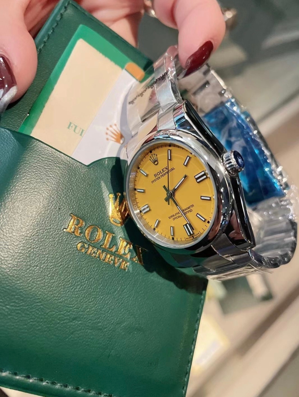 Rolex这款手表,黄色表盘看起来更加精致时尚,它的表带属于精钢材质,看起来很有时尚范儿,表扣运用了单折叠扣,佩戴起来也很方便。