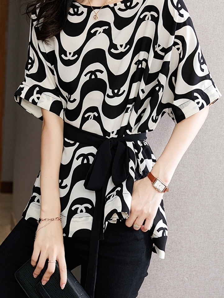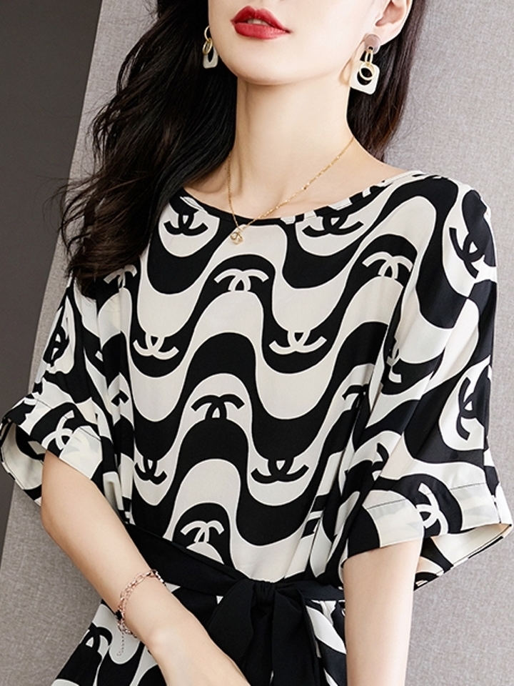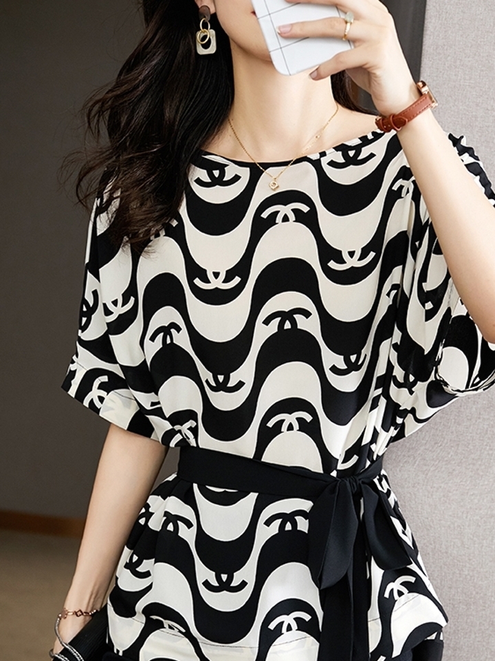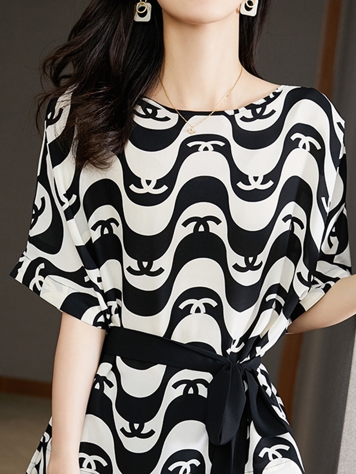 撞色印花的元素谁家,加上收腰的设计,藏肉又显瘦。