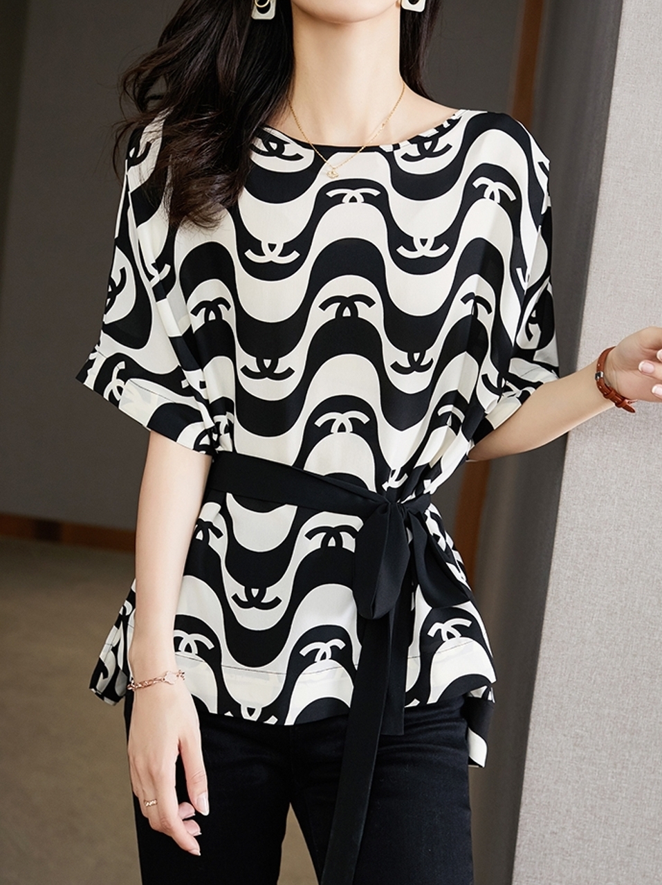时尚桑蚕丝上衣搭配休闲裤,乐福鞋,充满了年轻的活力。