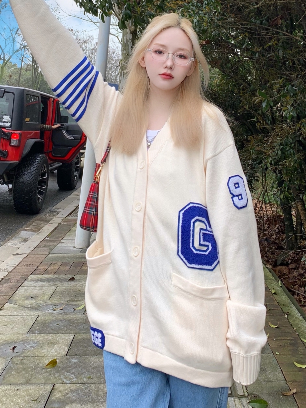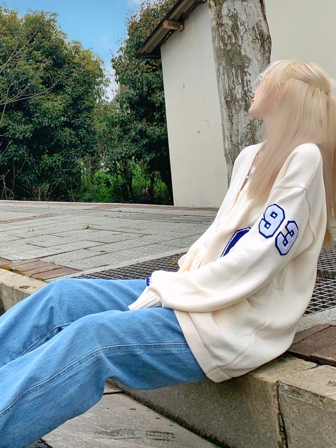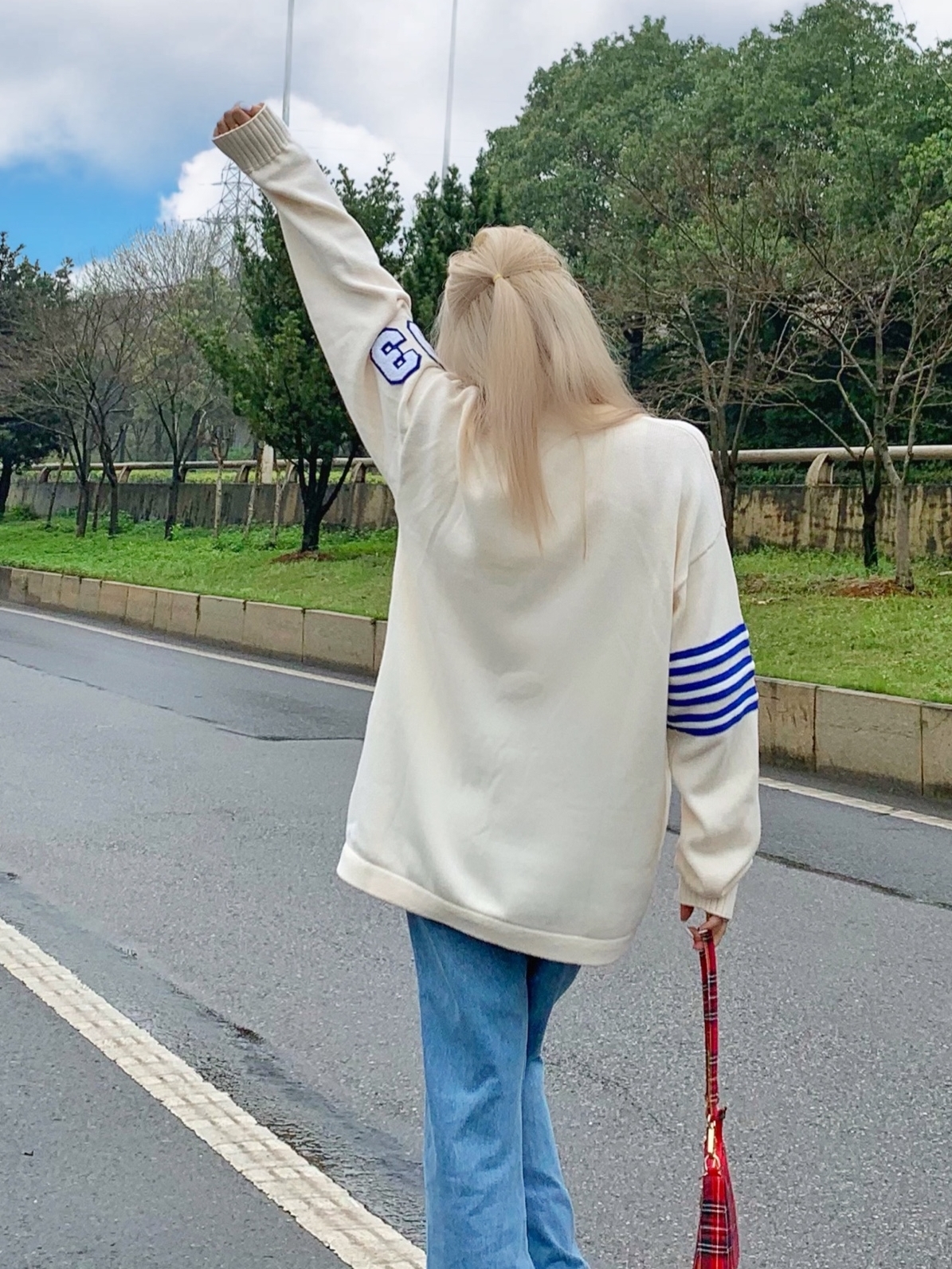 基础的针织款式上衣,领口和袖子都用了双色拼接的螺纹设计,这是今年运动风格的精髓元素,胸前还有拼布刺绣的卡通,配上靓丽的底色带来很活泼的风格。