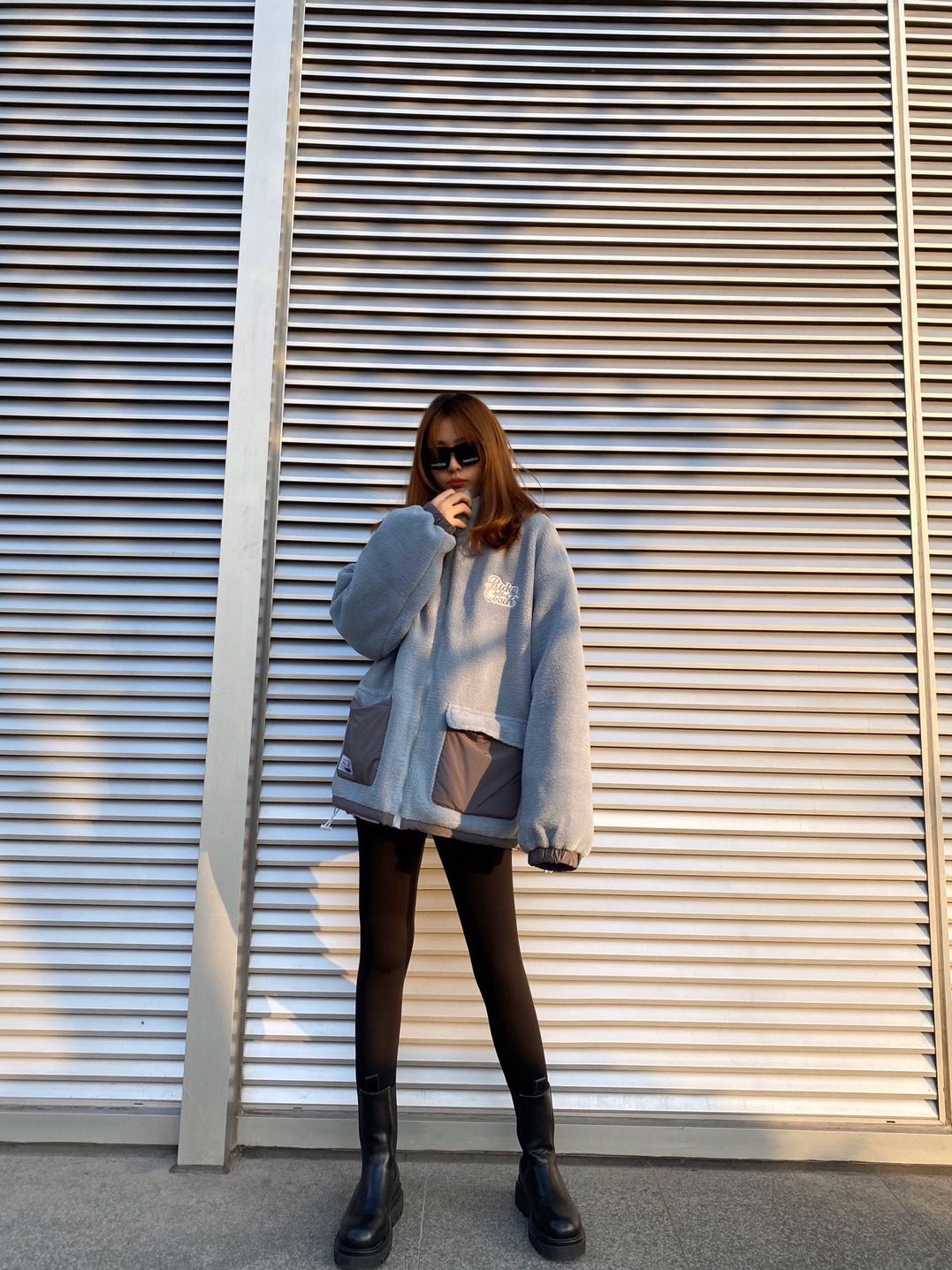 这款羊羔绒外套,搭配黑色束脚运动裤,加上运动鞋,休闲时尚范儿。