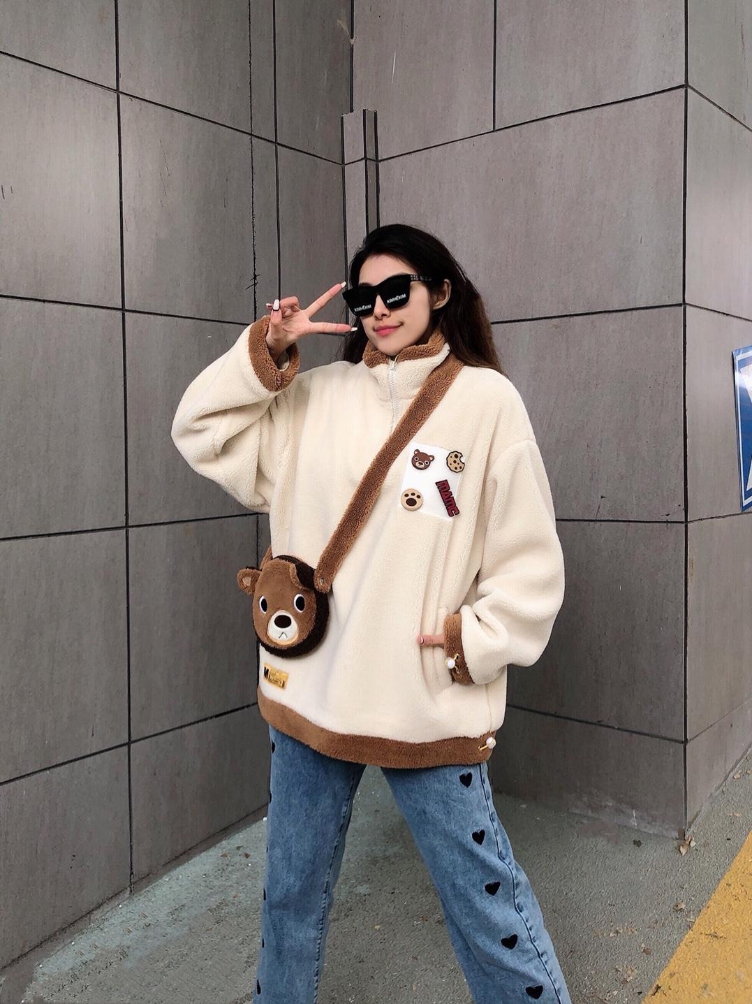 这件上衣选择蓬松柔软的羊羔绒材质进行打造,自带一种萌感趣味呢。辅以棕米拼接色调交织出文艺复古feel。
