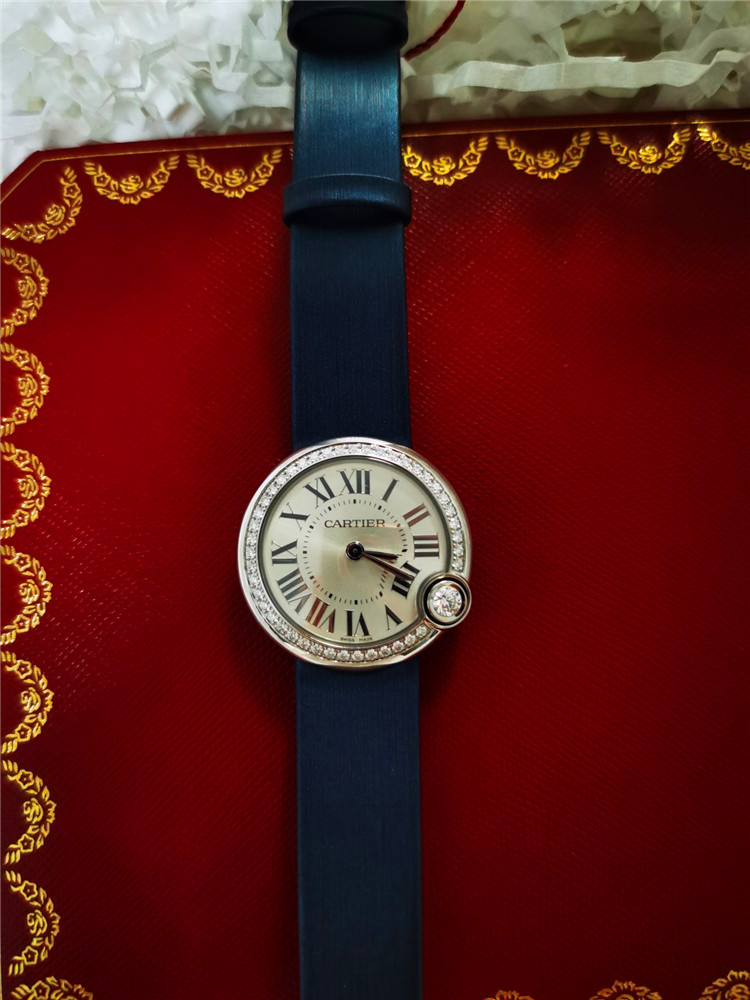 这款白气球系列腕表上镶嵌的钻石太闪耀了,一闪一闪的,太吸睛了;蓝色缎面质感的小牛皮表带搭配银色的表盘,尽显奢华与气质。