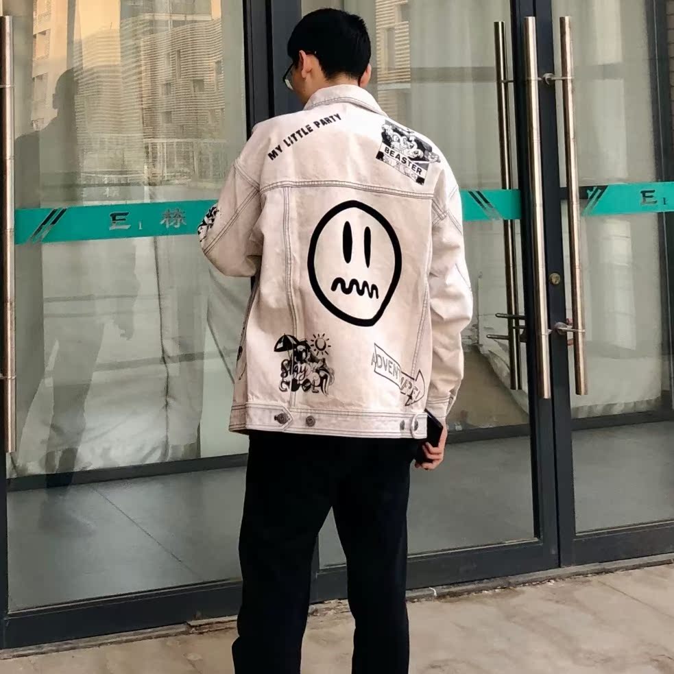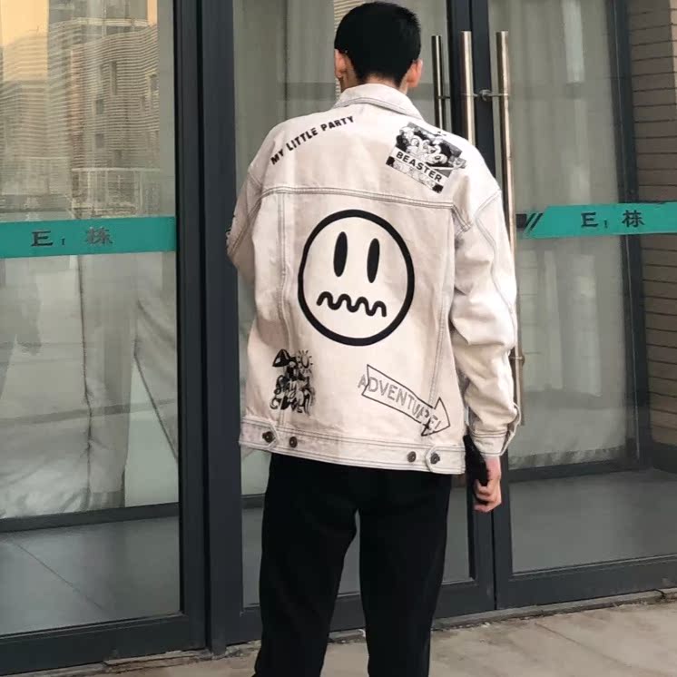 外套整体是宽松风格,整体的白色加上黑色的卡通涂鸦,显得很有活力,里面可以搭配一个带帽子的简约黑色卫衣,与外套整体形成撞色搭配,或者搭配深色的裤子都是不错的选择。