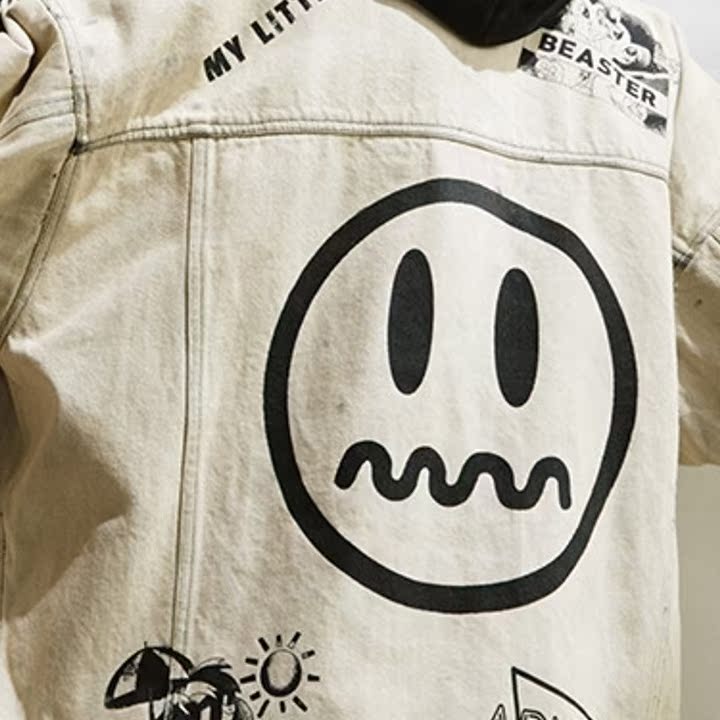 这是一款BEASTER 联名小马宝莉的漫画涂鸦牛仔外套,外套后面依旧是BEASTER经典的鬼脸标志,十分的亮眼,而衣服上各处都有漫画涂鸦满满的街头风,让你马上与众不同。