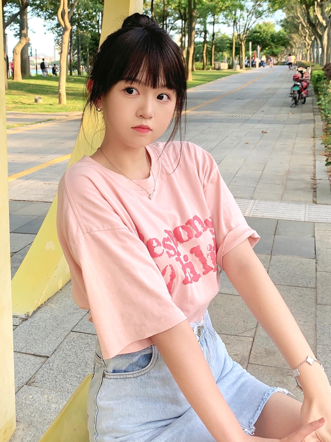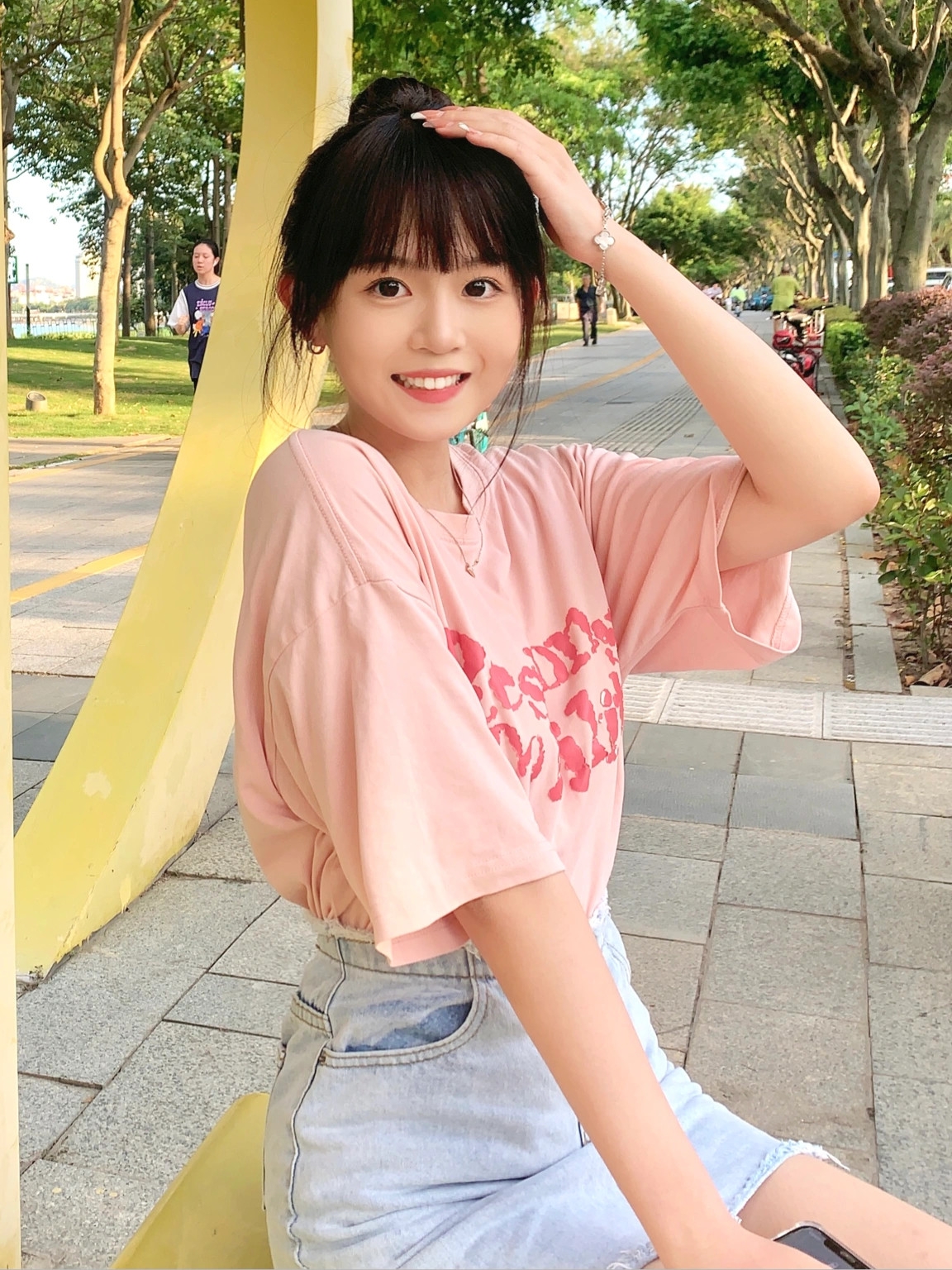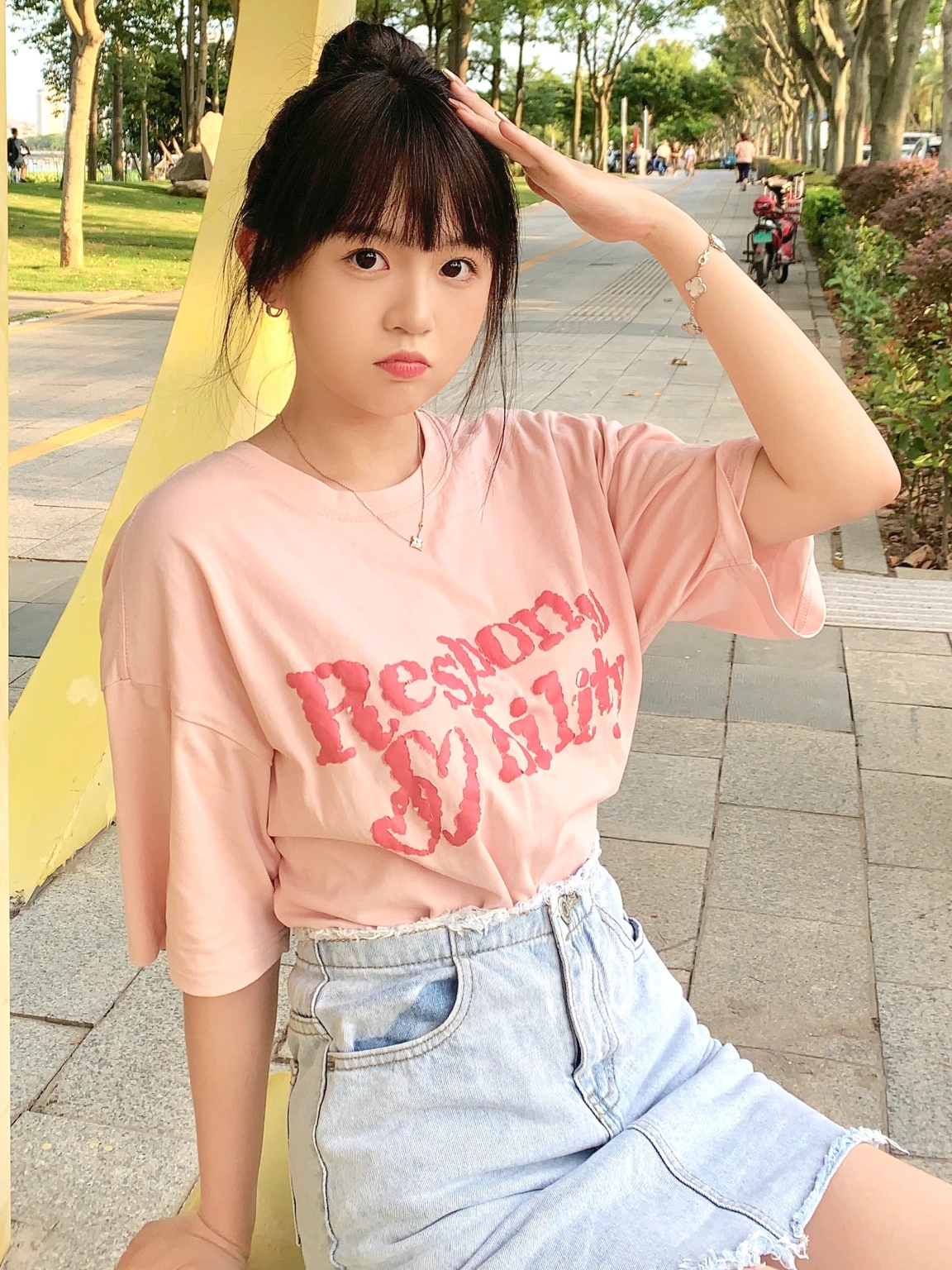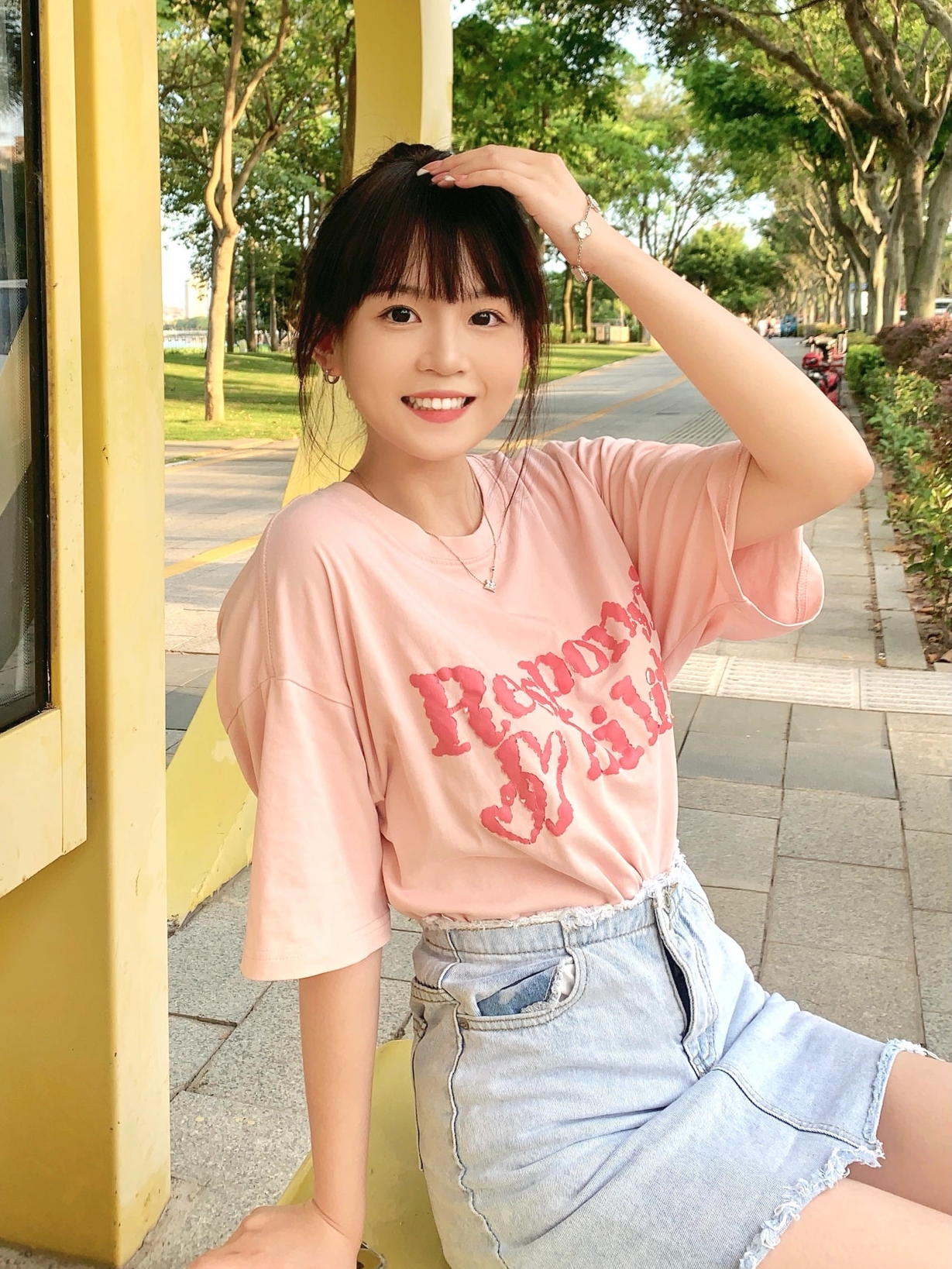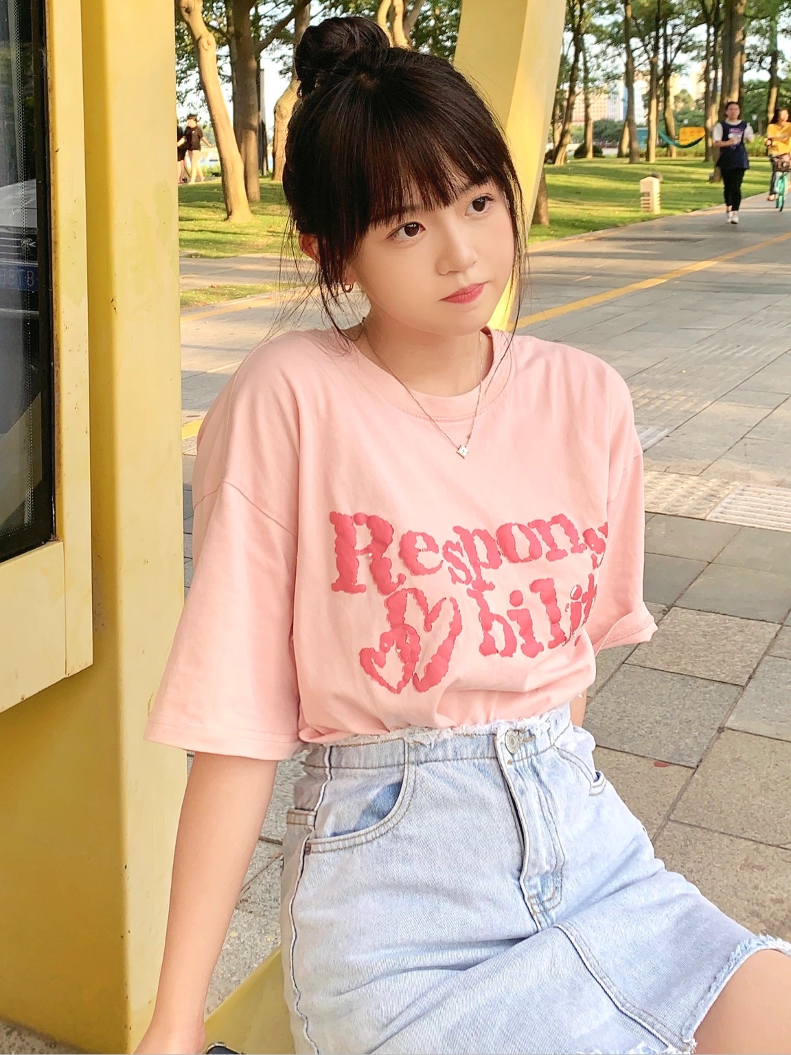 这家衣服搭配一条浅色牛仔短裙,扎一个丸子头,简直青春活力感满满。宽松的版型遮肉显瘦,圆领的设计很显脸小。