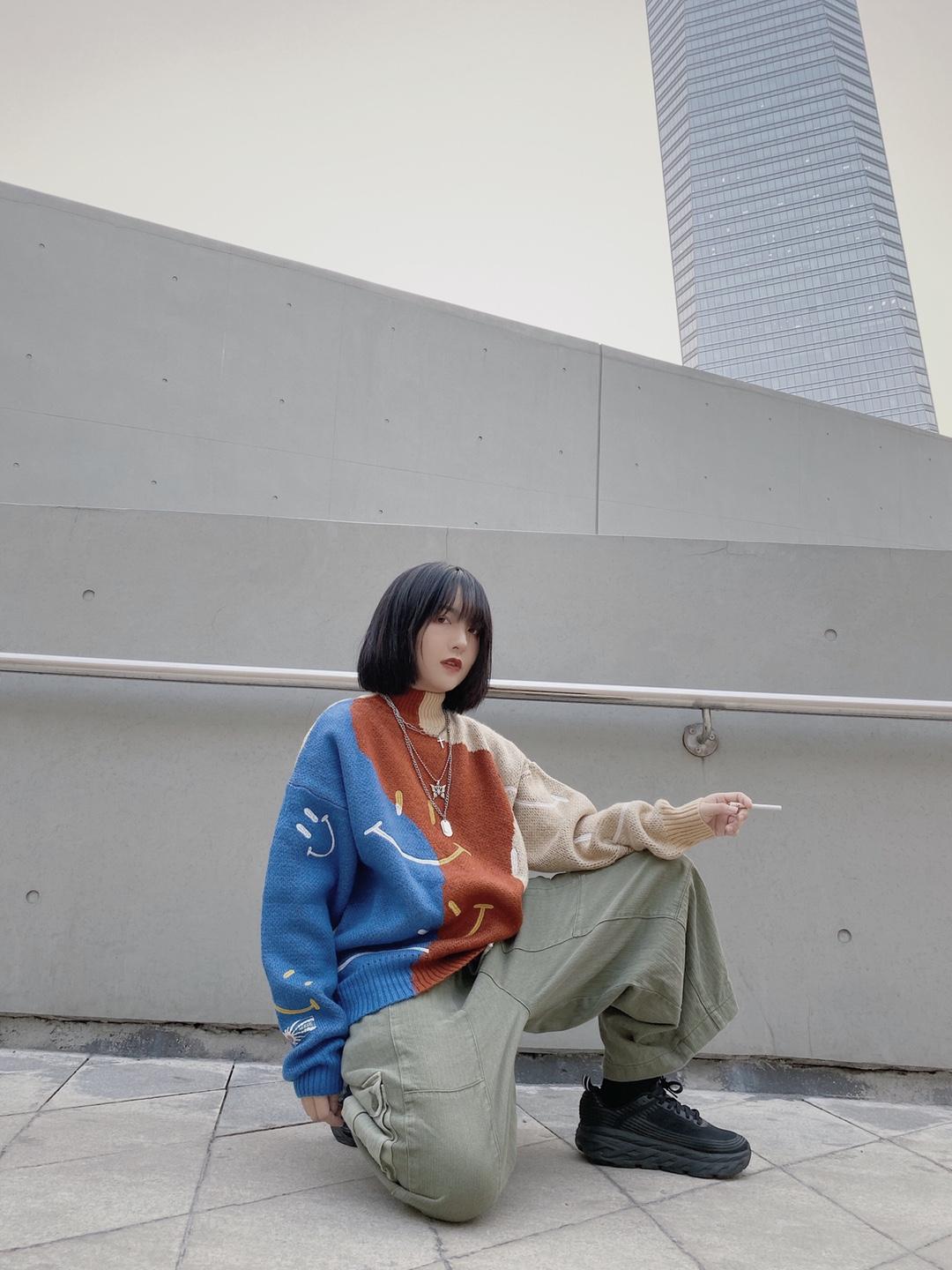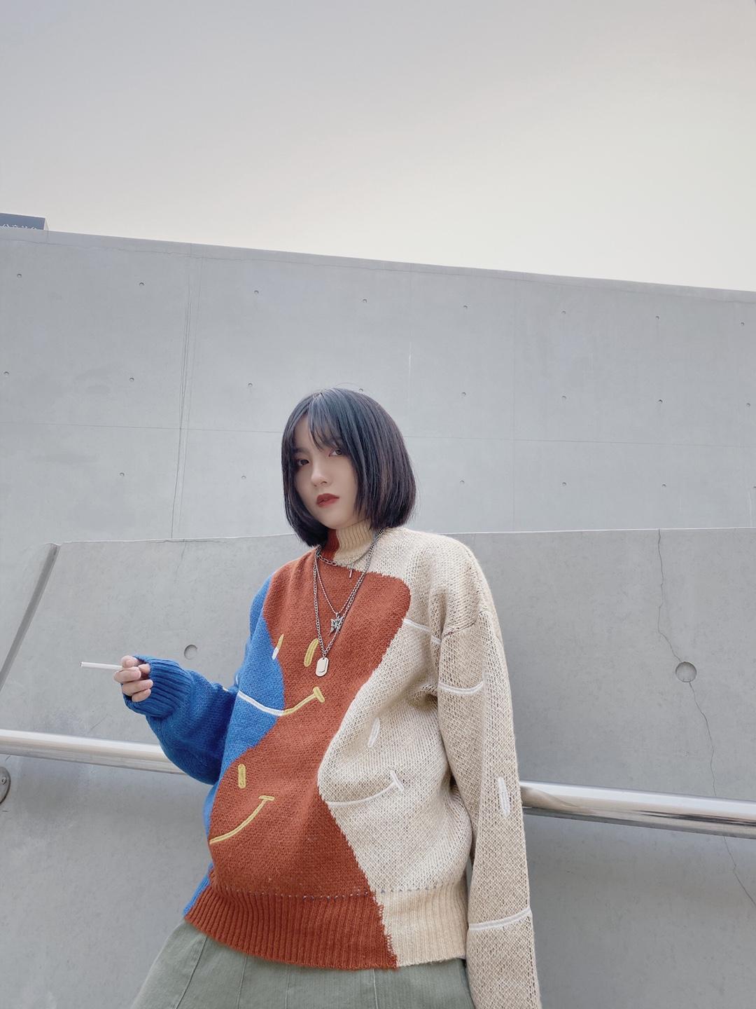 这款针织衫选用了中长款版式设计,更具时尚潮流,采用了经典的圆领设计,简单而易穿脱,前幅将大笑脸图案与英文元素完美融合,设计感十足。