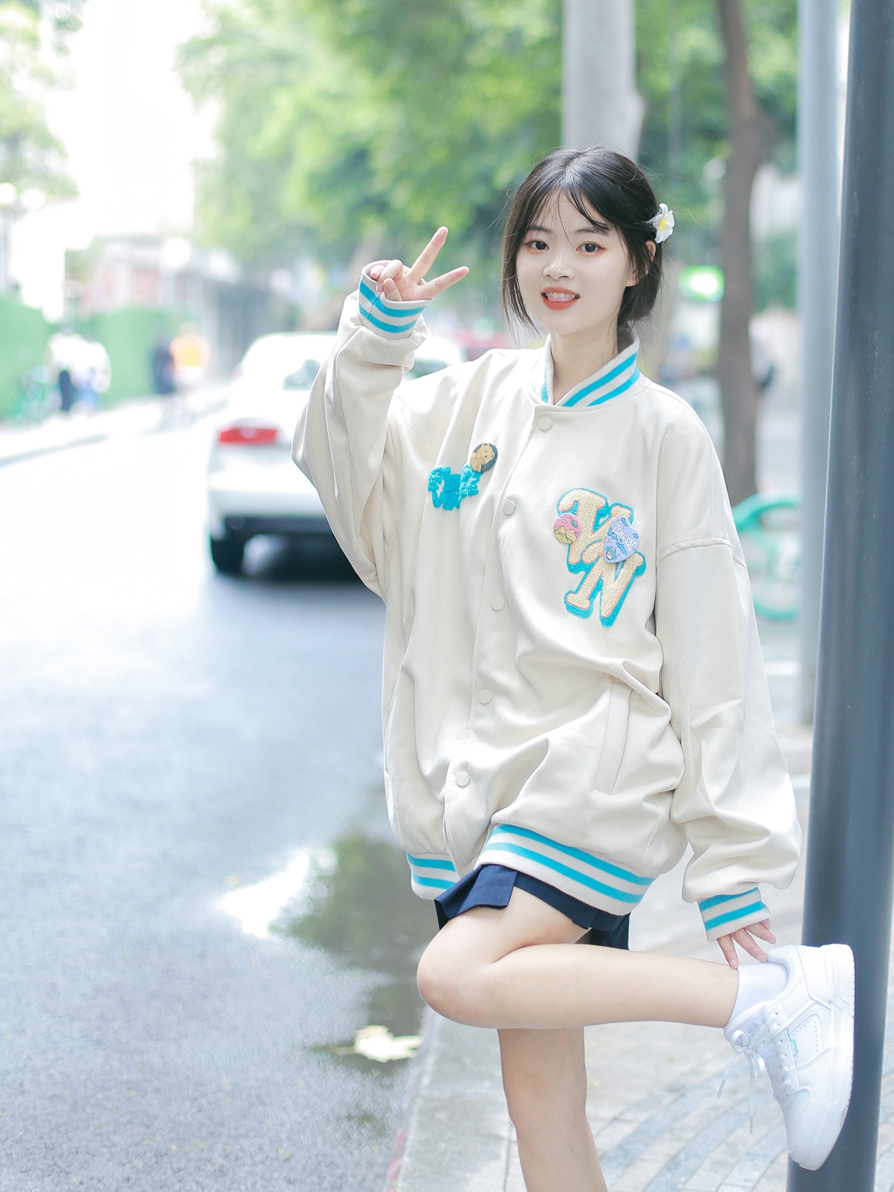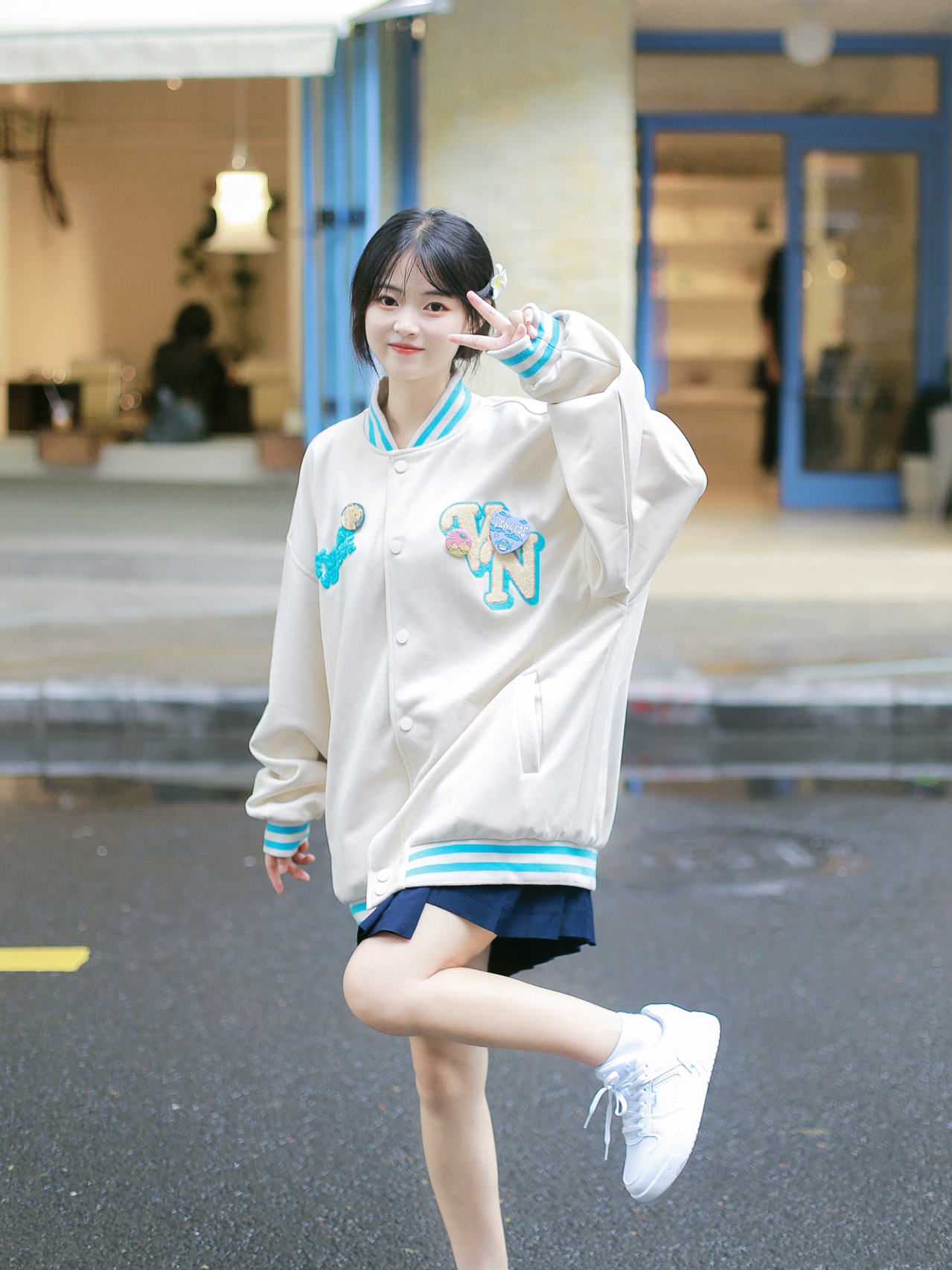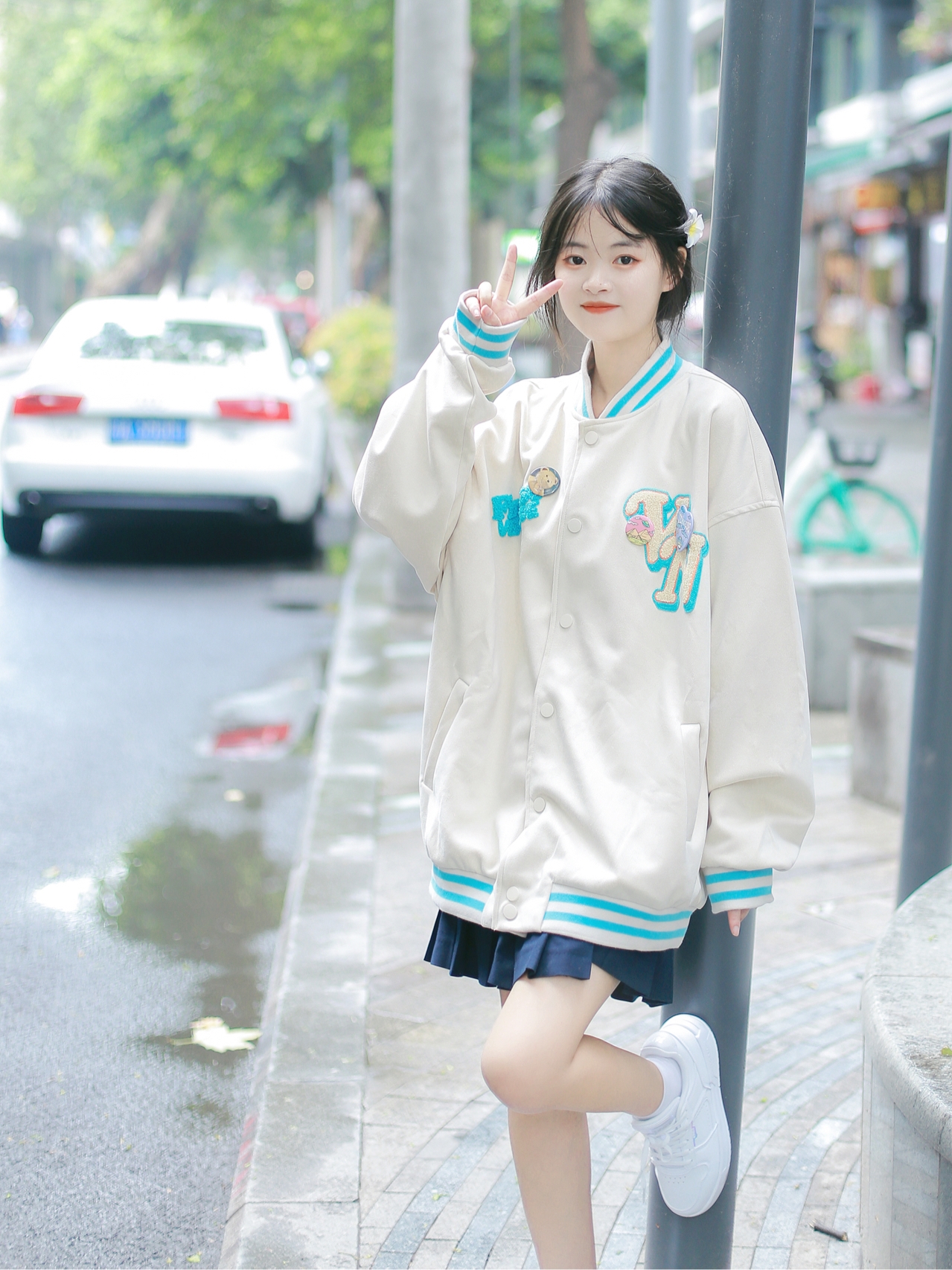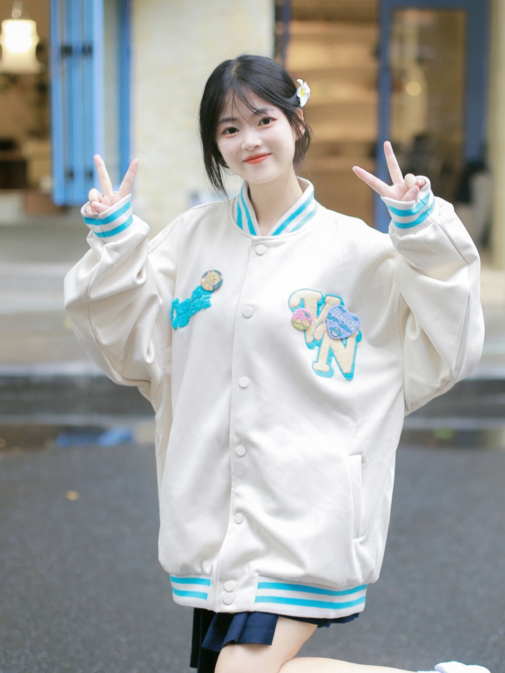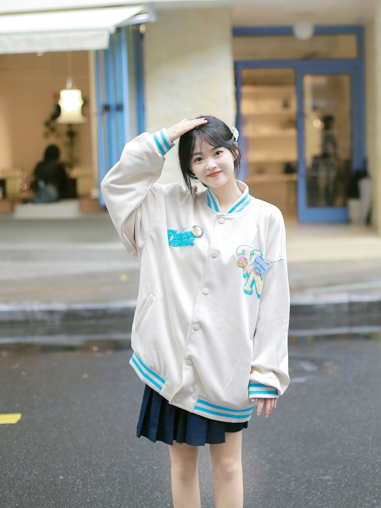 所以秋天的第一件外套额度就给棒球服啦,这件浅色系的棒球服很可爱呀。