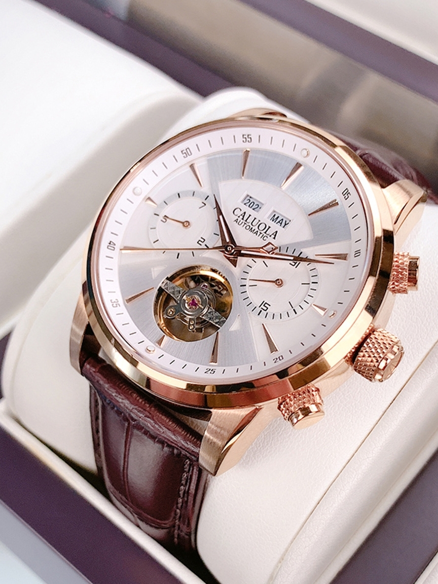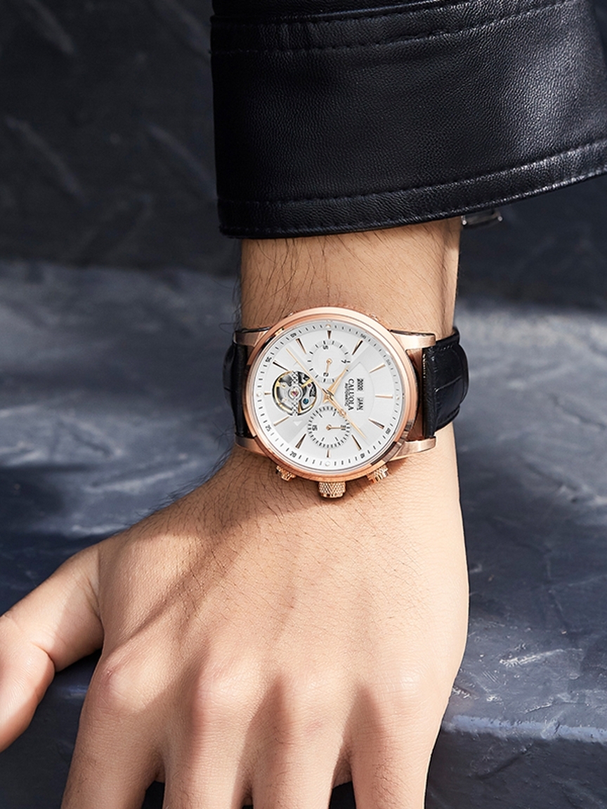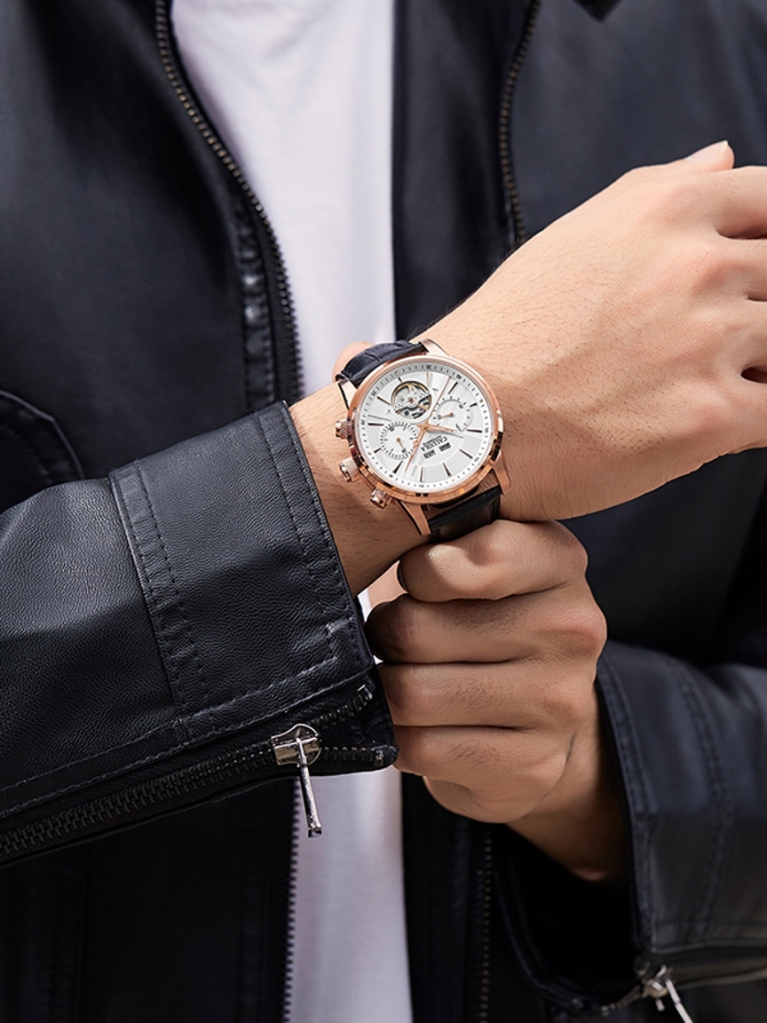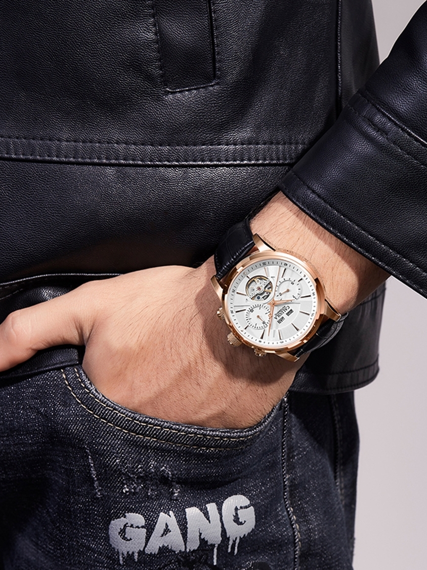 此款手表由进口蓝宝石作为镜面,防滑耐刮花;时尚的表带,衬托出你的高贵人生;独特的酒桶型表盘形状设计,在夏日散发出成熟男士的魅力。时尚大表盘,结合镂空飞轮透视窗,可见内部机械运转,生生不息。日月星期贴心小秒盘设计,轻松掌握时间,表冠采用三层玫瑰金电镀,长久保色奢华质感,质感的牛皮表带,贴合手腕佩戴更舒适。