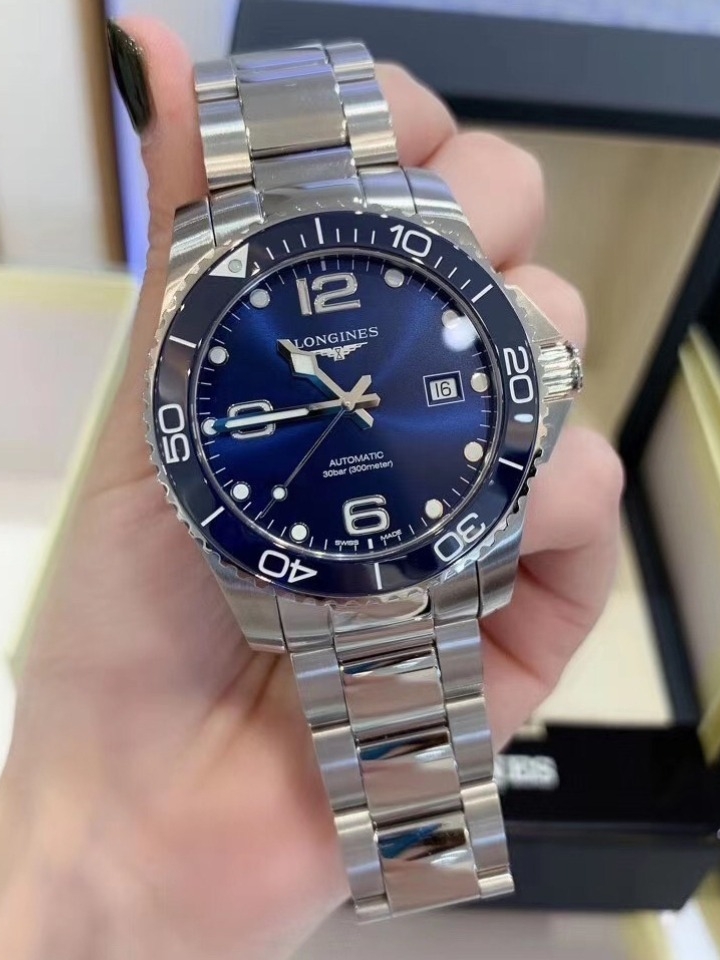 浪琴新款蓝盘康卡斯陶瓷表圈 64小时动力储存,双折式安全表扣,带潜水延展装置,不锈钢蓝色太阳纹表盘,镶嵌阿位伯数字和时标,镀银抛光指针,防水。