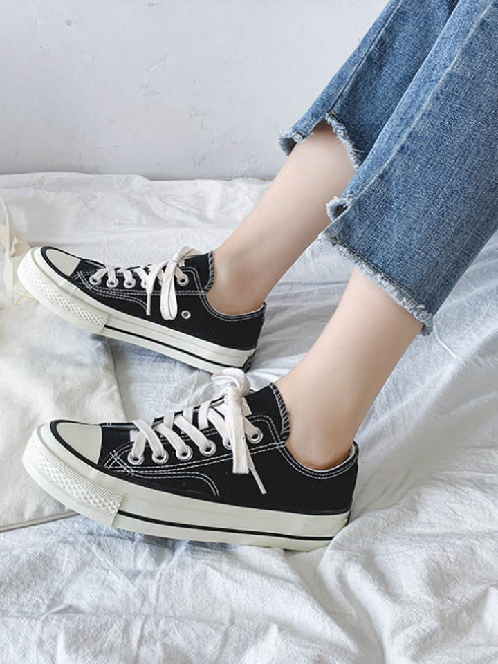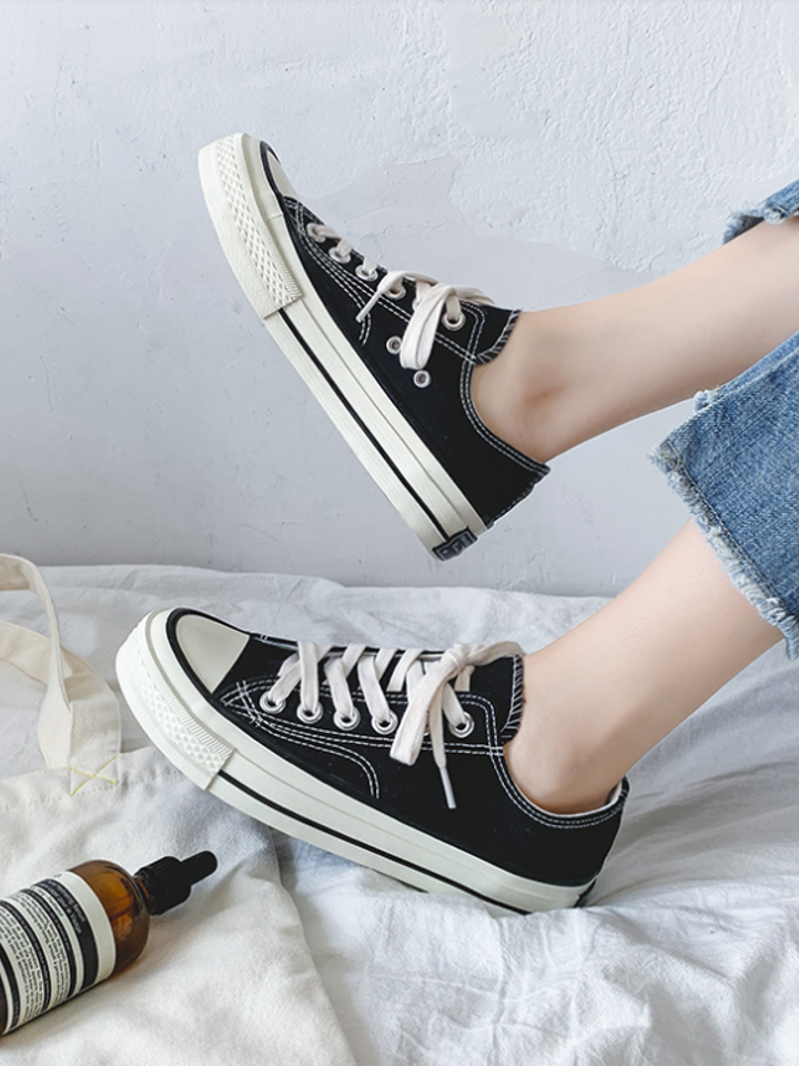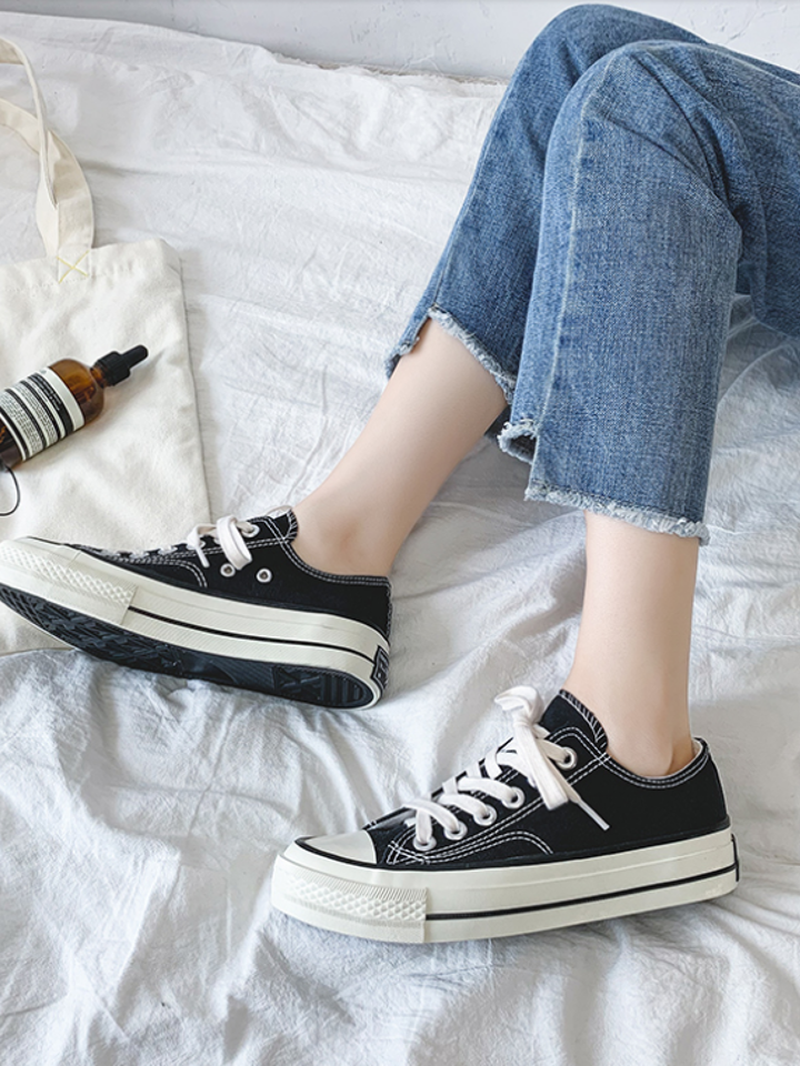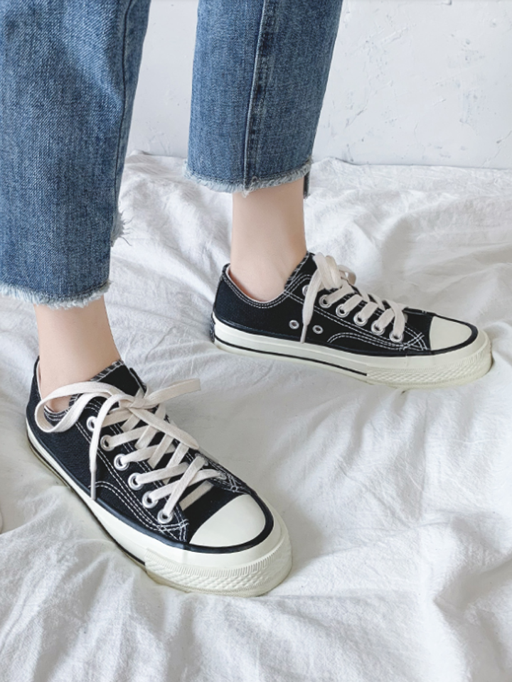 这款匡威常青款低帮帆布鞋,纯色系带鞋面简约大方优雅复古文艺风满满休闲时髦各种穿搭都好看,经典平底的设计更能显休闲。