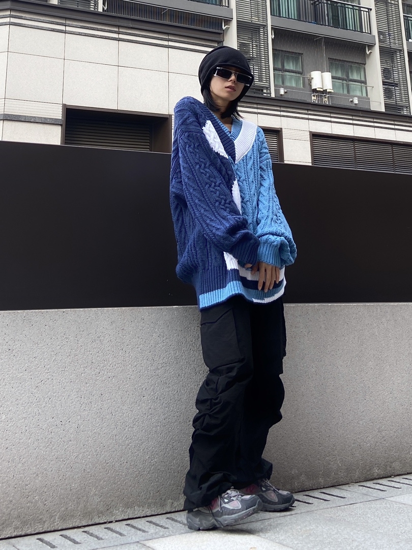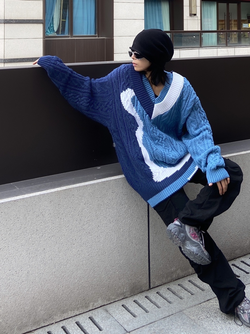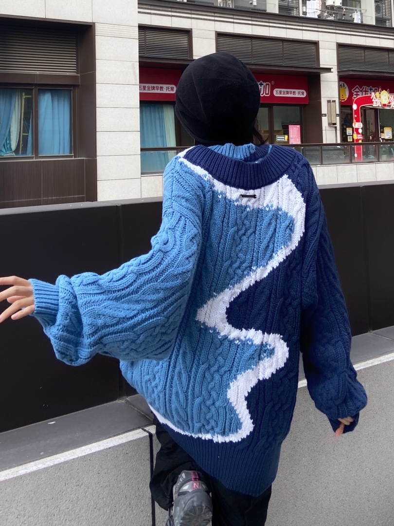 多种层次感的针织编织手艺的组合,上层肩部的不规则撞色的提花设计,中层的立体麻花的设计,下层的波点构成波浪形线条撞色印花,凸显出强烈的视觉层次感,十分有个性。
