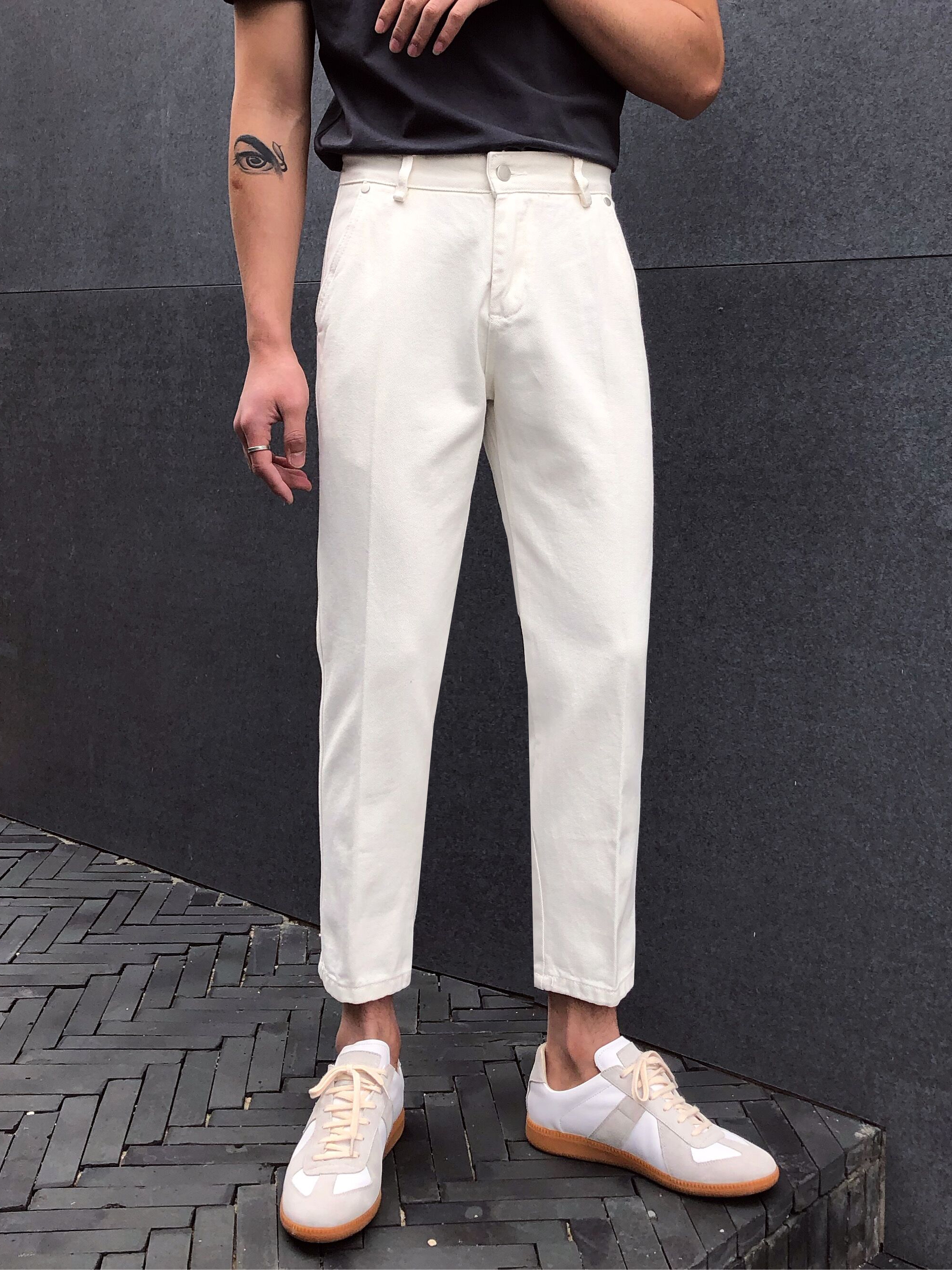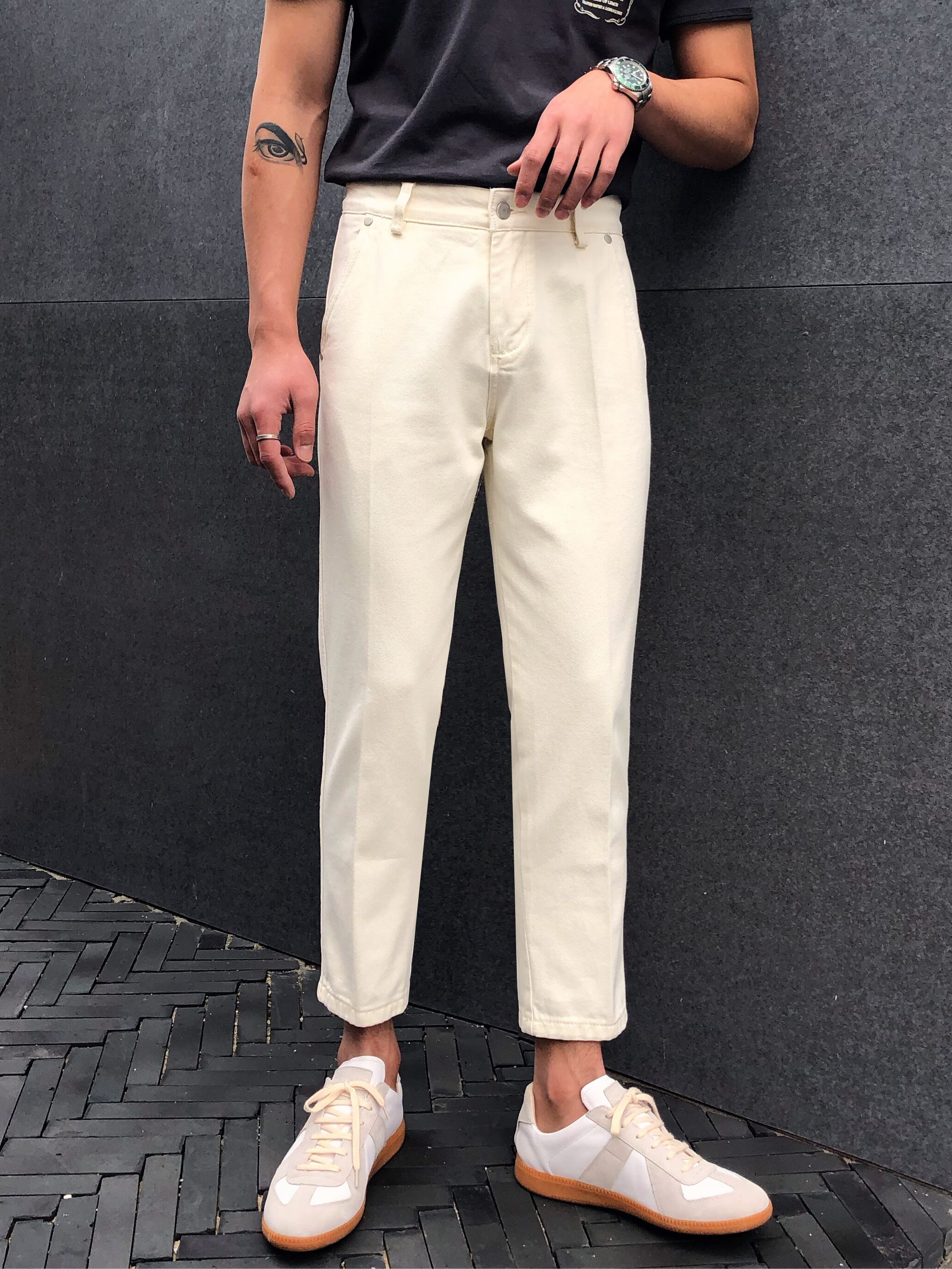 贴合身形中高腰,设有腰袢,束腰塑形。简洁有型的斜插口袋,有撞色车线点缀。前襟拉链加一粒扣,它穿脱起来又方便。对称的盾型口袋,增添了层次感和亮点。层次不齐的毛边裤脚,显得街头范十足。