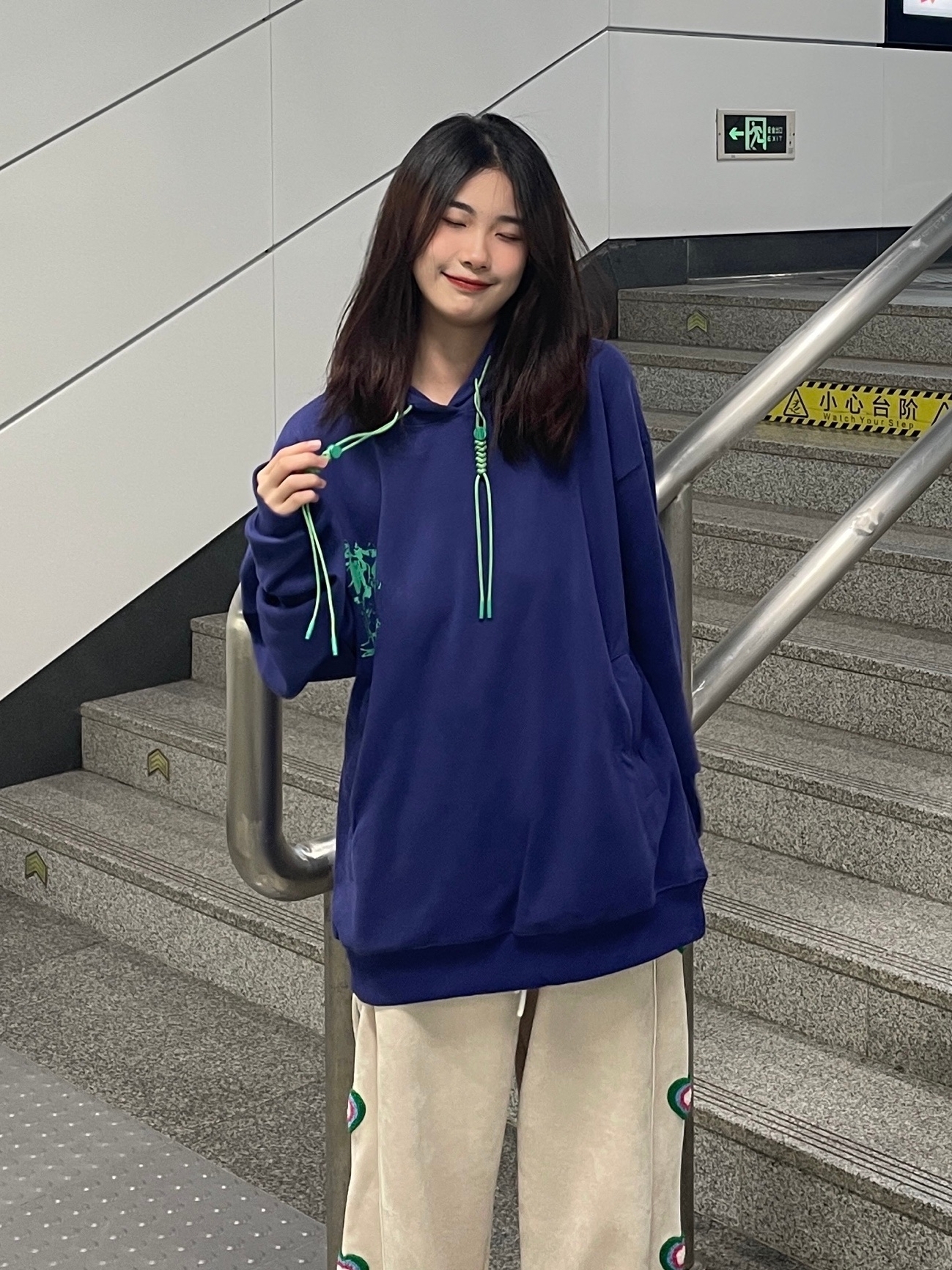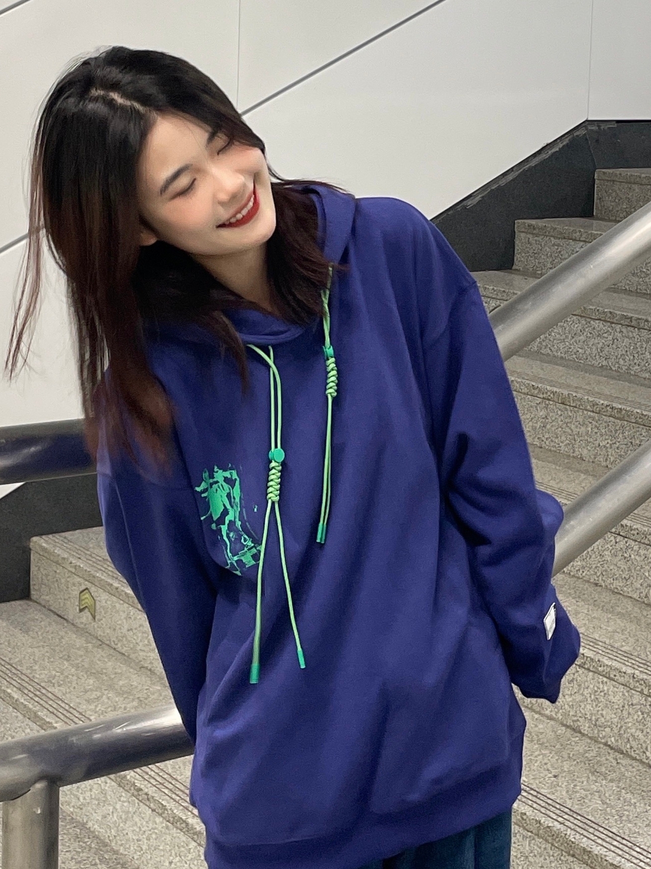 黑暗系的少女风免不了有趣的造型,宽松的连帽卫衣总是有些小颓废的感觉,立体的小恶魔角造型在趣味中有不少的减龄效果,背后翅膀和尾巴的刺绣图案用更加精致的细节体现更多趣味,作为秋冬的外搭很不错。