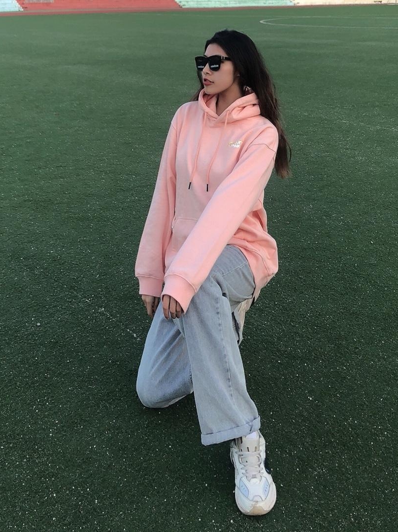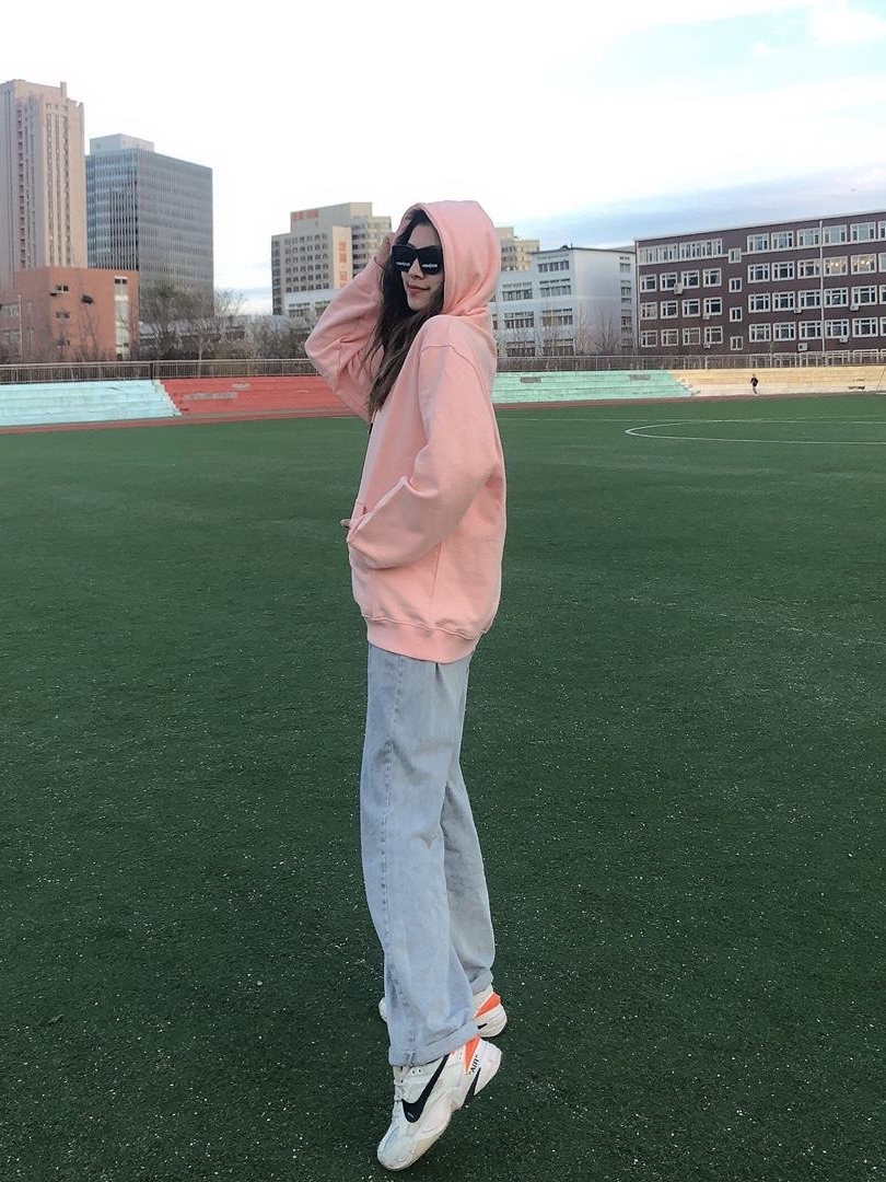 这款连帽卫衣,搭配米色休闲裤和运动鞋,时尚运动范儿十足。