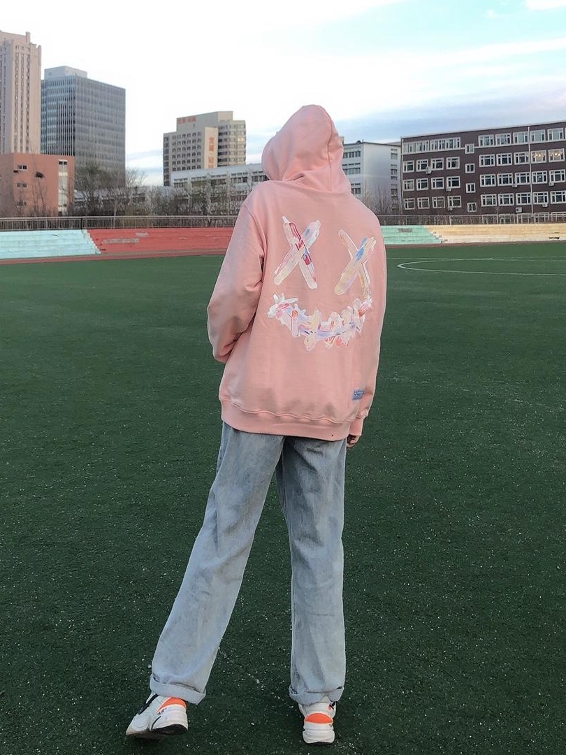 这款很休闲的连帽卫衣,油画撕裂笑脸图案,简约不失个性。